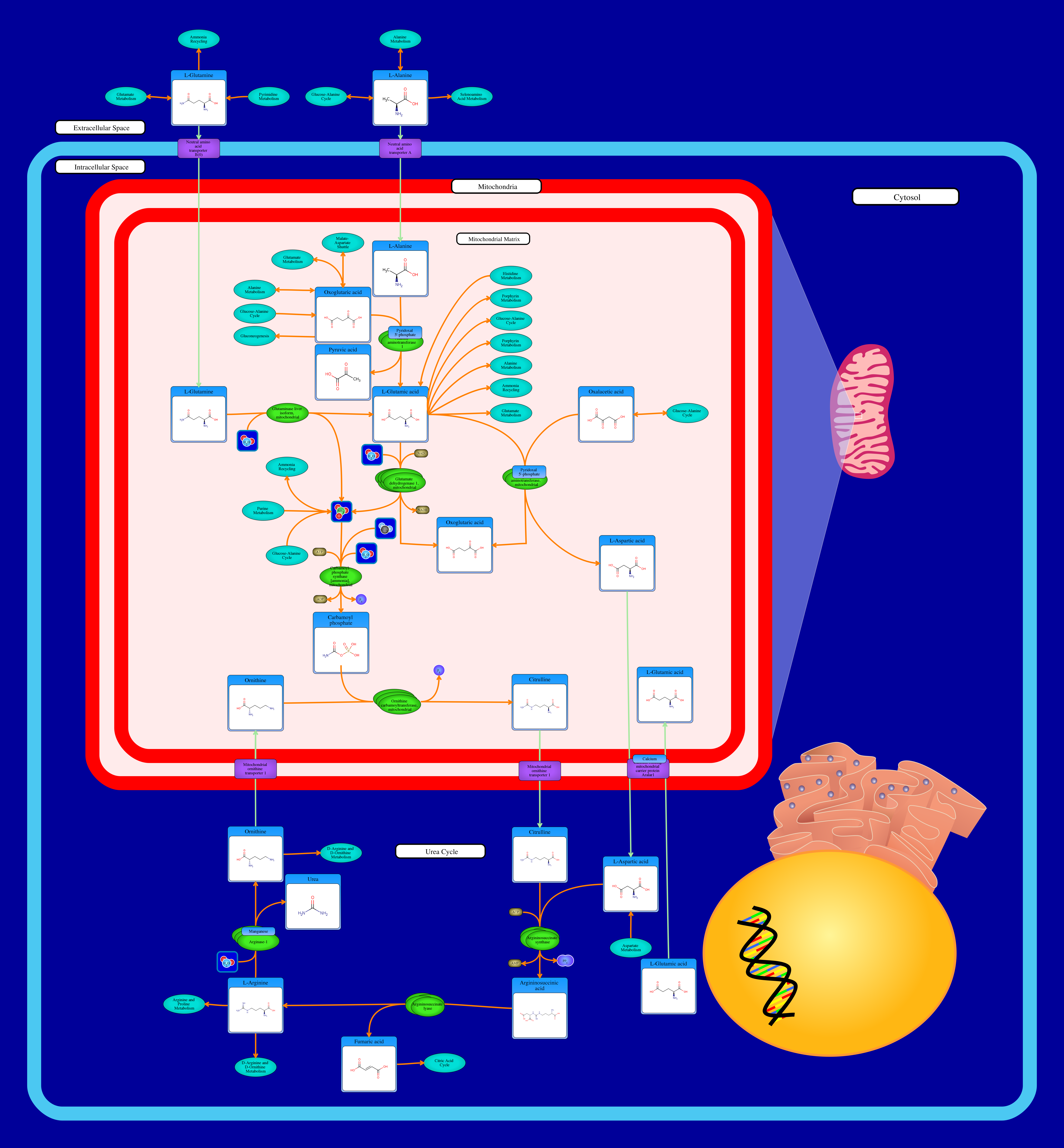 Enter relative concentration values (without units). Elements will be highlighted in a color gradient where red = lowest concentration and green = highest concentration. For the best results, view the pathway in Black and White.