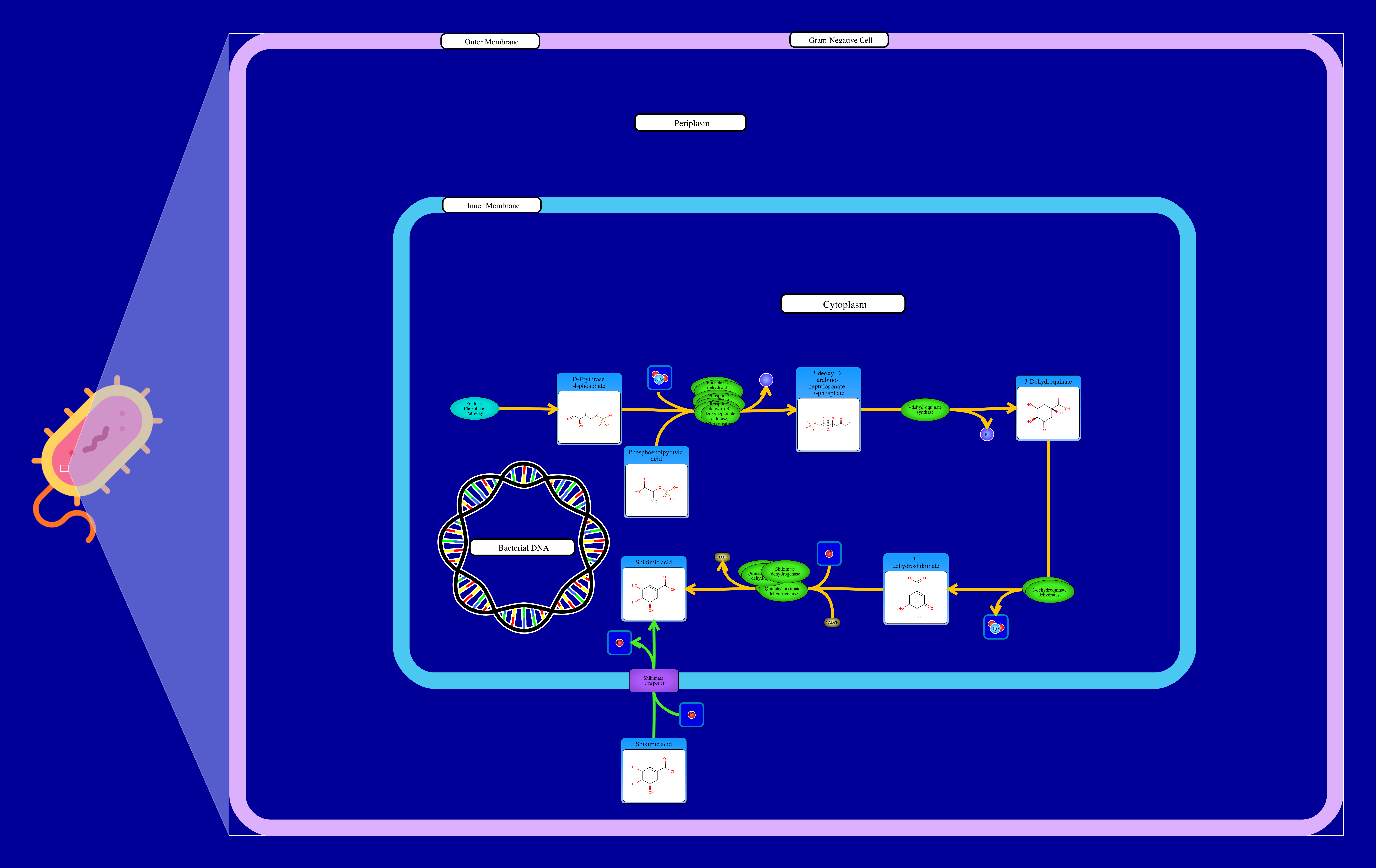 The biosynthesis of shikimate starts with D-Erythrose-4-phosphate getting transformed into 3-deoxy-D-arabino-heptulosonate-7-phosphate through a phospho-2-dehydro-3-deoxyheptonate aldolase. This is followed by a 3-dehydroquinate synthase converting the 3-deoxy-D-arabino-heptulosonate-7-phosphate into a 3-dehydroquinate which in turn is conveted to 3-dehydroshikimate through a 3-dehydroquinate dehydratase. A this point 3-dehydroshikimate can be turned into Shikimic acid through 2 different reactions involving an NADPH driven Quinate/shikimate dehydrogenase or a NADPH driven shikimate dehydrogenase 2.