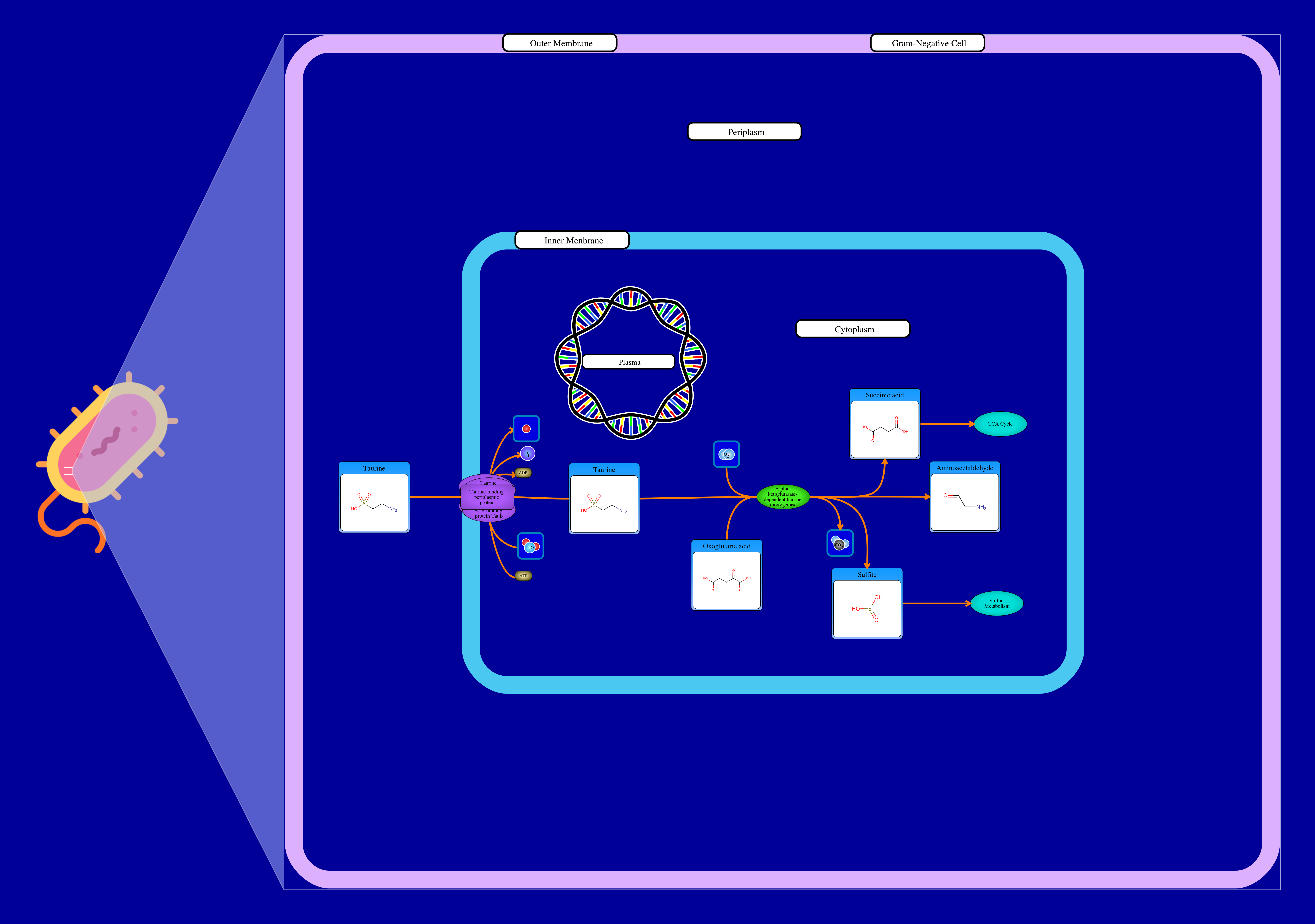 Taurine is incorporated into the cytoplasm through a taurine ABC transporter. Once inside the cytoplasm, taurine interacts with an oxoglutaric acid and an oxygen through a taurine dioxygenase resulting in the release of succinic acid, sulfite , aminoacetaldehyde and carbon dioxide.
