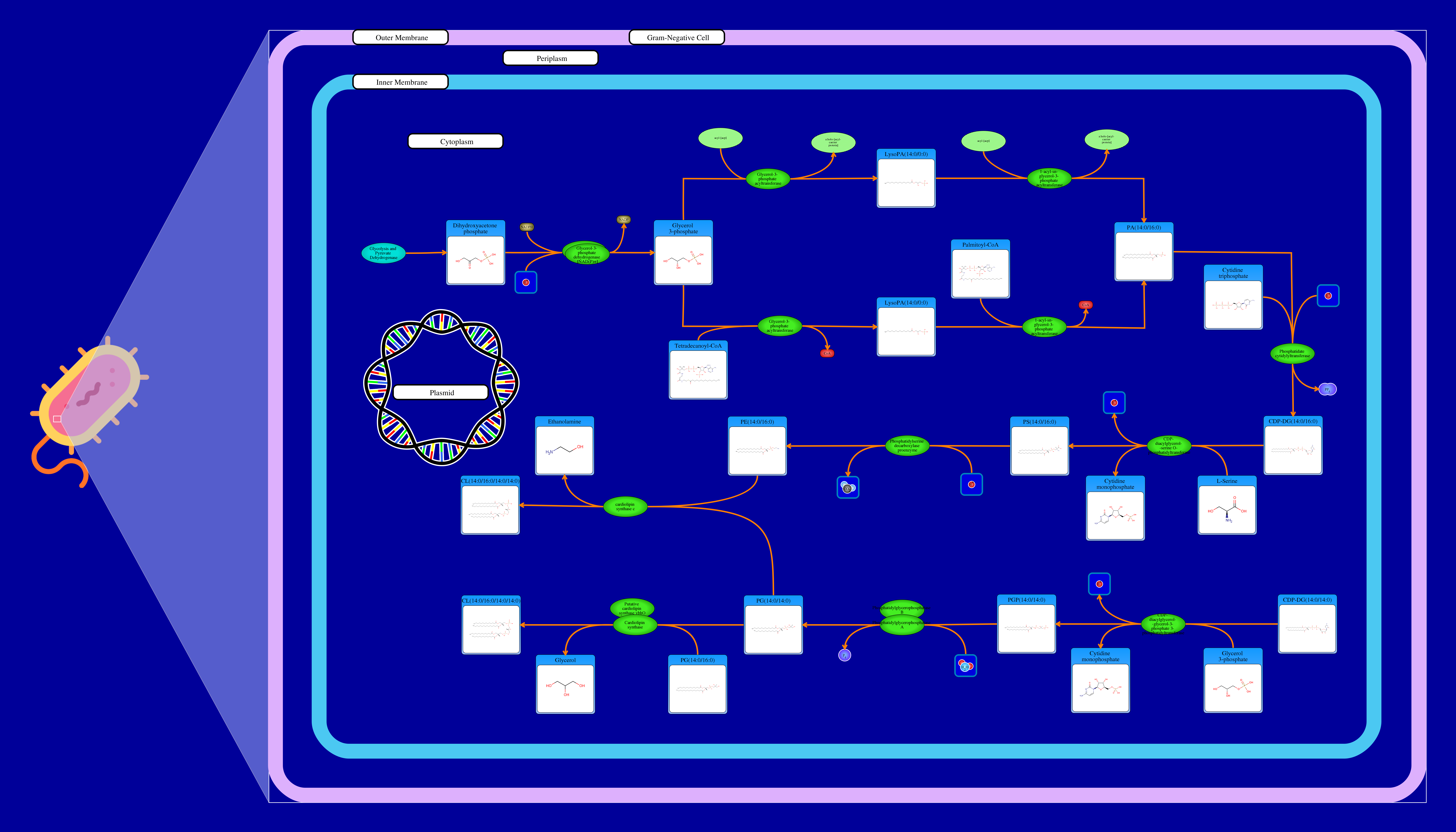 Phospholipids are membrane components in E. coli. The major phospholipids of E. coli are phosphatidylethanolamine, phosphatidylglycerol, and cardiolipin. All phospholipids contain sn-glycerol-3-phosphate esterified with fatty acids at the sn-1 and sn-2 positions. The reaction starts from a glycerone phosphate (dihydroxyacetone phosphate) produced in glycolysis. The glycerone phosphate is transformed into an sn-glycerol 3-phosphate (glycerol 3 phosphate) by NADPH-driven glycerol-3-phosphate dehydrogenase. sn-Glycerol 3-phosphate is transformed to a 1-acyl-sn-glycerol 3-phosphate (lysophosphatidic acid). This can be achieved by an sn-glycerol-3-phosphate acyltransferase that interacts either with a long-chain acyl-CoA or with an acyl-[acp]. The 1-acyl-sn-glycerol 3-phosphate is transformed into a 1,2-diacyl-sn-glycerol 3-phosphate (phosphatidic acid) through a 1-acylglycerol-3-phosphate O-acyltransferase. This compound is then converted into a CPD-diacylglycerol through a CTP phosphatidate cytididyltransferase. CPD-diacylglycerol can be transformed either into an L-1-phosphatidylserine or an L-1-phosphatidylglycerol-phosphate through a phosphatidylserine synthase or a phosphatidylglycerophosphate synthase, respectively. The L-1-phosphatidylserine transforms into L-1-phosphatidylethanolamine through a phosphatidylserine decarboxylase. On the other hand, L-1-phosphatidylglycerol-phosphate gets transformed into an L-1-phosphatidyl-glycerol through a phosphatidylglycerophosphatase. These 2 products combine to produce a cardiolipin and an ethanolamine. The L-1 phosphatidyl-glycerol can also interact with cardiolipin synthase resulting in a glycerol and a cardiolipin.