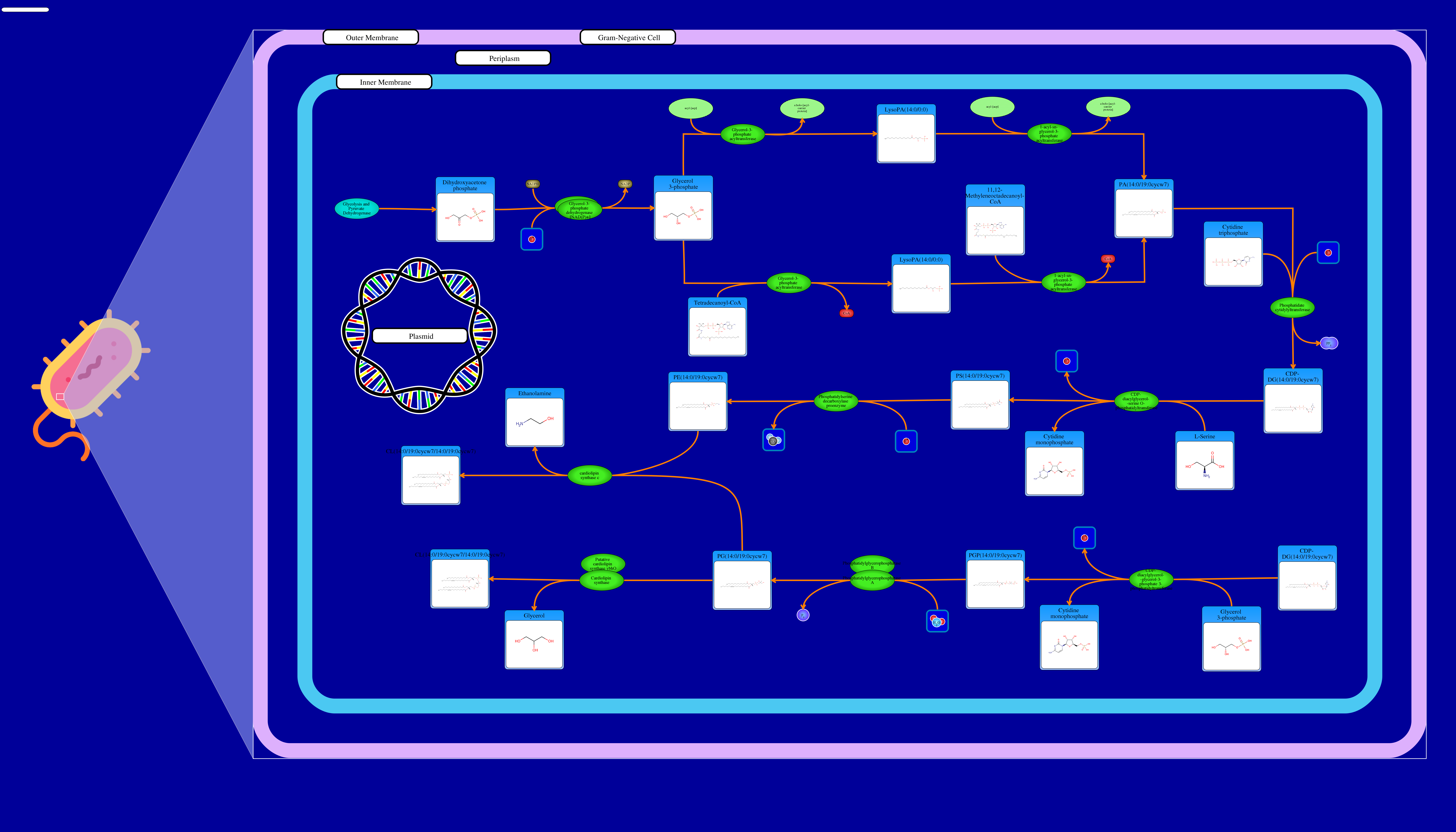Phospholipids are membrane components in E. coli. The major phospholipids of E. coli are phosphatidylethanolamine, phosphatidylglycerol, and cardiolipin. All phospholipids contain sn-glycerol-3-phosphate esterified with fatty acids at the sn-1 and sn-2 positions. The reaction starts from a glycerone phosphate (dihydroxyacetone phosphate) produced in glycolysis. The glycerone phosphate is transformed into an sn-glycerol 3-phosphate (glycerol 3 phosphate) by NADPH-driven glycerol-3-phosphate dehydrogenase. sn-Glycerol 3-phosphate is transformed to a 1-acyl-sn-glycerol 3-phosphate (lysophosphatidic acid). This can be achieved by an sn-glycerol-3-phosphate acyltransferase that interacts either with a long-chain acyl-CoA or with an acyl-[acp]. The 1-acyl-sn-glycerol 3-phosphate is transformed into a 1,2-diacyl-sn-glycerol 3-phosphate (phosphatidic acid) through a 1-acylglycerol-3-phosphate O-acyltransferase. This compound is then converted into a CPD-diacylglycerol through a CTP phosphatidate cytididyltransferase. CPD-diacylglycerol can be transformed either into an L-1-phosphatidylserine or an L-1-phosphatidylglycerol-phosphate through a phosphatidylserine synthase or a phosphatidylglycerophosphate synthase, respectively. The L-1-phosphatidylserine transforms into L-1-phosphatidylethanolamine through a phosphatidylserine decarboxylase. On the other hand, L-1-phosphatidylglycerol-phosphate gets transformed into an L-1-phosphatidyl-glycerol through a phosphatidylglycerophosphatase. These 2 products combine to produce a cardiolipin and an ethanolamine. The L-1 phosphatidyl-glycerol can also interact with cardiolipin synthase resulting in a glycerol and a cardiolipin.