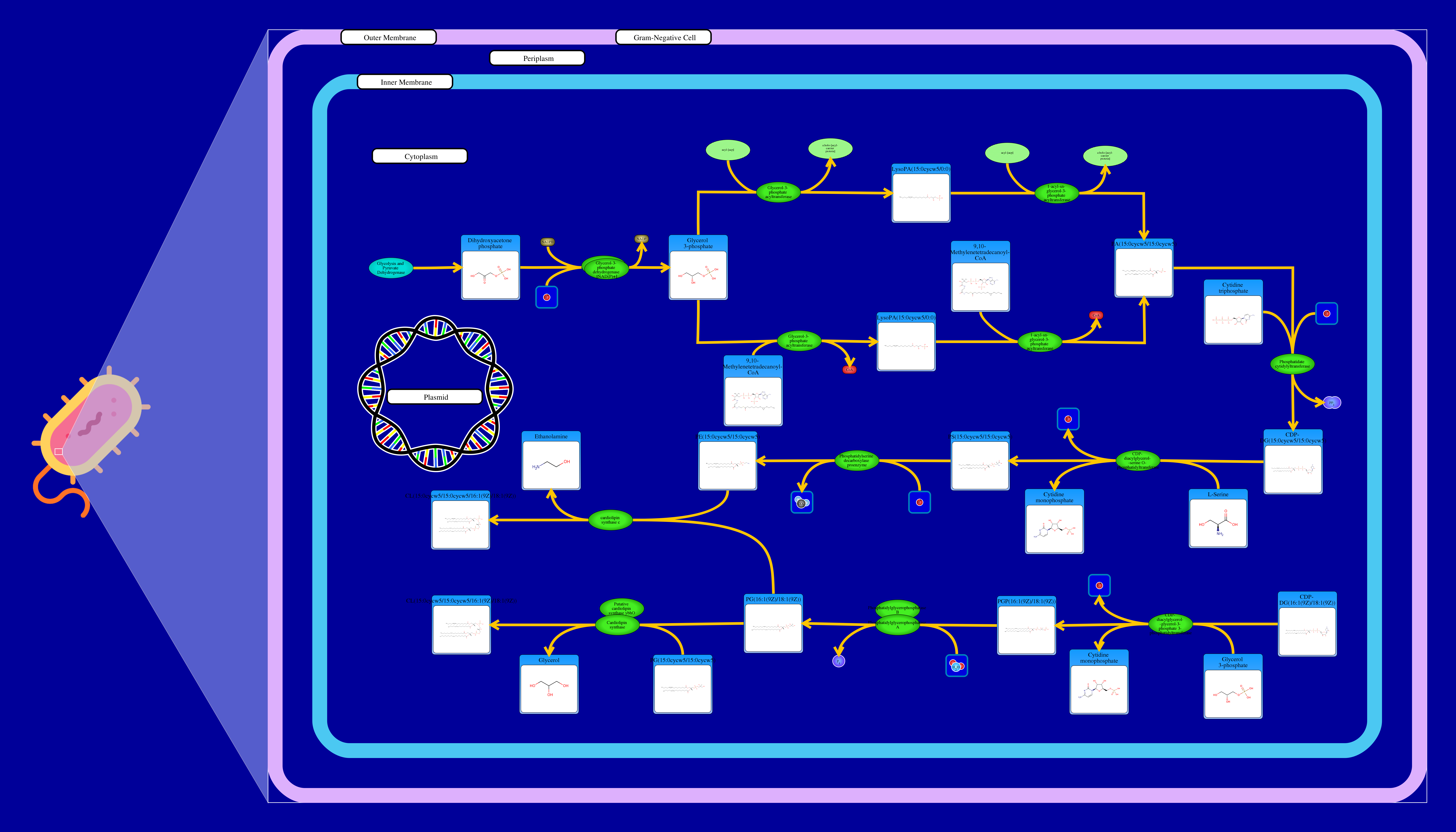 Phospholipids are membrane components in E. coli. The major phospholipids of E. coli are phosphatidylethanolamine, phosphatidylglycerol, and cardiolipin. All phospholipids contain sn-glycerol-3-phosphate esterified with fatty acids at the sn-1 and sn-2 positions. The reaction starts from a glycerone phosphate (dihydroxyacetone phosphate) produced in glycolysis. The glycerone phosphate is transformed into an sn-glycerol 3-phosphate (glycerol 3 phosphate) by NADPH-driven glycerol-3-phosphate dehydrogenase. sn-Glycerol 3-phosphate is transformed to a 1-acyl-sn-glycerol 3-phosphate (lysophosphatidic acid). This can be achieved by an sn-glycerol-3-phosphate acyltransferase that interacts either with a long-chain acyl-CoA or with an acyl-[acp]. The 1-acyl-sn-glycerol 3-phosphate is transformed into a 1,2-diacyl-sn-glycerol 3-phosphate (phosphatidic acid) through a 1-acylglycerol-3-phosphate O-acyltransferase. This compound is then converted into a CPD-diacylglycerol through a CTP phosphatidate cytididyltransferase. CPD-diacylglycerol can be transformed either into an L-1-phosphatidylserine or an L-1-phosphatidylglycerol-phosphate through a phosphatidylserine synthase or a phosphatidylglycerophosphate synthase, respectively. The L-1-phosphatidylserine transforms into L-1-phosphatidylethanolamine through a phosphatidylserine decarboxylase. On the other hand, L-1-phosphatidylglycerol-phosphate gets transformed into an L-1-phosphatidyl-glycerol through a phosphatidylglycerophosphatase. These 2 products combine to produce a cardiolipin and an ethanolamine. The L-1 phosphatidyl-glycerol can also interact with cardiolipin synthase resulting in a glycerol and a cardiolipin.