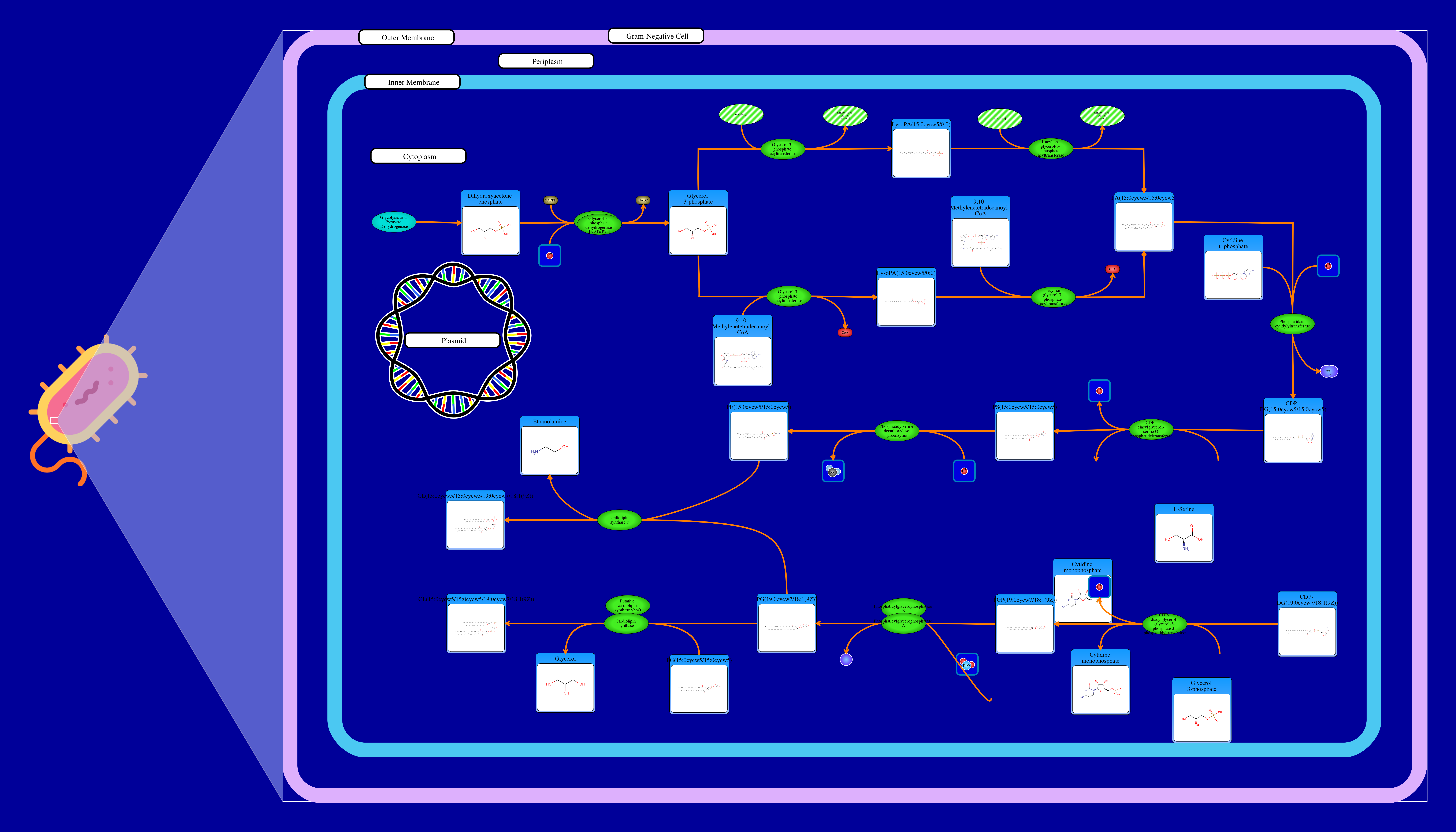 Phospholipids are membrane components in E. coli. The major phospholipids of E. coli are phosphatidylethanolamine, phosphatidylglycerol, and cardiolipin. All phospholipids contain sn-glycerol-3-phosphate esterified with fatty acids at the sn-1 and sn-2 positions. The reaction starts from a glycerone phosphate (dihydroxyacetone phosphate) produced in glycolysis. The glycerone phosphate is transformed into an sn-glycerol 3-phosphate (glycerol 3 phosphate) by NADPH-driven glycerol-3-phosphate dehydrogenase. sn-Glycerol 3-phosphate is transformed to a 1-acyl-sn-glycerol 3-phosphate (lysophosphatidic acid). This can be achieved by an sn-glycerol-3-phosphate acyltransferase that interacts either with a long-chain acyl-CoA or with an acyl-[acp]. The 1-acyl-sn-glycerol 3-phosphate is transformed into a 1,2-diacyl-sn-glycerol 3-phosphate (phosphatidic acid) through a 1-acylglycerol-3-phosphate O-acyltransferase. This compound is then converted into a CPD-diacylglycerol through a CTP phosphatidate cytididyltransferase. CPD-diacylglycerol can be transformed either into an L-1-phosphatidylserine or an L-1-phosphatidylglycerol-phosphate through a phosphatidylserine synthase or a phosphatidylglycerophosphate synthase, respectively. The L-1-phosphatidylserine transforms into L-1-phosphatidylethanolamine through a phosphatidylserine decarboxylase. On the other hand, L-1-phosphatidylglycerol-phosphate gets transformed into an L-1-phosphatidyl-glycerol through a phosphatidylglycerophosphatase. These 2 products combine to produce a cardiolipin and an ethanolamine. The L-1 phosphatidyl-glycerol can also interact with cardiolipin synthase resulting in a glycerol and a cardiolipin.