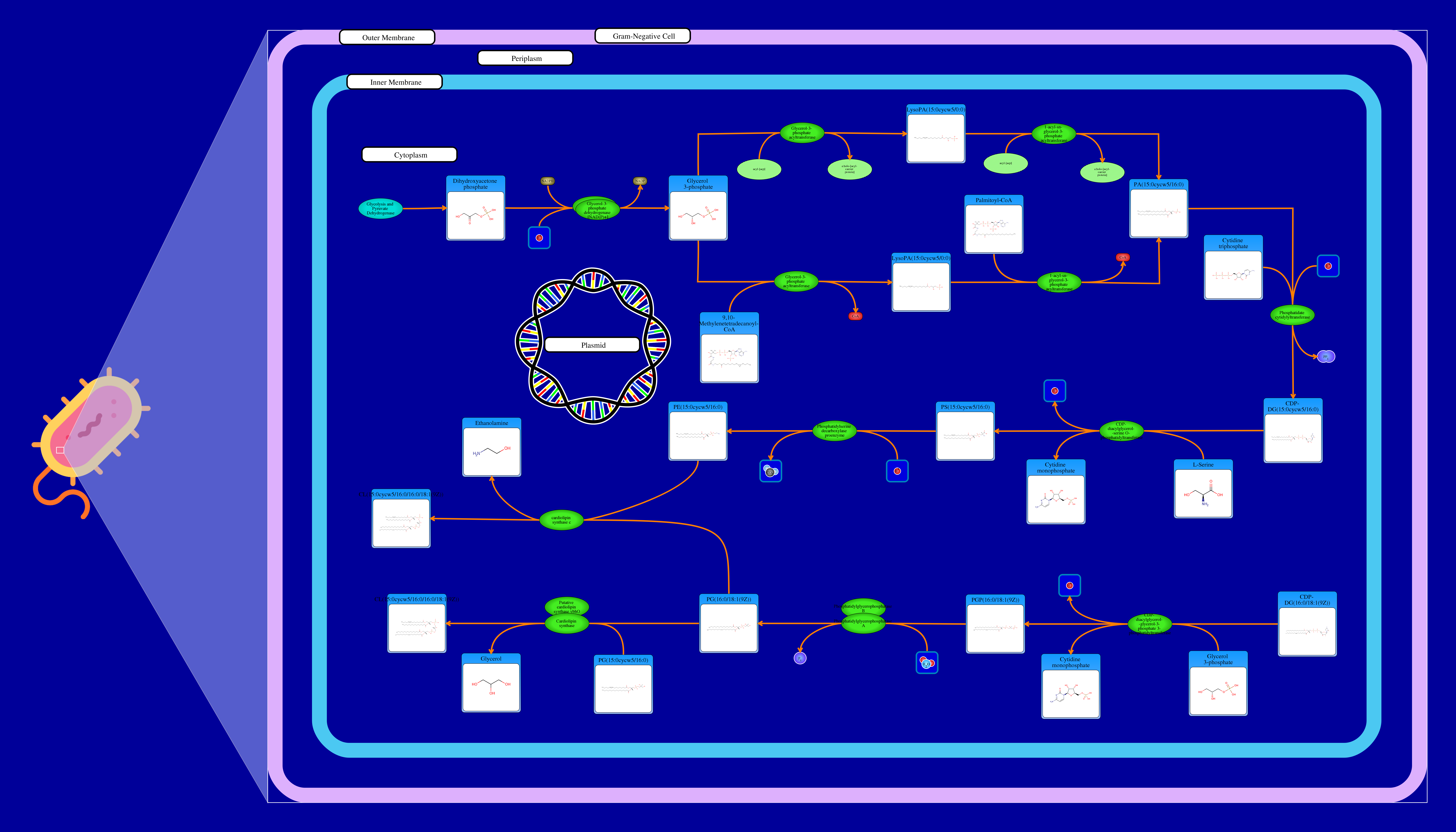 Phospholipids are membrane components in E. coli. The major phospholipids of E. coli are phosphatidylethanolamine, phosphatidylglycerol, and cardiolipin. All phospholipids contain sn-glycerol-3-phosphate esterified with fatty acids at the sn-1 and sn-2 positions. The reaction starts from a glycerone phosphate (dihydroxyacetone phosphate) produced in glycolysis. The glycerone phosphate is transformed into an sn-glycerol 3-phosphate (glycerol 3 phosphate) by NADPH-driven glycerol-3-phosphate dehydrogenase. sn-Glycerol 3-phosphate is transformed to a 1-acyl-sn-glycerol 3-phosphate (lysophosphatidic acid). This can be achieved by an sn-glycerol-3-phosphate acyltransferase that interacts either with a long-chain acyl-CoA or with an acyl-[acp]. The 1-acyl-sn-glycerol 3-phosphate is transformed into a 1,2-diacyl-sn-glycerol 3-phosphate (phosphatidic acid) through a 1-acylglycerol-3-phosphate O-acyltransferase. This compound is then converted into a CPD-diacylglycerol through a CTP phosphatidate cytididyltransferase. CPD-diacylglycerol can be transformed either into an L-1-phosphatidylserine or an L-1-phosphatidylglycerol-phosphate through a phosphatidylserine synthase or a phosphatidylglycerophosphate synthase, respectively. The L-1-phosphatidylserine transforms into L-1-phosphatidylethanolamine through a phosphatidylserine decarboxylase. On the other hand, L-1-phosphatidylglycerol-phosphate gets transformed into an L-1-phosphatidyl-glycerol through a phosphatidylglycerophosphatase. These 2 products combine to produce a cardiolipin and an ethanolamine. The L-1 phosphatidyl-glycerol can also interact with cardiolipin synthase resulting in a glycerol and a cardiolipin.