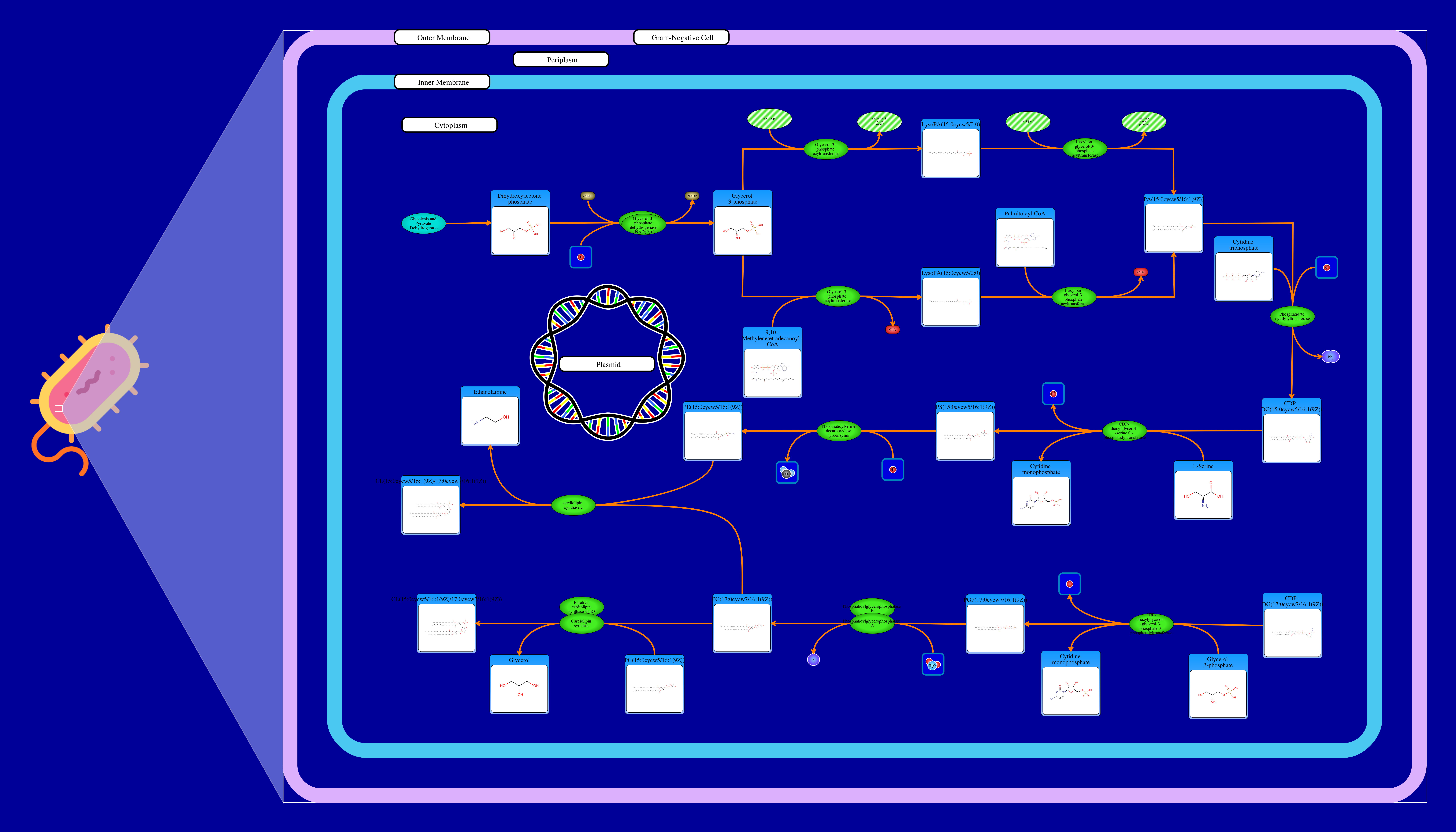 Phospholipids are membrane components in E. coli. The major phospholipids of E. coli are phosphatidylethanolamine, phosphatidylglycerol, and cardiolipin. All phospholipids contain sn-glycerol-3-phosphate esterified with fatty acids at the sn-1 and sn-2 positions. The reaction starts from a glycerone phosphate (dihydroxyacetone phosphate) produced in glycolysis. The glycerone phosphate is transformed into an sn-glycerol 3-phosphate (glycerol 3 phosphate) by NADPH-driven glycerol-3-phosphate dehydrogenase. sn-Glycerol 3-phosphate is transformed to a 1-acyl-sn-glycerol 3-phosphate (lysophosphatidic acid). This can be achieved by an sn-glycerol-3-phosphate acyltransferase that interacts either with a long-chain acyl-CoA or with an acyl-[acp]. The 1-acyl-sn-glycerol 3-phosphate is transformed into a 1,2-diacyl-sn-glycerol 3-phosphate (phosphatidic acid) through a 1-acylglycerol-3-phosphate O-acyltransferase. This compound is then converted into a CPD-diacylglycerol through a CTP phosphatidate cytididyltransferase. CPD-diacylglycerol can be transformed either into an L-1-phosphatidylserine or an L-1-phosphatidylglycerol-phosphate through a phosphatidylserine synthase or a phosphatidylglycerophosphate synthase, respectively. The L-1-phosphatidylserine transforms into L-1-phosphatidylethanolamine through a phosphatidylserine decarboxylase. On the other hand, L-1-phosphatidylglycerol-phosphate gets transformed into an L-1-phosphatidyl-glycerol through a phosphatidylglycerophosphatase. These 2 products combine to produce a cardiolipin and an ethanolamine. The L-1 phosphatidyl-glycerol can also interact with cardiolipin synthase resulting in a glycerol and a cardiolipin.