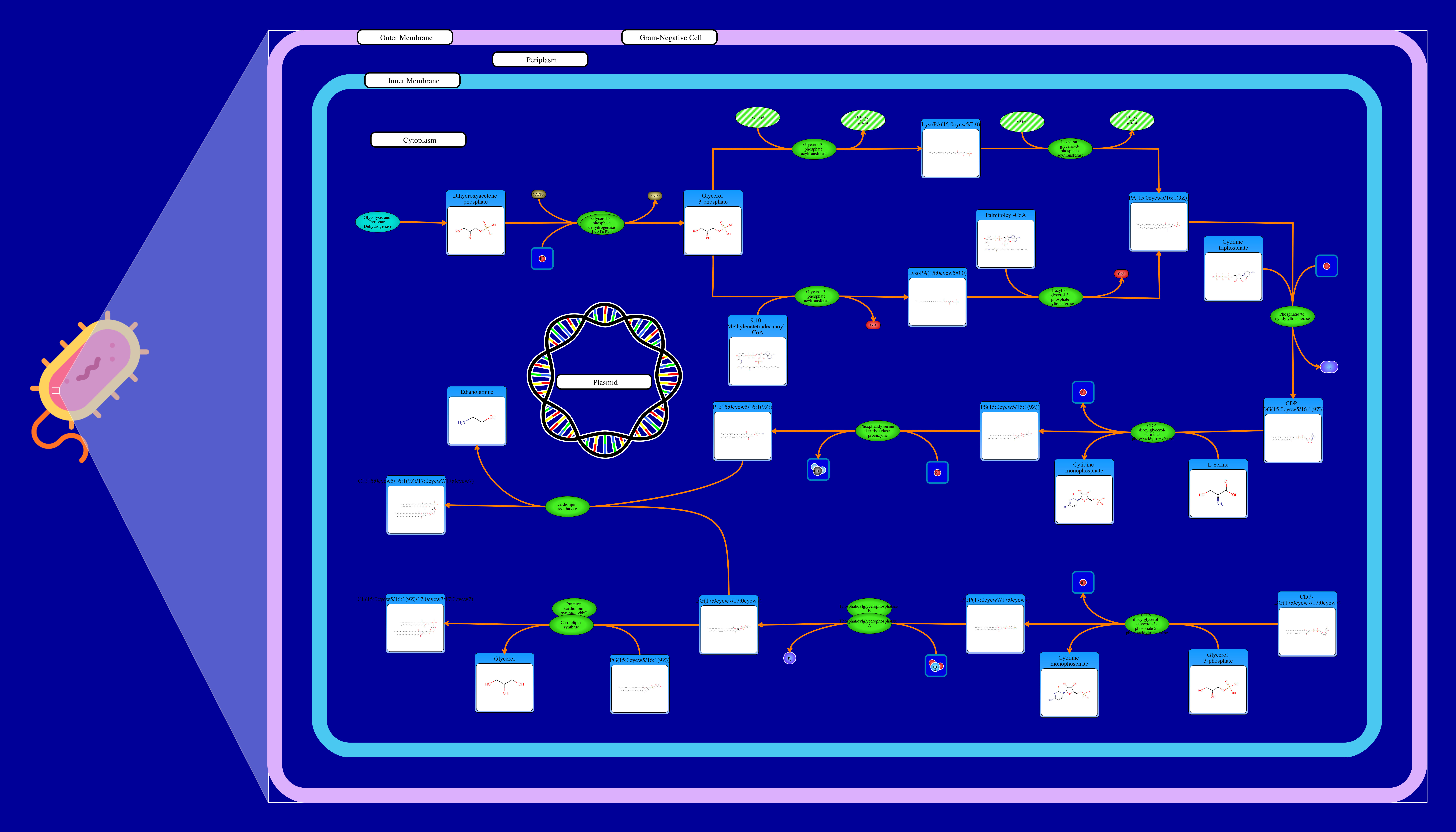 Phospholipids are membrane components in E. coli. The major phospholipids of E. coli are phosphatidylethanolamine, phosphatidylglycerol, and cardiolipin. All phospholipids contain sn-glycerol-3-phosphate esterified with fatty acids at the sn-1 and sn-2 positions. The reaction starts from a glycerone phosphate (dihydroxyacetone phosphate) produced in glycolysis. The glycerone phosphate is transformed into an sn-glycerol 3-phosphate (glycerol 3 phosphate) by NADPH-driven glycerol-3-phosphate dehydrogenase. sn-Glycerol 3-phosphate is transformed to a 1-acyl-sn-glycerol 3-phosphate (lysophosphatidic acid). This can be achieved by an sn-glycerol-3-phosphate acyltransferase that interacts either with a long-chain acyl-CoA or with an acyl-[acp]. The 1-acyl-sn-glycerol 3-phosphate is transformed into a 1,2-diacyl-sn-glycerol 3-phosphate (phosphatidic acid) through a 1-acylglycerol-3-phosphate O-acyltransferase. This compound is then converted into a CPD-diacylglycerol through a CTP phosphatidate cytididyltransferase. CPD-diacylglycerol can be transformed either into an L-1-phosphatidylserine or an L-1-phosphatidylglycerol-phosphate through a phosphatidylserine synthase or a phosphatidylglycerophosphate synthase, respectively. The L-1-phosphatidylserine transforms into L-1-phosphatidylethanolamine through a phosphatidylserine decarboxylase. On the other hand, L-1-phosphatidylglycerol-phosphate gets transformed into an L-1-phosphatidyl-glycerol through a phosphatidylglycerophosphatase. These 2 products combine to produce a cardiolipin and an ethanolamine. The L-1 phosphatidyl-glycerol can also interact with cardiolipin synthase resulting in a glycerol and a cardiolipin.