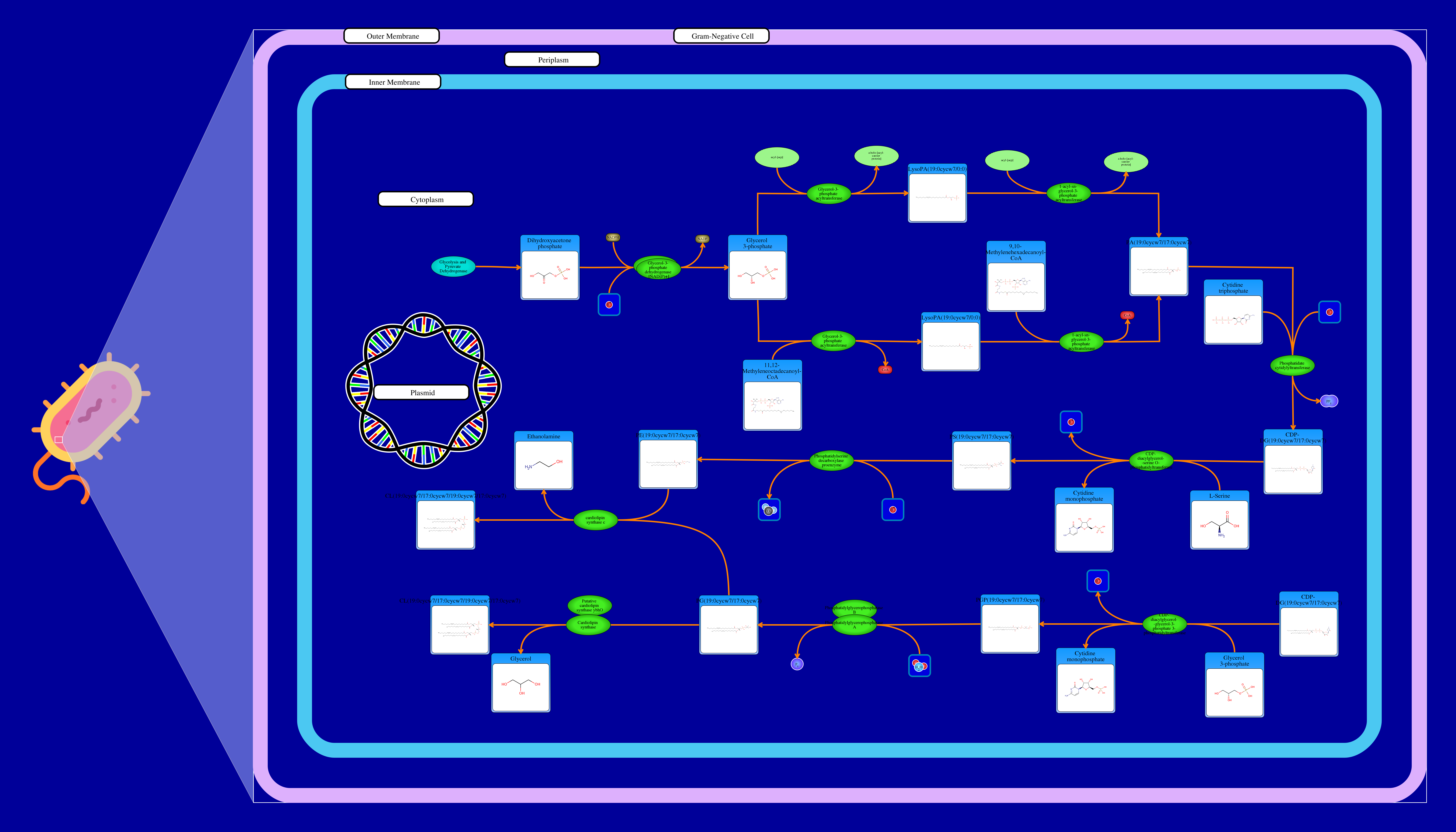 Phospholipids are membrane components in E. coli. The major phospholipids of E. coli are phosphatidylethanolamine, phosphatidylglycerol, and cardiolipin. All phospholipids contain sn-glycerol-3-phosphate esterified with fatty acids at the sn-1 and sn-2 positions. The reaction starts from a glycerone phosphate (dihydroxyacetone phosphate) produced in glycolysis. The glycerone phosphate is transformed into an sn-glycerol 3-phosphate (glycerol 3 phosphate) by NADPH-driven glycerol-3-phosphate dehydrogenase. sn-Glycerol 3-phosphate is transformed to a 1-acyl-sn-glycerol 3-phosphate (lysophosphatidic acid). This can be achieved by an sn-glycerol-3-phosphate acyltransferase that interacts either with a long-chain acyl-CoA or with an acyl-[acp]. The 1-acyl-sn-glycerol 3-phosphate is transformed into a 1,2-diacyl-sn-glycerol 3-phosphate (phosphatidic acid) through a 1-acylglycerol-3-phosphate O-acyltransferase. This compound is then converted into a CPD-diacylglycerol through a CTP phosphatidate cytididyltransferase. CPD-diacylglycerol can be transformed either into an L-1-phosphatidylserine or an L-1-phosphatidylglycerol-phosphate through a phosphatidylserine synthase or a phosphatidylglycerophosphate synthase, respectively. The L-1-phosphatidylserine transforms into L-1-phosphatidylethanolamine through a phosphatidylserine decarboxylase. On the other hand, L-1-phosphatidylglycerol-phosphate gets transformed into an L-1-phosphatidyl-glycerol through a phosphatidylglycerophosphatase. These 2 products combine to produce a cardiolipin and an ethanolamine. The L-1 phosphatidyl-glycerol can also interact with cardiolipin synthase resulting in a glycerol and a cardiolipin.