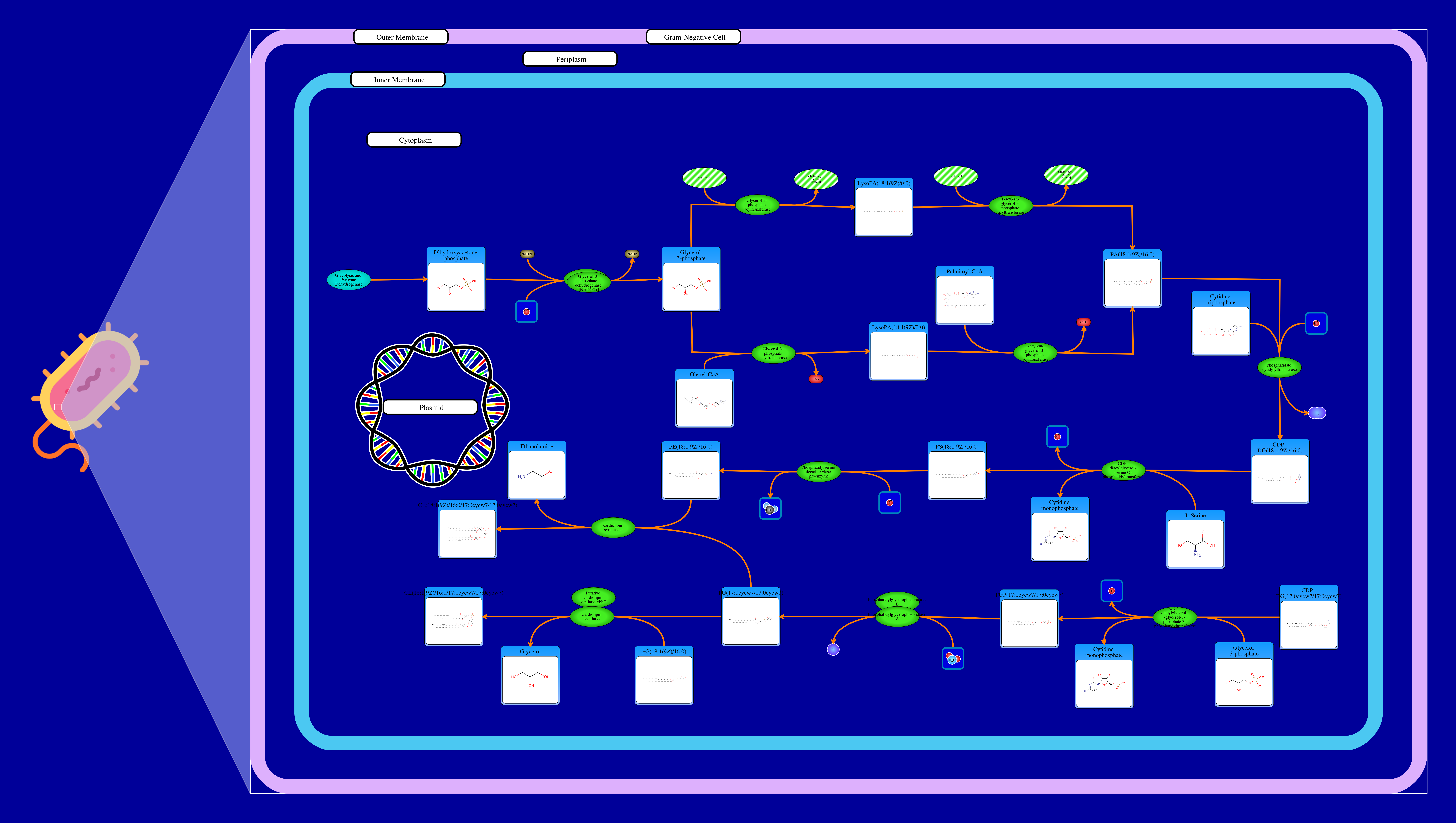 Phospholipids are membrane components in E. coli. The major phospholipids of E. coli are phosphatidylethanolamine, phosphatidylglycerol, and cardiolipin. All phospholipids contain sn-glycerol-3-phosphate esterified with fatty acids at the sn-1 and sn-2 positions. The reaction starts from a glycerone phosphate (dihydroxyacetone phosphate) produced in glycolysis. The glycerone phosphate is transformed into an sn-glycerol 3-phosphate (glycerol 3 phosphate) by NADPH-driven glycerol-3-phosphate dehydrogenase. sn-Glycerol 3-phosphate is transformed to a 1-acyl-sn-glycerol 3-phosphate (lysophosphatidic acid). This can be achieved by an sn-glycerol-3-phosphate acyltransferase that interacts either with a long-chain acyl-CoA or with an acyl-[acp]. The 1-acyl-sn-glycerol 3-phosphate is transformed into a 1,2-diacyl-sn-glycerol 3-phosphate (phosphatidic acid) through a 1-acylglycerol-3-phosphate O-acyltransferase. This compound is then converted into a CPD-diacylglycerol through a CTP phosphatidate cytididyltransferase. CPD-diacylglycerol can be transformed either into an L-1-phosphatidylserine or an L-1-phosphatidylglycerol-phosphate through a phosphatidylserine synthase or a phosphatidylglycerophosphate synthase, respectively. The L-1-phosphatidylserine transforms into L-1-phosphatidylethanolamine through a phosphatidylserine decarboxylase. On the other hand, L-1-phosphatidylglycerol-phosphate gets transformed into an L-1-phosphatidyl-glycerol through a phosphatidylglycerophosphatase. These 2 products combine to produce a cardiolipin and an ethanolamine. The L-1 phosphatidyl-glycerol can also interact with cardiolipin synthase resulting in a glycerol and a cardiolipin.