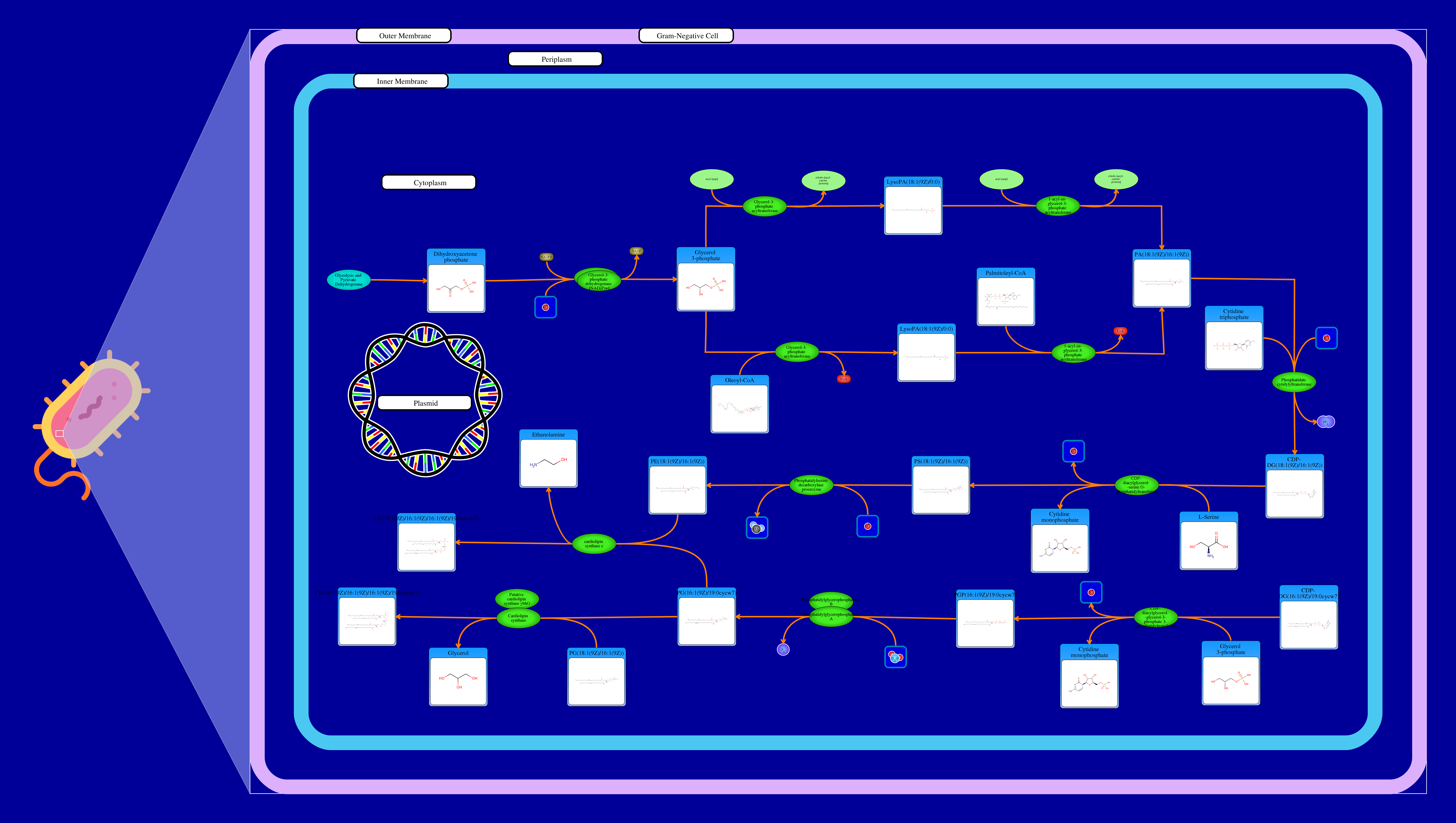 Phospholipids are membrane components in E. coli. The major phospholipids of E. coli are phosphatidylethanolamine, phosphatidylglycerol, and cardiolipin. All phospholipids contain sn-glycerol-3-phosphate esterified with fatty acids at the sn-1 and sn-2 positions. The reaction starts from a glycerone phosphate (dihydroxyacetone phosphate) produced in glycolysis. The glycerone phosphate is transformed into an sn-glycerol 3-phosphate (glycerol 3 phosphate) by NADPH-driven glycerol-3-phosphate dehydrogenase. sn-Glycerol 3-phosphate is transformed to a 1-acyl-sn-glycerol 3-phosphate (lysophosphatidic acid). This can be achieved by an sn-glycerol-3-phosphate acyltransferase that interacts either with a long-chain acyl-CoA or with an acyl-[acp]. The 1-acyl-sn-glycerol 3-phosphate is transformed into a 1,2-diacyl-sn-glycerol 3-phosphate (phosphatidic acid) through a 1-acylglycerol-3-phosphate O-acyltransferase. This compound is then converted into a CPD-diacylglycerol through a CTP phosphatidate cytididyltransferase. CPD-diacylglycerol can be transformed either into an L-1-phosphatidylserine or an L-1-phosphatidylglycerol-phosphate through a phosphatidylserine synthase or a phosphatidylglycerophosphate synthase, respectively. The L-1-phosphatidylserine transforms into L-1-phosphatidylethanolamine through a phosphatidylserine decarboxylase. On the other hand, L-1-phosphatidylglycerol-phosphate gets transformed into an L-1-phosphatidyl-glycerol through a phosphatidylglycerophosphatase. These 2 products combine to produce a cardiolipin and an ethanolamine. The L-1 phosphatidyl-glycerol can also interact with cardiolipin synthase resulting in a glycerol and a cardiolipin.