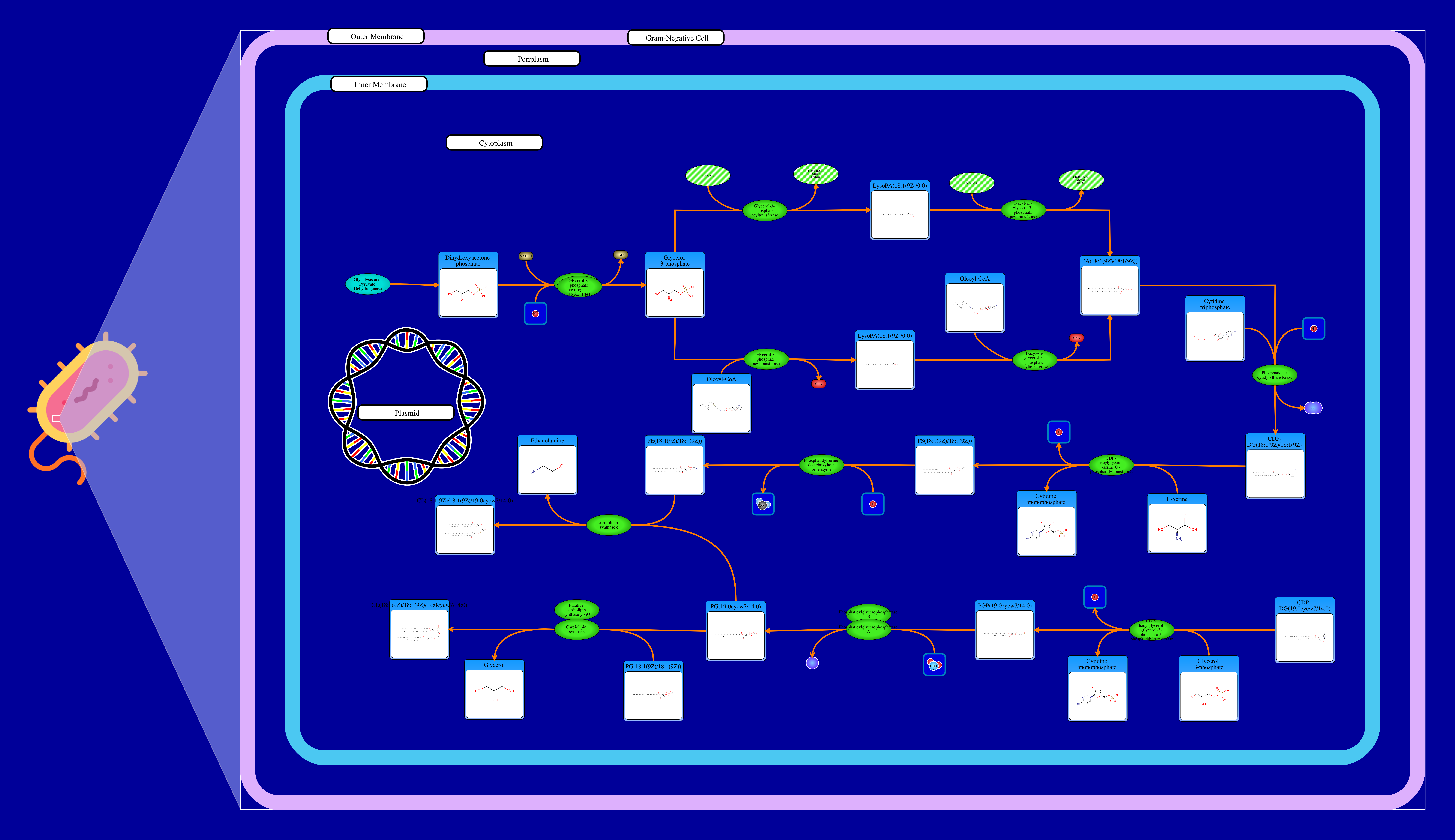 Phospholipids are membrane components in E. coli. The major phospholipids of E. coli are phosphatidylethanolamine, phosphatidylglycerol, and cardiolipin. All phospholipids contain sn-glycerol-3-phosphate esterified with fatty acids at the sn-1 and sn-2 positions. The reaction starts from a glycerone phosphate (dihydroxyacetone phosphate) produced in glycolysis. The glycerone phosphate is transformed into an sn-glycerol 3-phosphate (glycerol 3 phosphate) by NADPH-driven glycerol-3-phosphate dehydrogenase. sn-Glycerol 3-phosphate is transformed to a 1-acyl-sn-glycerol 3-phosphate (lysophosphatidic acid). This can be achieved by an sn-glycerol-3-phosphate acyltransferase that interacts either with a long-chain acyl-CoA or with an acyl-[acp]. The 1-acyl-sn-glycerol 3-phosphate is transformed into a 1,2-diacyl-sn-glycerol 3-phosphate (phosphatidic acid) through a 1-acylglycerol-3-phosphate O-acyltransferase. This compound is then converted into a CPD-diacylglycerol through a CTP phosphatidate cytididyltransferase. CPD-diacylglycerol can be transformed either into an L-1-phosphatidylserine or an L-1-phosphatidylglycerol-phosphate through a phosphatidylserine synthase or a phosphatidylglycerophosphate synthase, respectively. The L-1-phosphatidylserine transforms into L-1-phosphatidylethanolamine through a phosphatidylserine decarboxylase. On the other hand, L-1-phosphatidylglycerol-phosphate gets transformed into an L-1-phosphatidyl-glycerol through a phosphatidylglycerophosphatase. These 2 products combine to produce a cardiolipin and an ethanolamine. The L-1 phosphatidyl-glycerol can also interact with cardiolipin synthase resulting in a glycerol and a cardiolipin.