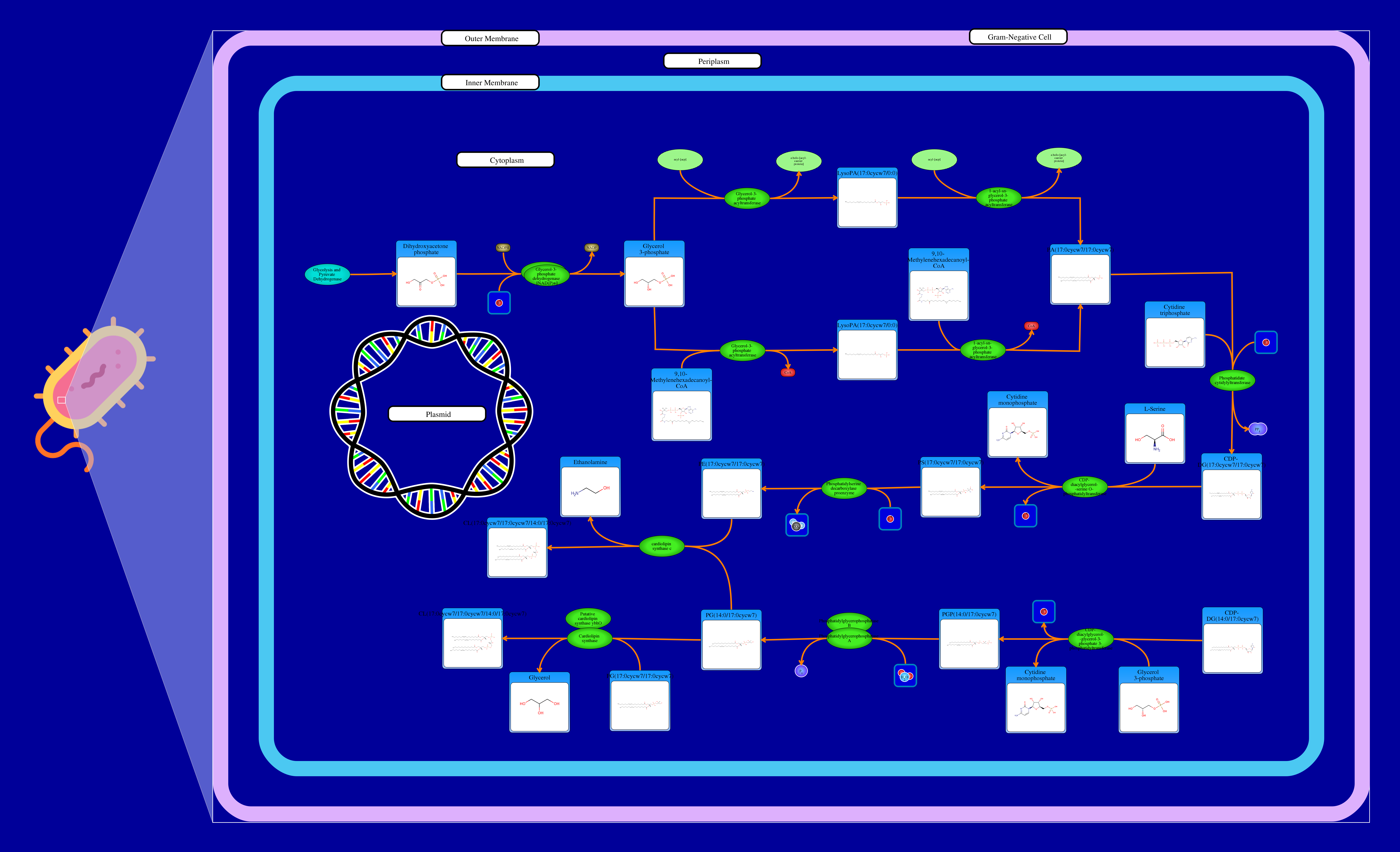Phospholipids are membrane components in E. coli. The major phospholipids of E. coli are phosphatidylethanolamine, phosphatidylglycerol, and cardiolipin. All phospholipids contain sn-glycerol-3-phosphate esterified with fatty acids at the sn-1 and sn-2 positions. The reaction starts from a glycerone phosphate (dihydroxyacetone phosphate) produced in glycolysis. The glycerone phosphate is transformed into an sn-glycerol 3-phosphate (glycerol 3 phosphate) by NADPH-driven glycerol-3-phosphate dehydrogenase. sn-Glycerol 3-phosphate is transformed to a 1-acyl-sn-glycerol 3-phosphate (lysophosphatidic acid). This can be achieved by an sn-glycerol-3-phosphate acyltransferase that interacts either with a long-chain acyl-CoA or with an acyl-[acp]. The 1-acyl-sn-glycerol 3-phosphate is transformed into a 1,2-diacyl-sn-glycerol 3-phosphate (phosphatidic acid) through a 1-acylglycerol-3-phosphate O-acyltransferase. This compound is then converted into a CPD-diacylglycerol through a CTP phosphatidate cytididyltransferase. CPD-diacylglycerol can be transformed either into an L-1-phosphatidylserine or an L-1-phosphatidylglycerol-phosphate through a phosphatidylserine synthase or a phosphatidylglycerophosphate synthase, respectively. The L-1-phosphatidylserine transforms into L-1-phosphatidylethanolamine through a phosphatidylserine decarboxylase. On the other hand, L-1-phosphatidylglycerol-phosphate gets transformed into an L-1-phosphatidyl-glycerol through a phosphatidylglycerophosphatase. These 2 products combine to produce a cardiolipin and an ethanolamine. The L-1 phosphatidyl-glycerol can also interact with cardiolipin synthase resulting in a glycerol and a cardiolipin.