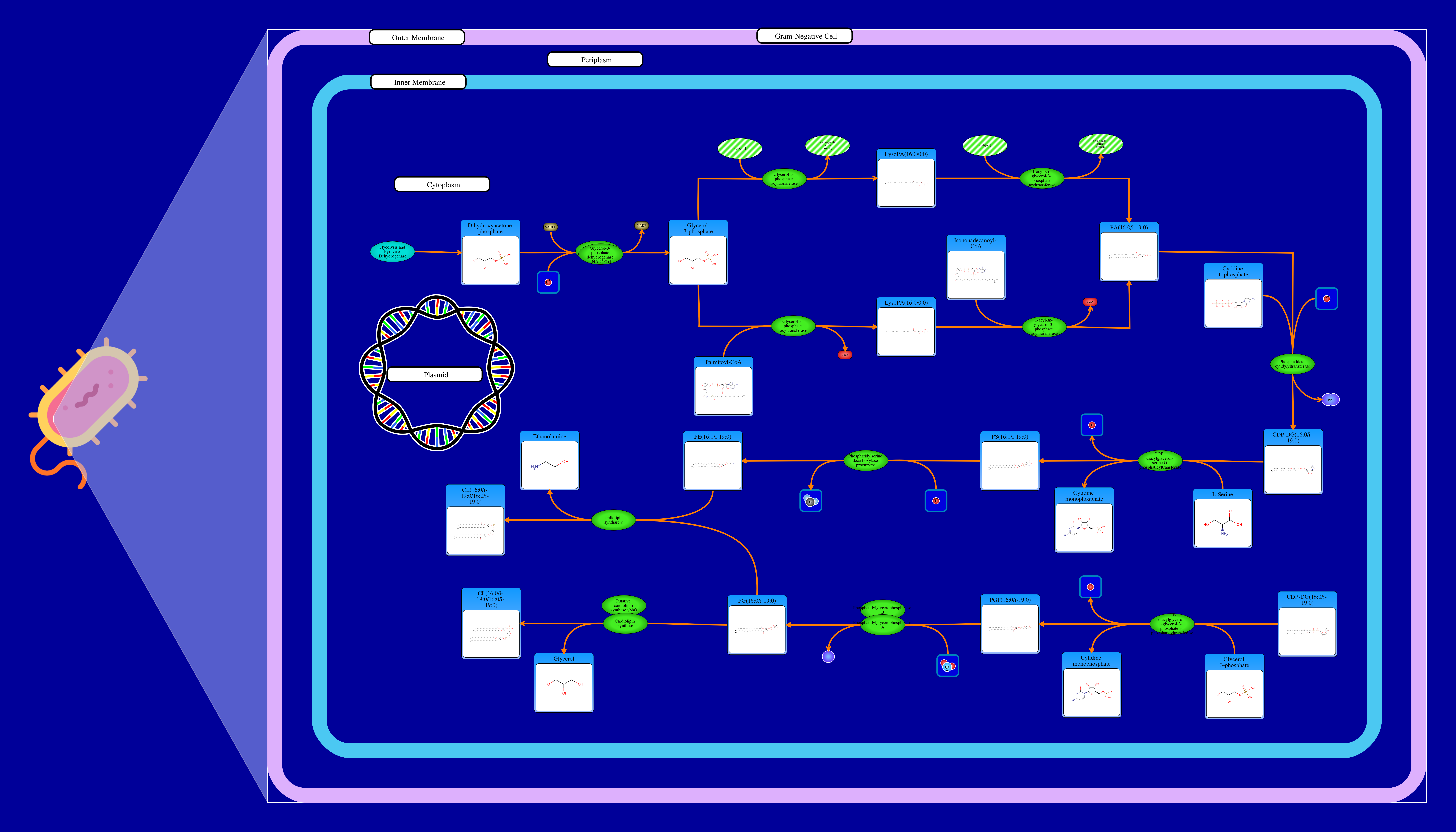 Phospholipids are membrane components in E. coli. The major phospholipids of E. coli are phosphatidylethanolamine, phosphatidylglycerol, and cardiolipin. All phospholipids contain sn-glycerol-3-phosphate esterified with fatty acids at the sn-1 and sn-2 positions. The reaction starts from a glycerone phosphate (dihydroxyacetone phosphate) produced in glycolysis. The glycerone phosphate is transformed into an sn-glycerol 3-phosphate (glycerol 3 phosphate) by NADPH-driven glycerol-3-phosphate dehydrogenase. sn-Glycerol 3-phosphate is transformed to a 1-acyl-sn-glycerol 3-phosphate (lysophosphatidic acid). This can be achieved by an sn-glycerol-3-phosphate acyltransferase that interacts either with a long-chain acyl-CoA or with an acyl-[acp]. The 1-acyl-sn-glycerol 3-phosphate is transformed into a 1,2-diacyl-sn-glycerol 3-phosphate (phosphatidic acid) through a 1-acylglycerol-3-phosphate O-acyltransferase. This compound is then converted into a CPD-diacylglycerol through a CTP phosphatidate cytididyltransferase. CPD-diacylglycerol can be transformed either into an L-1-phosphatidylserine or an L-1-phosphatidylglycerol-phosphate through a phosphatidylserine synthase or a phosphatidylglycerophosphate synthase, respectively. The L-1-phosphatidylserine transforms into L-1-phosphatidylethanolamine through a phosphatidylserine decarboxylase. On the other hand, L-1-phosphatidylglycerol-phosphate gets transformed into an L-1-phosphatidyl-glycerol through a phosphatidylglycerophosphatase. These 2 products combine to produce a cardiolipin and an ethanolamine. The L-1 phosphatidyl-glycerol can also interact with cardiolipin synthase resulting in a glycerol and a cardiolipin.