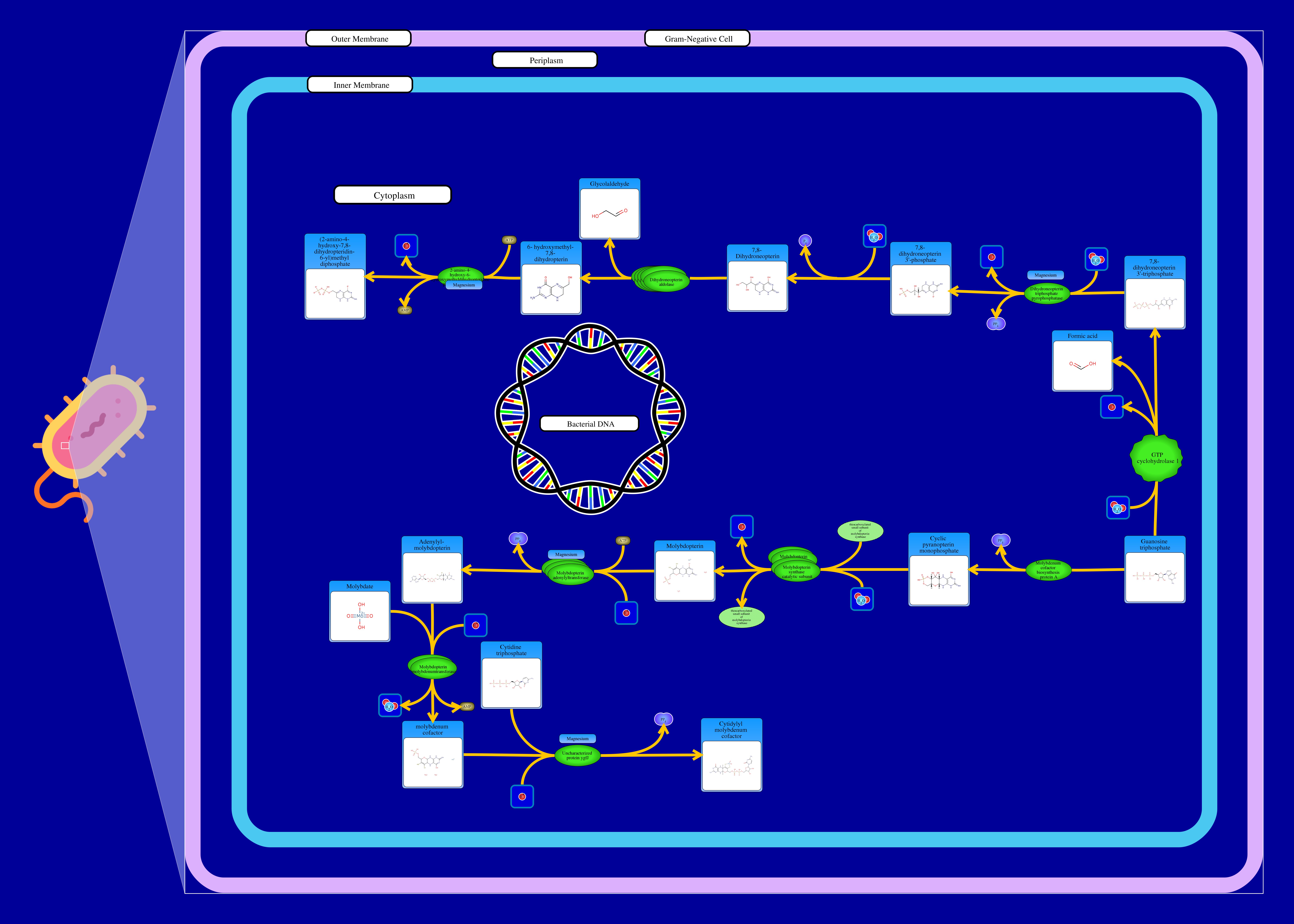 GTP interacts with a cyclic pyranopterin monophosphate synthase resulting in the release of a diphosphate and a cyclic pyranopterin phosphate. The latter compound interacts with a thiocarboxylated small subunit of molybdopterin synthase (a protein) and a water molecule through a molybdopterin synthase resulting in the release of 4 hydrogen ions, 2 small subunits of molybdopterin synthase and a molybdopterin. The molybdopterin interacts with an ATP and a hydrogen ion through a molybdopterin adenylyltransferase resulting in the release of a diphosphate and a molybdopterin adenine dinucleotide. The latter compound is then metabolized by a hydrogen ion and a molybdate through a molybdopterin molybdenumtransferase resulting in the release of an AMP, a water molecule and a molybdopterin cofactor.