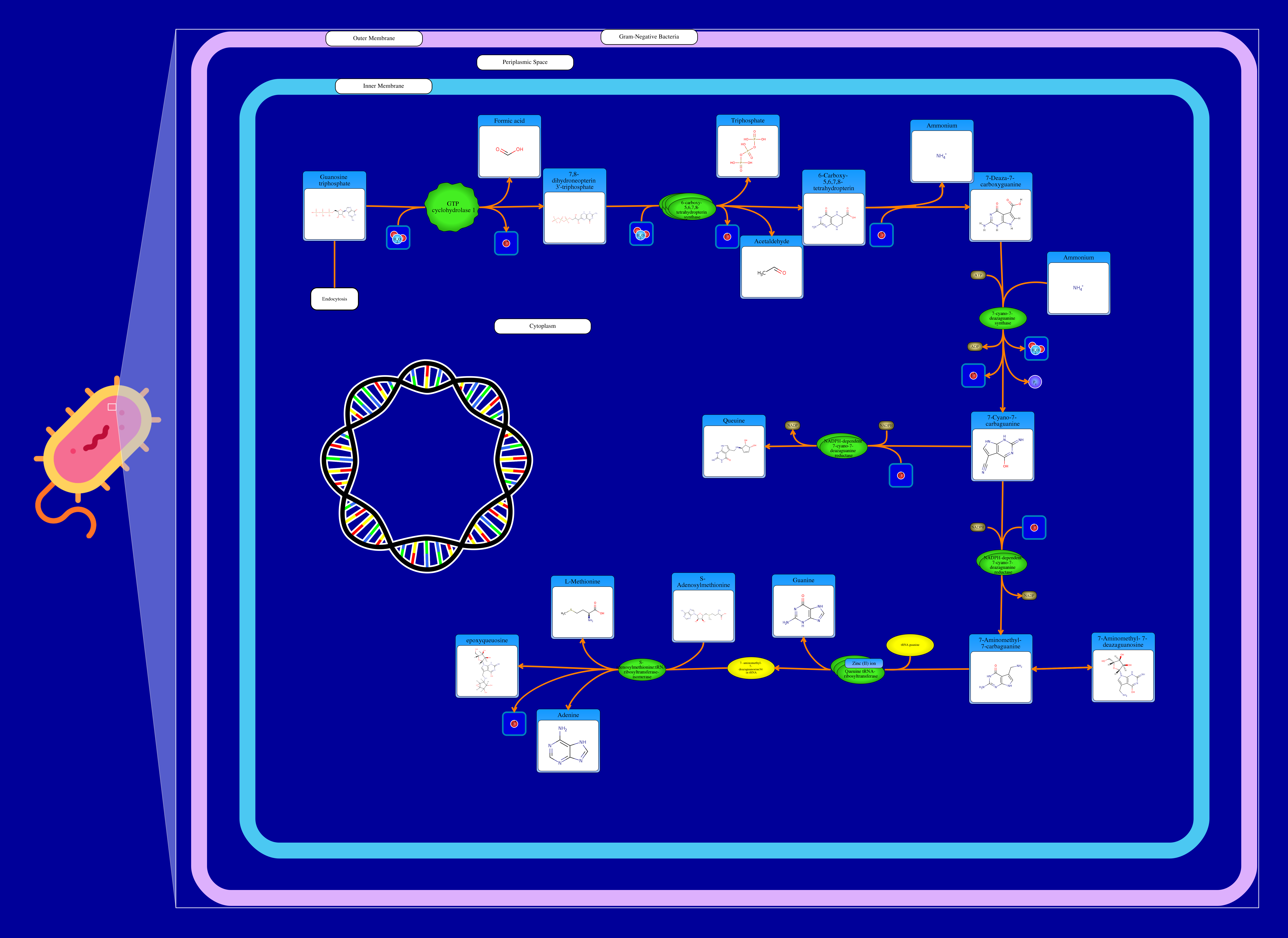 GTP first interacts with water through a GTP cyclohydrolase resulting in the release of a formate, a hydrogen ion and a 7,8-dihydroneopterin 3'-triphosphate. The latter compound then interacts with water through a 6-carboxy-5,6,7,8-tetrahydropterin synthase resulting in a acetaldehyde, triphosphate, 2 hydrogen ion and 6-carboxy-5,6,7,8-tetrahydropterin. The latter compound then reacts spontaneously with a hydrogen ion resulting in the release of a ammonium molecule and a 7-carboxy-7-deazaguanine. This compound then interacts with ATP and ammonium through 7-cyano-7-deazaguanine synthase resulting in the release of water, phosphate, ADP, hydrogen ion and a 7-cyano-7-carbaguanine.