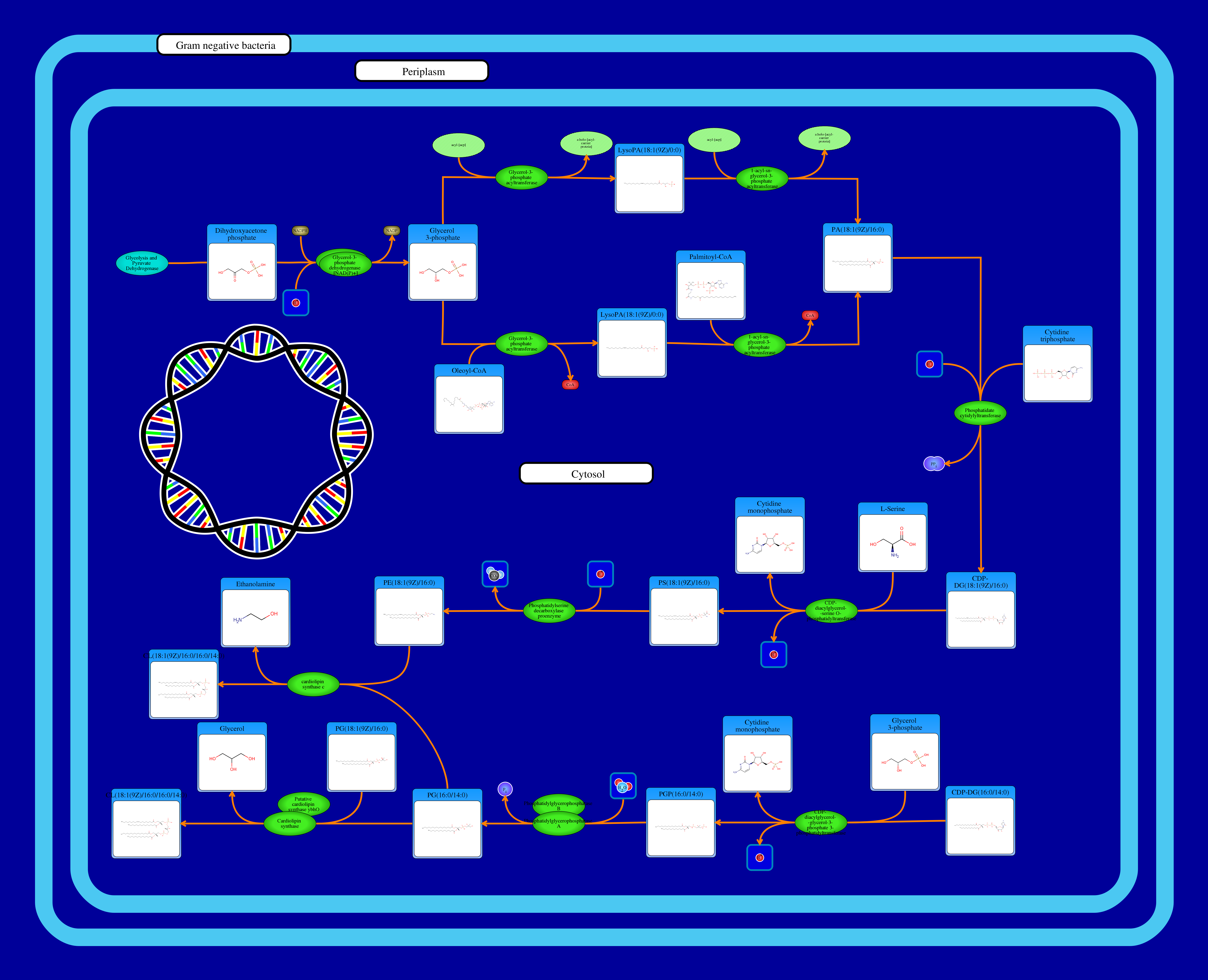Phospholipids are membrane components in E. coli. The major phospholipids of E. coli are phosphatidylethanolamine, phosphatidylglycerol, and cardiolipin. All phospholipids contain sn-glycerol-3-phosphate esterified with fatty acids at the sn-1 and sn-2 positions. The reaction starts from a glycerone phosphate (dihydroxyacetone phosphate) produced in glycolysis. The glycerone phosphate is transformed into an sn-glycerol 3-phosphate (glycerol 3 phosphate) by NADPH-driven glycerol-3-phosphate dehydrogenase. sn-Glycerol 3-phosphate is transformed to a 1-acyl-sn-glycerol 3-phosphate (lysophosphatidic acid). This can be achieved by an sn-glycerol-3-phosphate acyltransferase that interacts either with a long-chain acyl-CoA or with an acyl-[acp]. The 1-acyl-sn-glycerol 3-phosphate is transformed into a 1,2-diacyl-sn-glycerol 3-phosphate (phosphatidic acid) through a 1-acylglycerol-3-phosphate O-acyltransferase. This compound is then converted into a CPD-diacylglycerol through a CTP phosphatidate cytididyltransferase. CPD-diacylglycerol can be transformed either into an L-1-phosphatidylserine or an L-1-phosphatidylglycerol-phosphate through a phosphatidylserine synthase or a phosphatidylglycerophosphate synthase, respectively. The L-1-phosphatidylserine transforms into L-1-phosphatidylethanolamine through a phosphatidylserine decarboxylase. On the other hand, L-1-phosphatidylglycerol-phosphate gets transformed into an L-1-phosphatidyl-glycerol through a phosphatidylglycerophosphatase. These 2 products combine to produce a cardiolipin and an ethanolamine. The L-1 phosphatidyl-glycerol can also interact with cardiolipin synthase resulting in a glycerol and a cardiolipin.