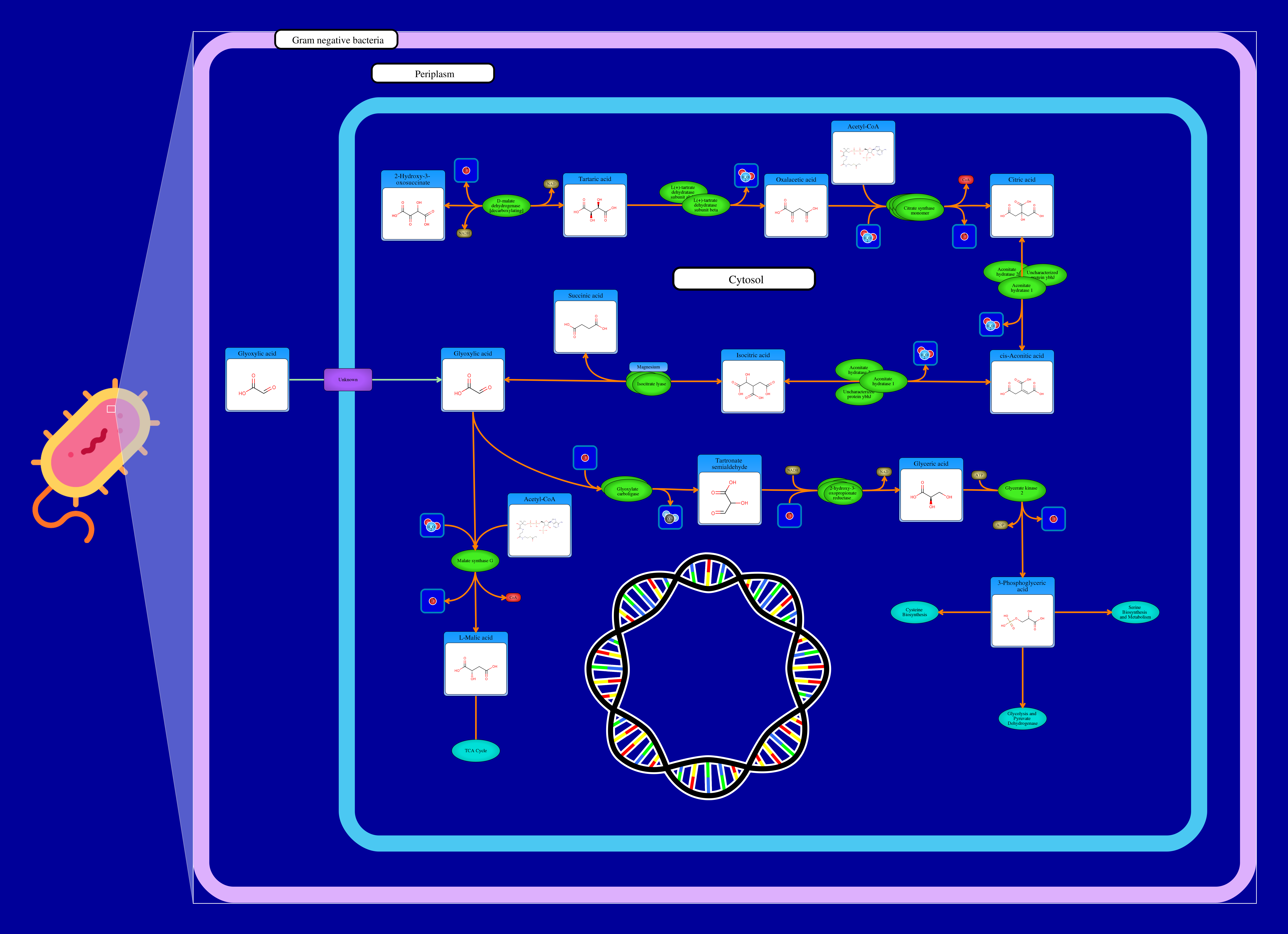 Oxaloglycolate (2-Hydroxy-3-oxosuccinate) interacts with a tartrate dehydrogenase resulting in a L-tartrate. L-tartrate then interacts with tartrate dehydrogenase resulting in a Oxaloacetate. Oxaloacetate and acetyl-coa interact to result in a citrate which is processed by a aconitate hydratase resulting in a cis-Aconitate and further more into a isocitrate which will eventually be procressed into a glyoxylic acid. Glyoxylic acid can either be metabolized into L-malic acid by a reaction with acetyl-CoA and Water through a malate synthase G which also releases hydrogen ion and Coenzyme A. L-malic acid is then incorporated into the TCA cycle. Glyoxylic acid can also be metabolized by glyoxylate carboligase, releasing a carbon dioxide and tartronate semialdehyde. The latter compound is then reduced by an NADH driven tartronate semialdehyde reductase 2 resulting in glyceric acid. Glyceric acid is phosphorylated by a glycerate kinase 2 resulting in a 3-phosphoglyceric acid. This compound is then integrated into various other pathways: cysteine biosynthesis, serine biosynthesis and glycolysis and pyruvate dehydrogenase.