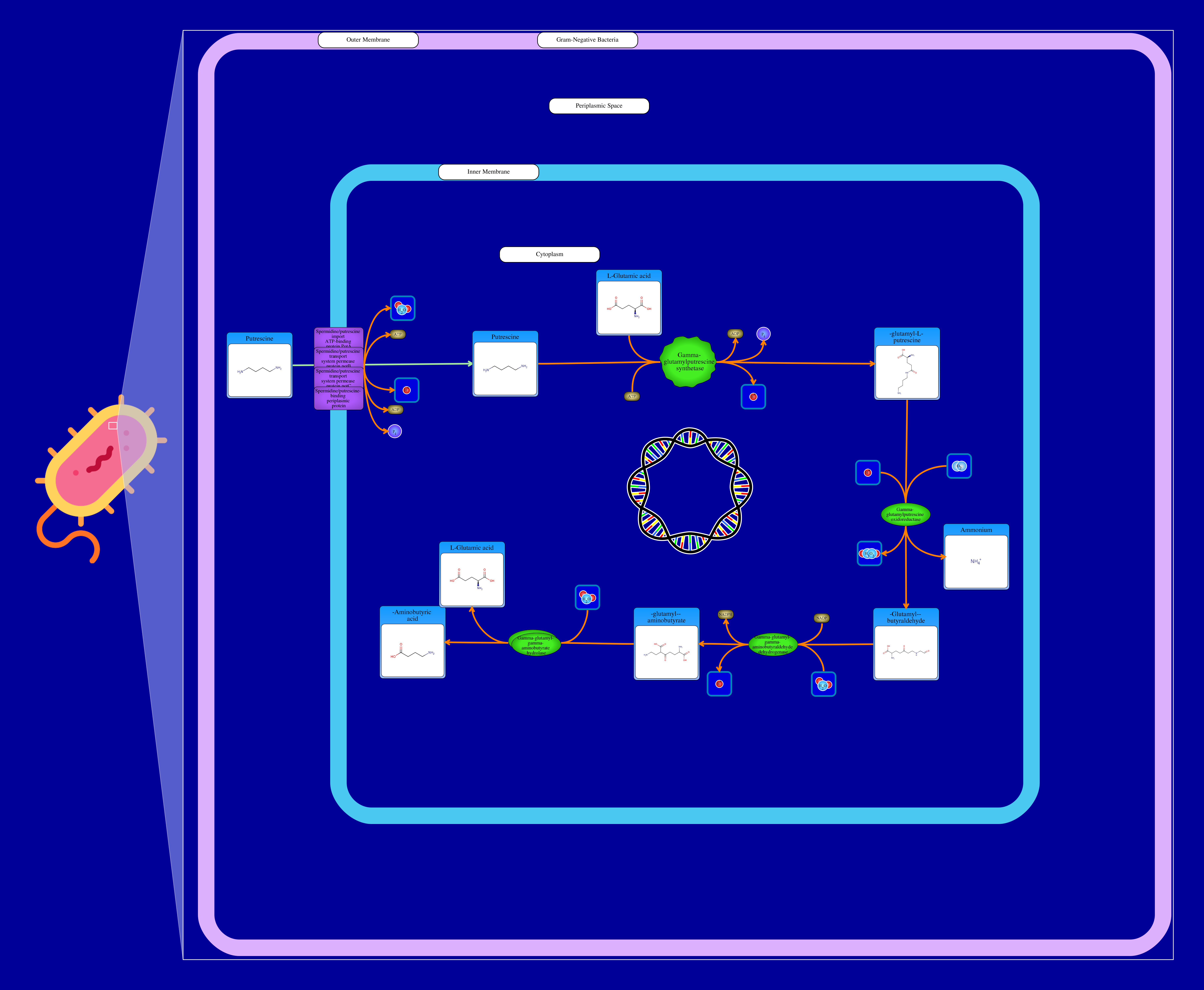 This pathway demonstrates the degradation of extracellular putrescine in E.coli. Putrescine is imported by putrescine transporter (encoded by puuP gene). Putrescine is γ-glutamylated by activation of ATP which generates γ-glutamyl-putrescine, phosphate, and ADP. γ-glutamyl-putrescine is oxidized by gamma-glutamylputrescine oxidoreductase to form γ-glutamyl-γ-butyraldehyde, also produce ammonium and water. Gamma-glutamyl-gamma-aminobutyraldehyde dehydrogenase dehydrogenates γ-glutamyl-γ-butyraldehyde to γ-glutamyl-γ-aminobutyrate, which is then dehydrogenated into γ-Aminobutyric acid and L-Glutamic acid by γ-glutamyl-γ-aminobutyrate hydrolase.