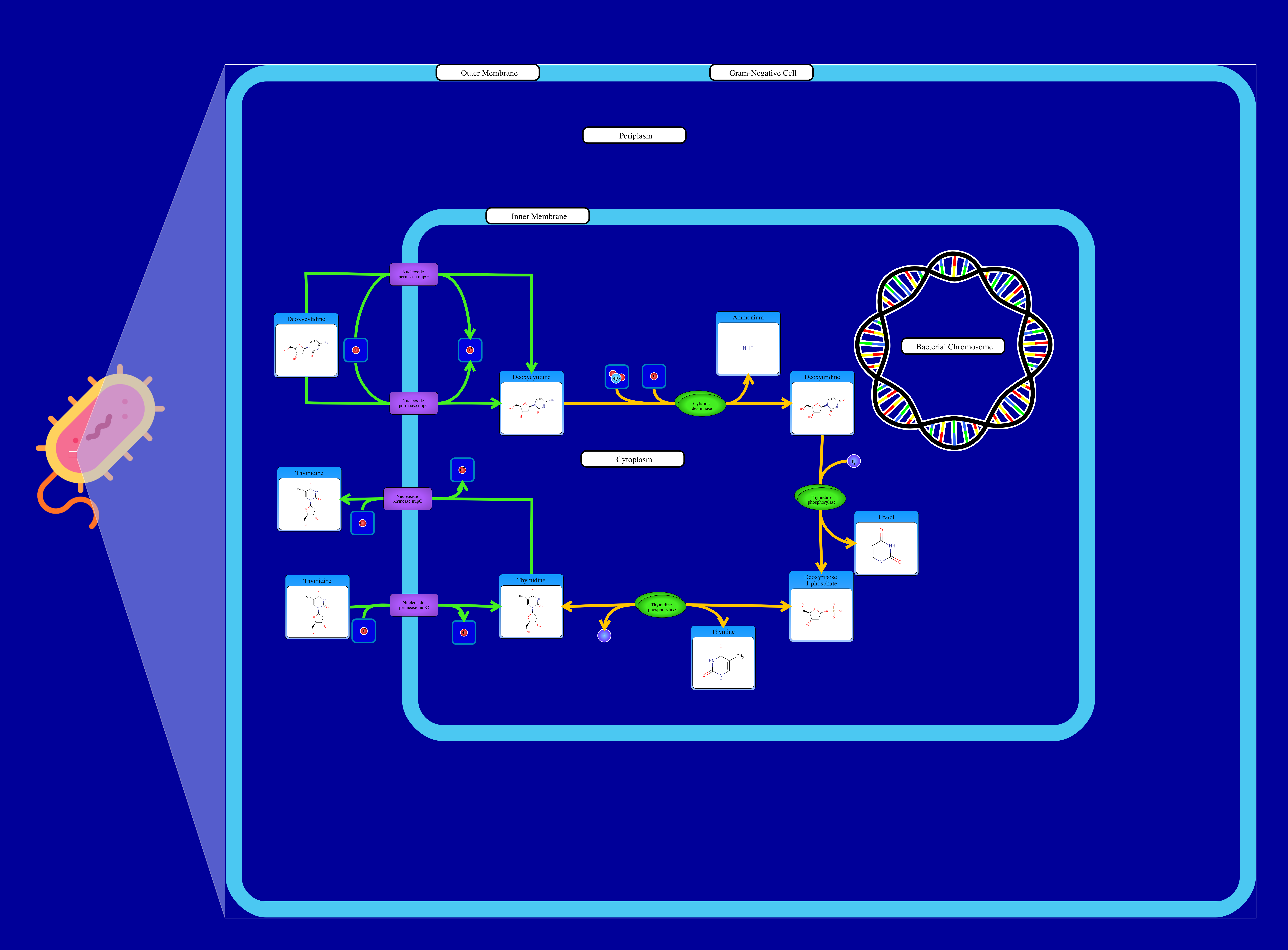The degradation of thymidine starts with thymidine being introduced into the cytosol through either a nupG or nupC symporter.