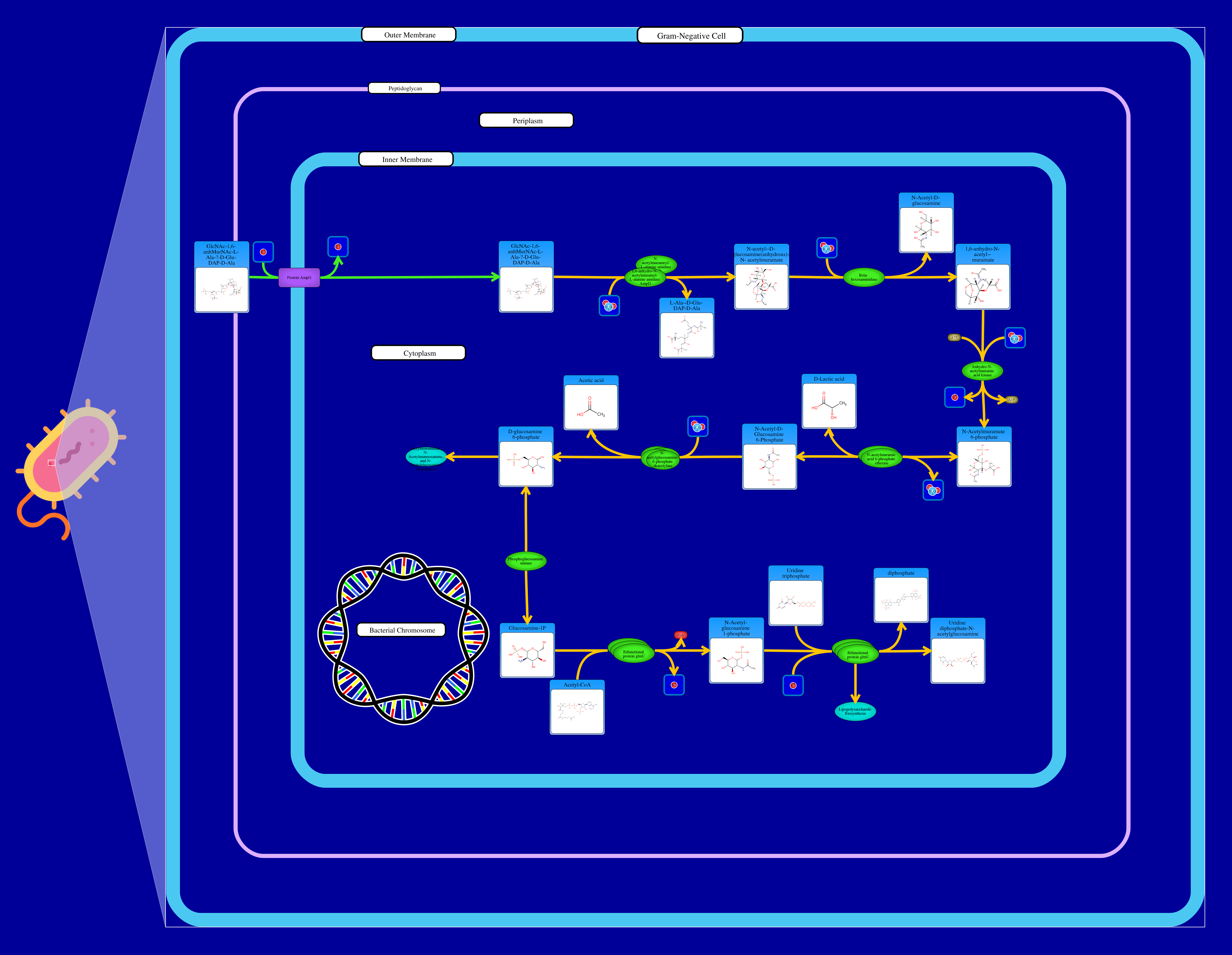 Most bacteria, including Escherichia coli, are composed of murein which protects and stabilizes the cell wall. Over half of the murein is broken down by Escherichia coli and recycled for the next generation. The main muropeptide is GlcNAc-anhydro-N-acetylmuramic acid (anhMurNAc)-l-Ala-γ-d-Glu-meso-Dap-d-Ala which enters the cytoplasm by AmpG protein. The peptide is then released from the muropeptide. 1,6-Anhydro-N-acetylmuramic acid (anhMurNAc) is recycled by its conversion to N-acetylglucosamine-phosphate (GlcNAc-P). The sugar is phosphorylated by anhydro-N-acetylmuramic acid kinase (AnmK) to produce MurNAc-P. Etherase cleaves MurNAc-P to produce N-acetyl-D-glucosamine 6-phosphate. The product can undergo further degradation or be recycled into peptidoglycan monomers. The pathway's final product is a peptidoglycan biosynthesis precursor, UDP-N-acetyl-α-D-muramate. The enzyme muropeptide ligase (mpl), attaches the recovered Ala-Glu-DAP tripeptide to the precursor UDP-N-acetyl-α-D-muramate to return to the peptide to the peptidoglycan biosynthetic pathway to synthesize the cell wall.