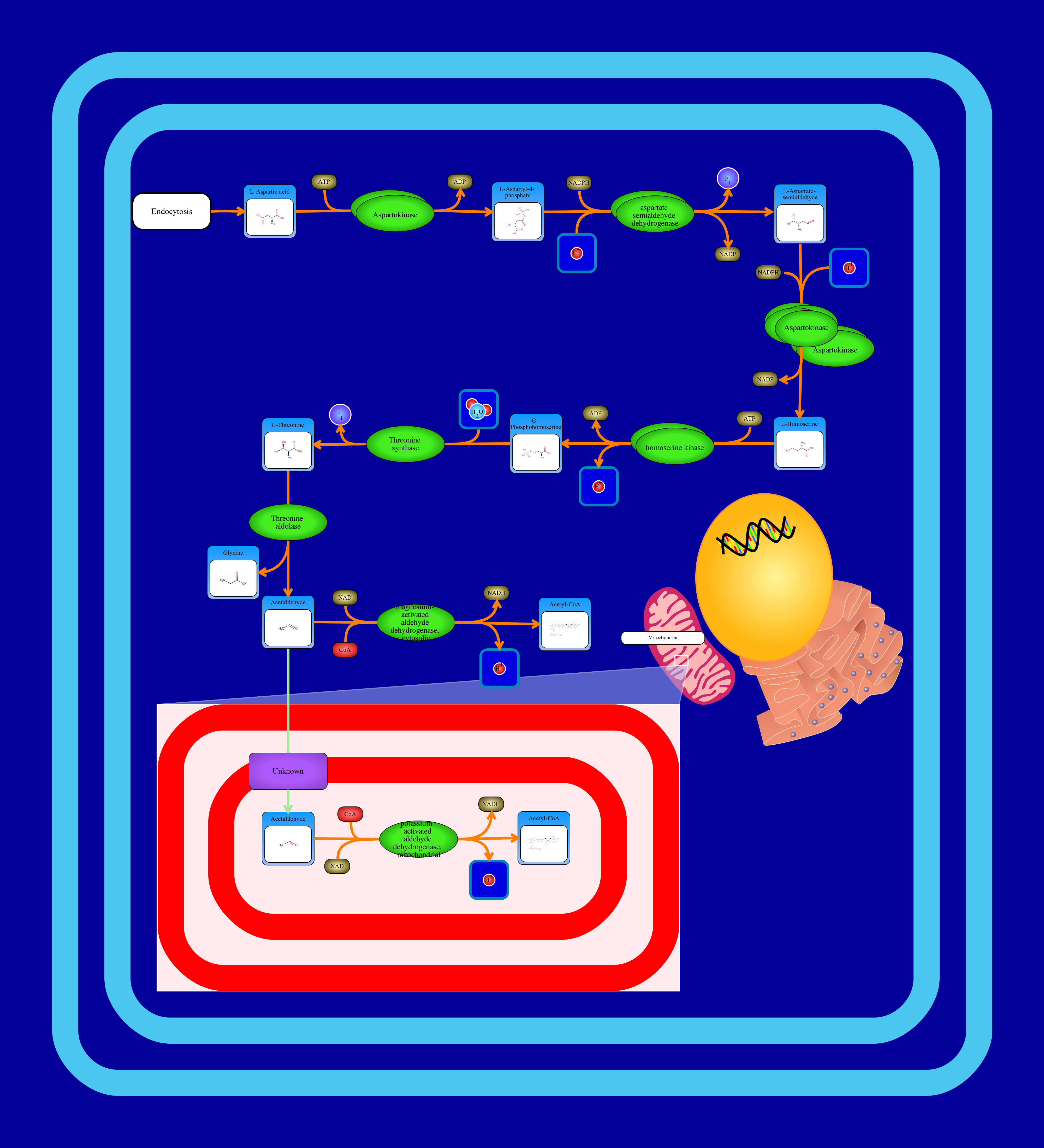 The biosynthesis of threonine starts with L-aspartic acid being phosphorylated by an ATP-driven aspartate kinase resulting in a release of an ADP and an L-aspartyl-4-phosphate. This compound interacts with a hydrogen ion through an NADPH-driven aspartate semialdehyde dehydrogenase resulting in the release of a phosphate, an NADP, and an L-aspartate-semialdehyde. The latter compound interacts with a hydrogen ion through an NADPH-driven aspartate kinase / homoserine dehydrogenase resulting in the release of an NADP and an L-homoserine. L-Homoserine is phosphorylated through an ATP driven homoserine kinase resulting in the release of an ADP, a hydrogen ion, and an O-phosphohomoserine. The latter compound then interacts with a water molecule threonine synthase resulting in the release of a phosphate and an L-threonine. L-threonine is degraded into glycine and acetaldehyde by reacting with a threonine aldolase. Acetaldehyde can then be integrated into the mitochondria or stay in the cytosol. It is then degraded into acetyl-CoA through an aldehyde dehydrogenase.