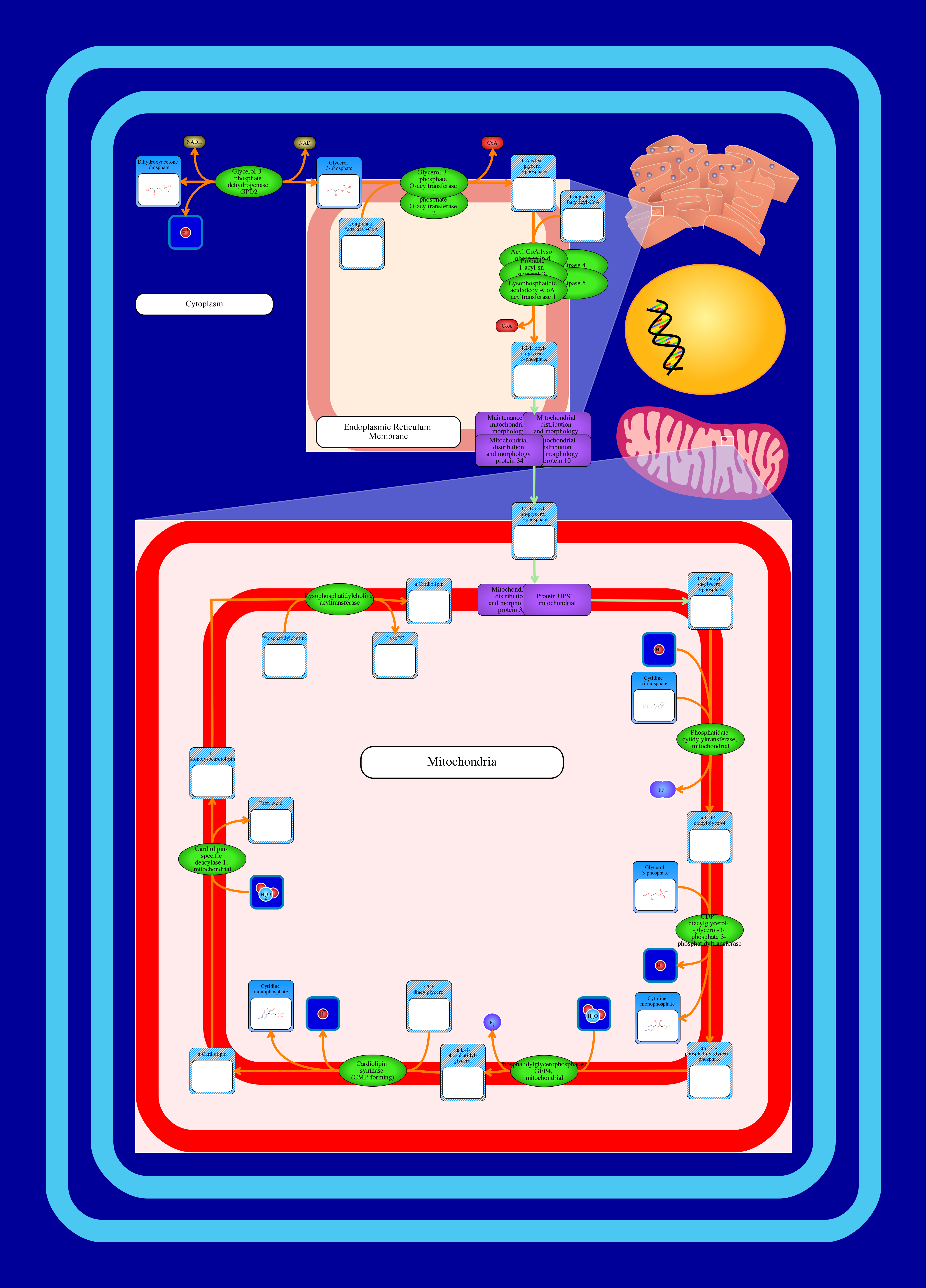The biosynthesis of cardiolipin (CL) begins in the endoplasmic reticulum. Glycerone phosphate interacts with an NADPH resulting in the release of NADP and glycerol 3-phosphate. Glycerol 3-phosphate reacts with glycerol-3-phosphate O-acyltransferase resulting in the release of 1-acyl-sn-glycerol 3-phosphate (lysophosphatidic acid or LysoPA). The resulting compound reacts with an acyl-CoA via lysophosphatidate acyltransferase, resulting in the release of a phosphatidic acid (PA or 1,2-diacyl-sn-glycerol 3-phosphate). Phosphatidic acid is transported to the mitochondrial outer membrane. Once in, it gets transported into the mitochondrial inner membrane. The phosphatidic acid reacts with cytidine triphosphate through a phosphatidate cytidyltransferase resulting in the release of a CDP-diacylglycerol (CDP-DG). The resulting compound reacts with a glycerol 3-phosphate through a CDP-diacylglycerol-glycerol-3-phosphate 3-phosphatidyltransferase resulting in the release of cytidine monophosphate and phosphatidylglycerophosphate (PGP). PGP reacts with phosphatidylglycerophosphatase GEP4 resulting in the release of phosphatidylglycerol (PG). PG reacts with a CDP-DG through a cardiolipin synthase resulting in the release of CL and cytidine monophosphate. Cardiolipin remodelling begins with the removal of an acyl chain to form 1-monolysocardiolipin (1-MLCL) via the lipase Cld1p. This is followed by the enzyme Taz1p transferring an acyl chain from a phospholipid (e.g. phosphatidylcholine) to reform cardiolipin.