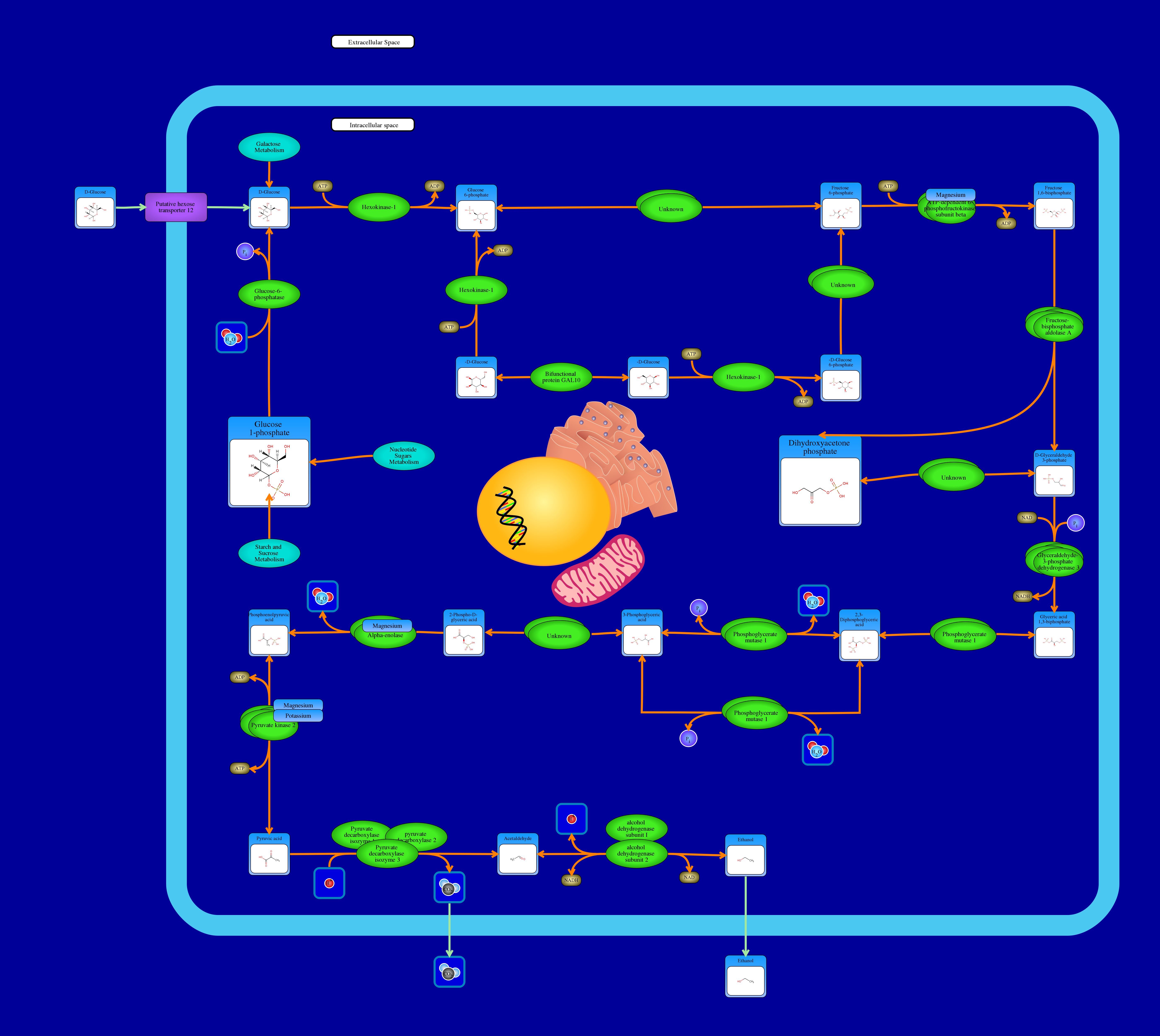 Enter relative concentration values (without units). Elements will be highlighted in a color gradient where red = lowest concentration and green = highest concentration. For the best results, view the pathway in Black and White.
