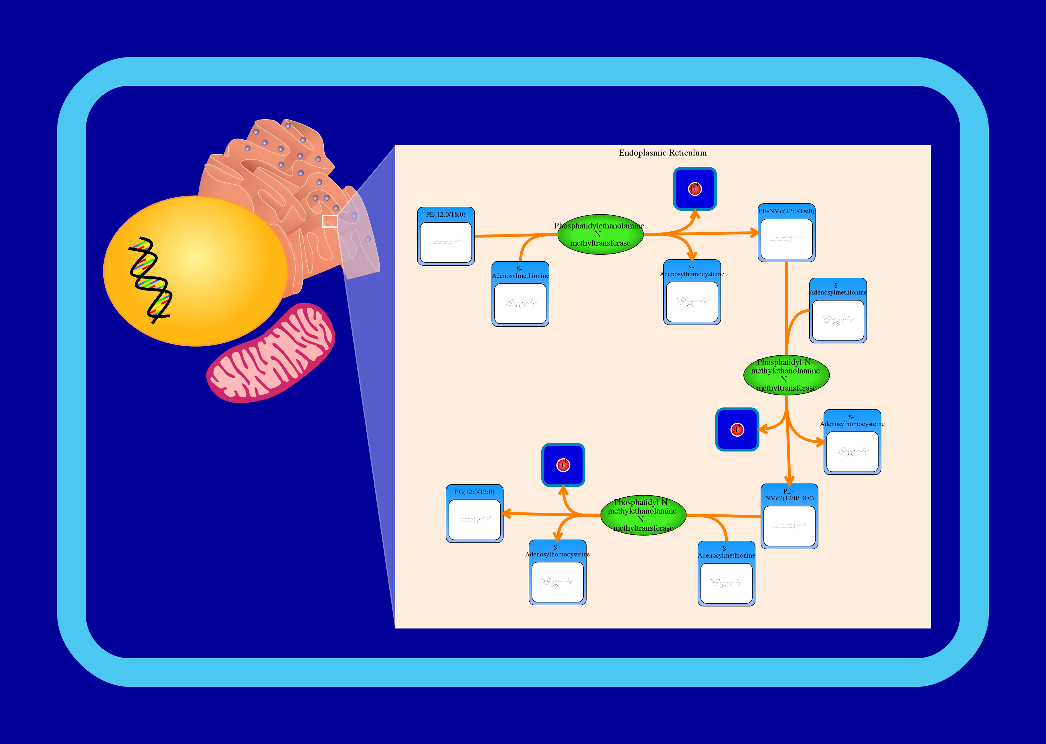 Phosphatidyl ethanolamine reacts with S-adenosylmethionine through a phosphatdylethanolamine N-methyltransferase resulting in the release of hydrogen ion and S-adenosylhomocysteine an a PE-NMe. The PE-NMe reacts with S'-adenosylmethionine through a phosphotidyl-N-methylethanolamine N-methyltransferase resulting in the release of hydrogen ion, s-adenosylhomocysteine and PE-NMe2. The PE-NMe2 reacts with s-adenosylmethionine through a phosphotidyl-N-methylethanolamine N-methyltransferase resuilting in the release of hydrogen ion, s-adenosylhomocysteine and PC