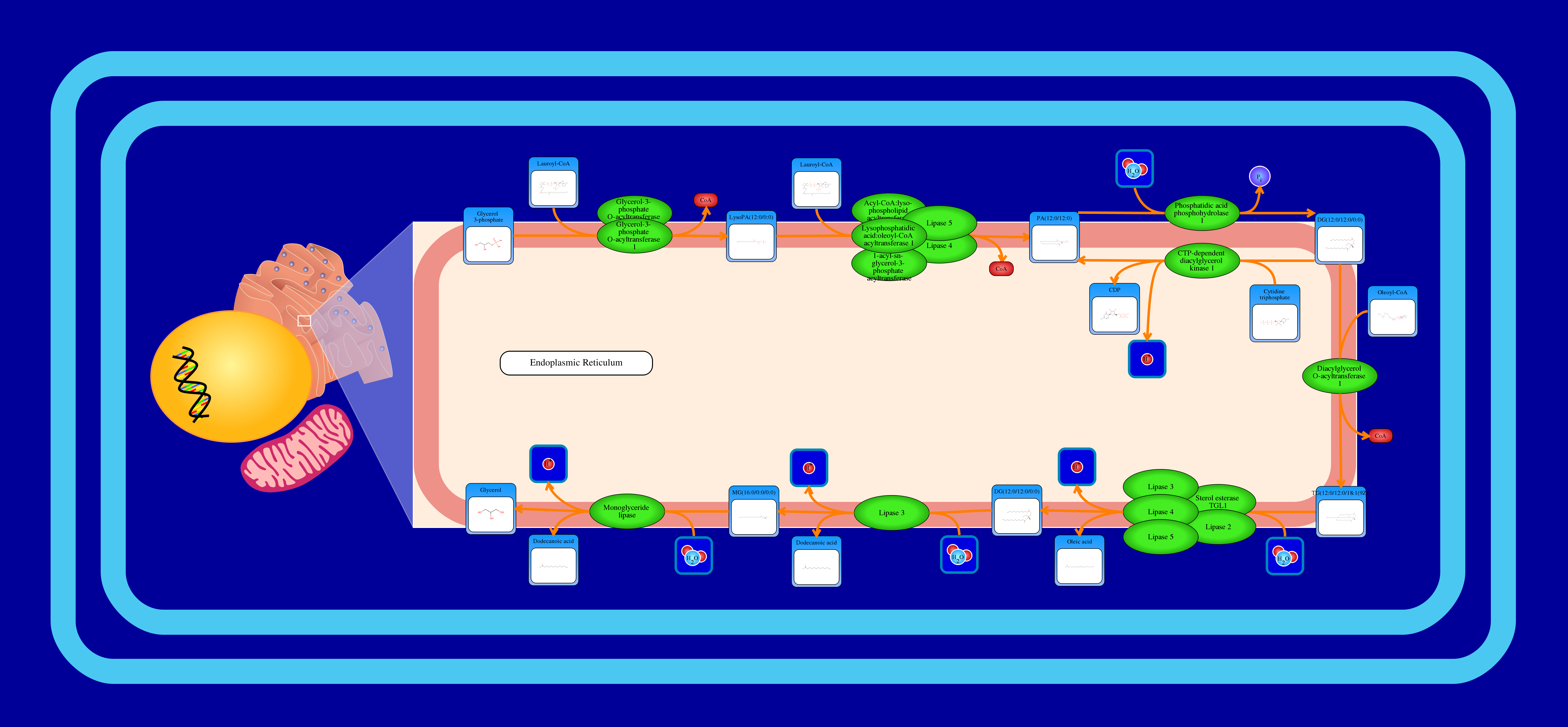 A triglyceride (TG, triacylglycerol, TAG, or triacylglyceride) is an ester derived from glycerol and three fatty acids. The biosynthesis of triacylglycerol is localized to the endoplasmic reticulum membrane and starts with glycerol 3-phosphate reacting with acyl-CoA through a glycerol-3-phosphate O-acyltransferase resulting in the release of lysophosphatidic acid (LPA). This, in turn, reacts with an acyl-CoA through a lipase complex resulting in the release of CoA and phosphatidic acid. Phosphatidic acid reacts with water through a phosphatidic acid phosphohydrolase 1 resulting in the release of a phosphate and a diacylglycerol. This reaction can be reversed through a CTP-dependent diacylglycerol kinase. The diacylglycerol reacts in the endoplasmic reticulum with an acyl-CoA through a diacylglycerol O-acyltransferase resulting in the release of coenzyme A and a triacylglycerol. Triacylglycerol metabolism begins with a reaction with water through lipase resulting in the release of a fatty acid, hydrogen ion, and a diacylglycerol. Diacylglycerol then reacts with a lipase 3 resulting in the release of a fatty acid and a monoacylglycerol. Monoacylglycerol reacts with monoglyceride lipase resulting in the release of a fatty acid in glycerol.