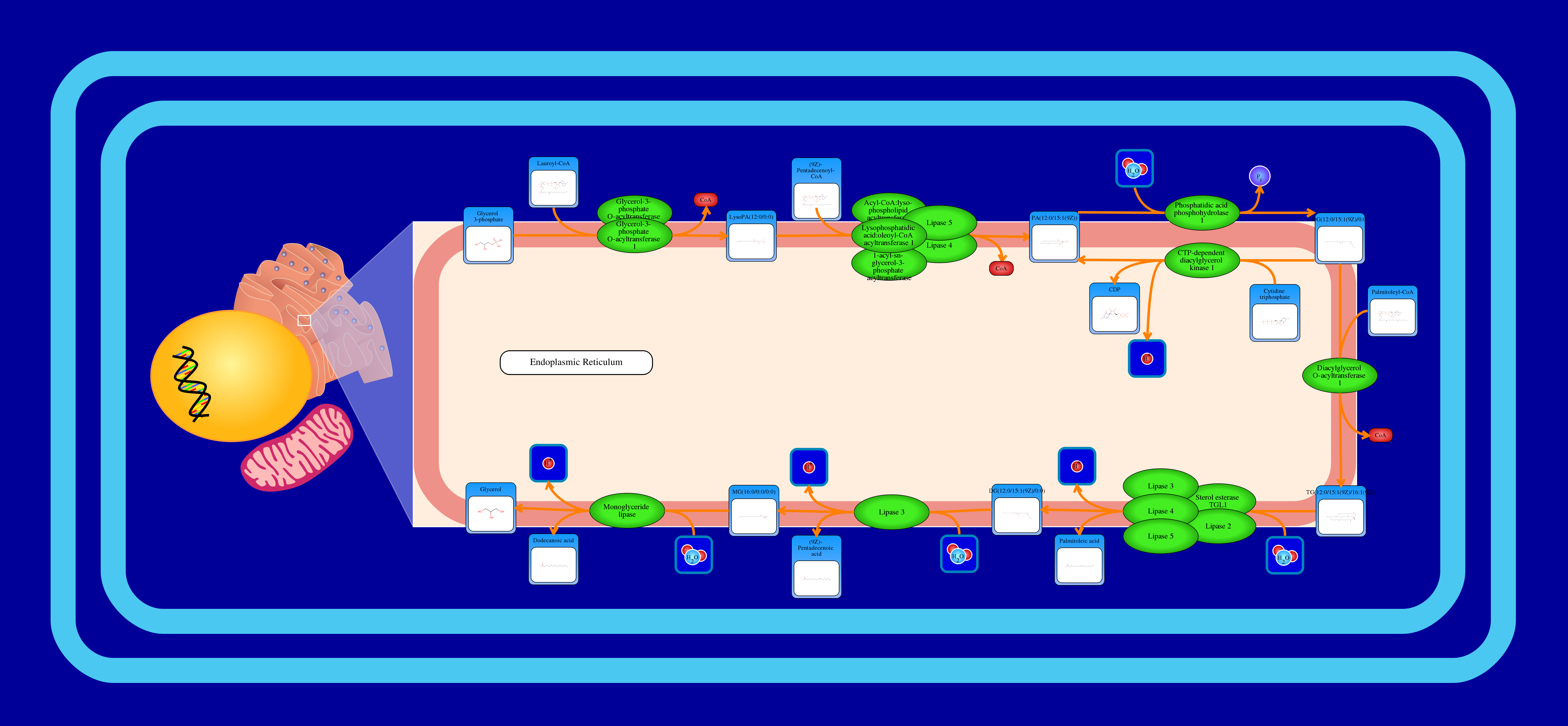A triglyceride (TG, triacylglycerol, TAG, or triacylglyceride) is an ester derived from glycerol and three fatty acids. The biosynthesis of triacylglycerol is localized to the endoplasmic reticulum membrane and starts with glycerol 3-phosphate reacting with acyl-CoA through a glycerol-3-phosphate O-acyltransferase resulting in the release of lysophosphatidic acid (LPA). This, in turn, reacts with an acyl-CoA through a lipase complex resulting in the release of CoA and phosphatidic acid. Phosphatidic acid reacts with water through a phosphatidic acid phosphohydrolase 1 resulting in the release of a phosphate and a diacylglycerol. This reaction can be reversed through a CTP-dependent diacylglycerol kinase. The diacylglycerol reacts in the endoplasmic reticulum with an acyl-CoA through a diacylglycerol O-acyltransferase resulting in the release of coenzyme A and a triacylglycerol. Triacylglycerol metabolism begins with a reaction with water through lipase resulting in the release of a fatty acid, hydrogen ion, and a diacylglycerol. Diacylglycerol then reacts with a lipase 3 resulting in the release of a fatty acid and a monoacylglycerol. Monoacylglycerol reacts with monoglyceride lipase resulting in the release of a fatty acid in glycerol.