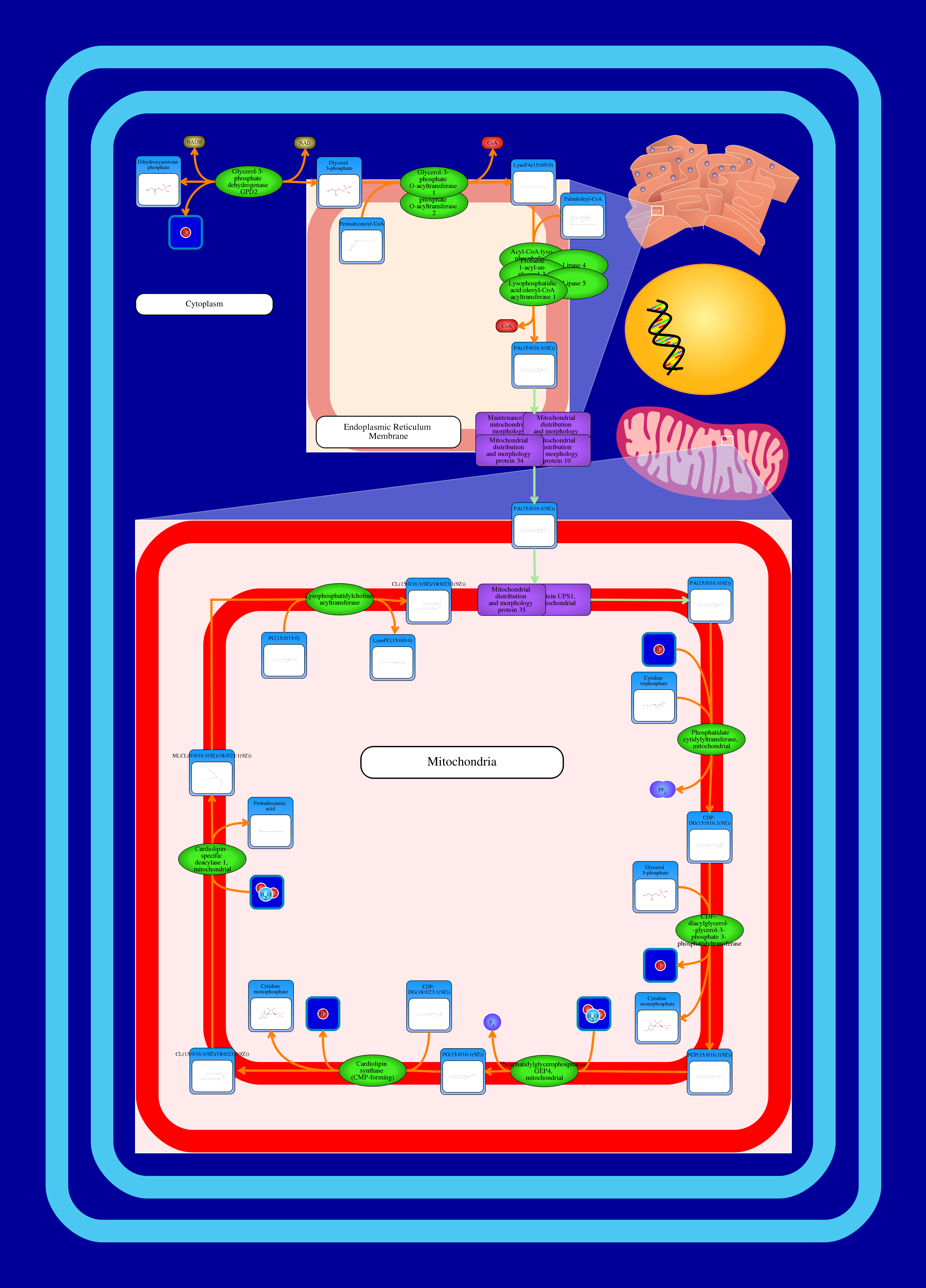 The biosynthesis of cardiolipin (CL) begins in the endoplasmic reticulum. Glycerone phosphate interacts with an NADPH resulting in the release of NADP and glycerol 3-phosphate. Glycerol 3-phosphate reacts with glycerol-3-phosphate O-acyltransferase resulting in the release of 1-acyl-sn-glycerol 3-phosphate (lysophosphatidic acid or LysoPA). The resulting compound reacts with an acyl-CoA via lysophosphatidate acyltransferase, resulting in the release of a phosphatidic acid (PA or 1,2-diacyl-sn-glycerol 3-phosphate). Phosphatidic acid is transported to the mitochondrial outer membrane. Once in, it gets transported into the mitochondrial inner membrane. The phosphatidic acid reacts with cytidine triphosphate through a phosphatidate cytidyltransferase resulting in the release of a CDP-diacylglycerol (CDP-DG). The resulting compound reacts with a glycerol 3-phosphate through a CDP-diacylglycerol-glycerol-3-phosphate 3-phosphatidyltransferase resulting in the release of cytidine monophosphate and phosphatidylglycerophosphate (PGP). PGP reacts with phosphatidylglycerophosphatase GEP4 resulting in the release of phosphatidylglycerol (PG). PG reacts with a CDP-DG through a cardiolipin synthase resulting in the release of CL and cytidine monophosphate. Cardiolipin remodelling begins with the removal of an acyl chain to form 1-monolysocardiolipin (1-MLCL) via the lipase Cld1p. This is followed by the enzyme Taz1p transferring an acyl chain from a phospholipid (e.g. phosphatidylcholine) to reform cardiolipin.