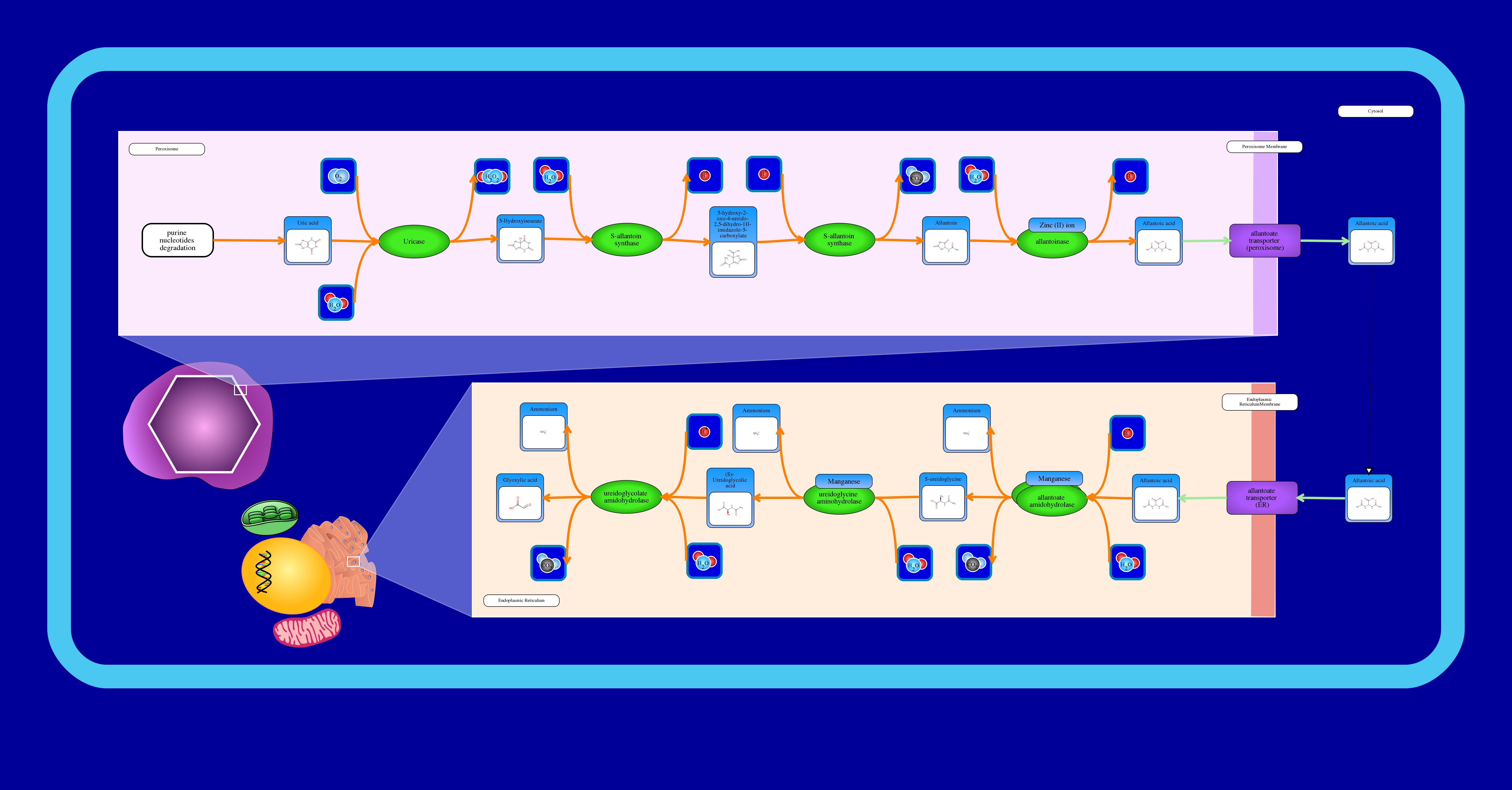 Purine nucleotides are eventually degraded to ammonia and carbon dioxide. This pathway begins in the peroxisome and follows the degradation a urate intermediate to glyoxylate. The last three steps take place in the endoplasmic reticulum. First, uricase converts urate into 5-hydroxyisourate. Steps two and three are catalyzed by the bifunctional enzyme S-allantoin synthase: the conversion of 5-hydroxyisourate into 5-hydroxy-2-oxo-4-ureido-2,5-dihydro-1H-imidazole-5-carboxylate (OHCU) and the conversion of OHCU into S-allantoin. Fourth, allantoinase requires zinc ion as a cofactor to catalyze the conversion of S-allantoin into allantoate. Next allantoate must be transported out of the peroxisome and into the endoplasmic reticulum. Fifth, allantoate amidohydrolase catalyzes the conversion of allantoate into S-ureidoglycine. This enzyme is a homodimer and requires manganese ion as a cofactor. Sixth, ureidoglycine aminohydrolase requires a manganese ion as a cofactor to catalyze the conversion of S-ureidoglycine into S-ureidoglycolate. Seventh, ureidoglycolate amidohydrolase catalyzes the conversion of S-ureidoglycolate into glyoxylate.