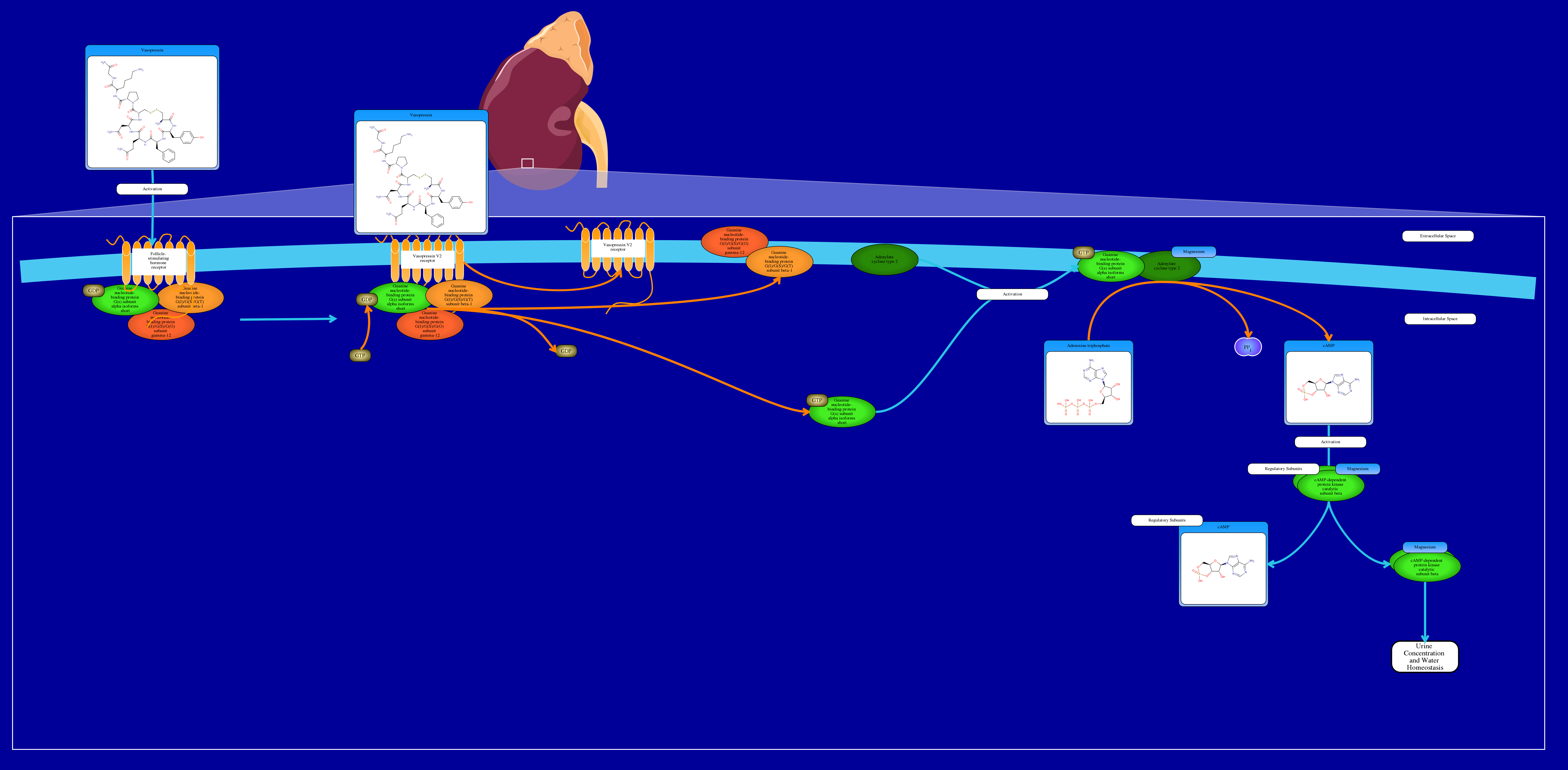 Vasopressin (aka Antidiuretic hormone) activates both follicle-stimulating hormone receptor as well as the V2 receptor G protein complex. From this complex, Guanine nucleotide binding protein G(s) protein reacts with Adenylate Cyclase Type 2, Adeonsine Triphosphate, as well as GTP and magnesium to produce cAMP and Pyrophosphate. cAMP then activates PKA (protein kinase A) which leads to changes in the concentration of water in urine.