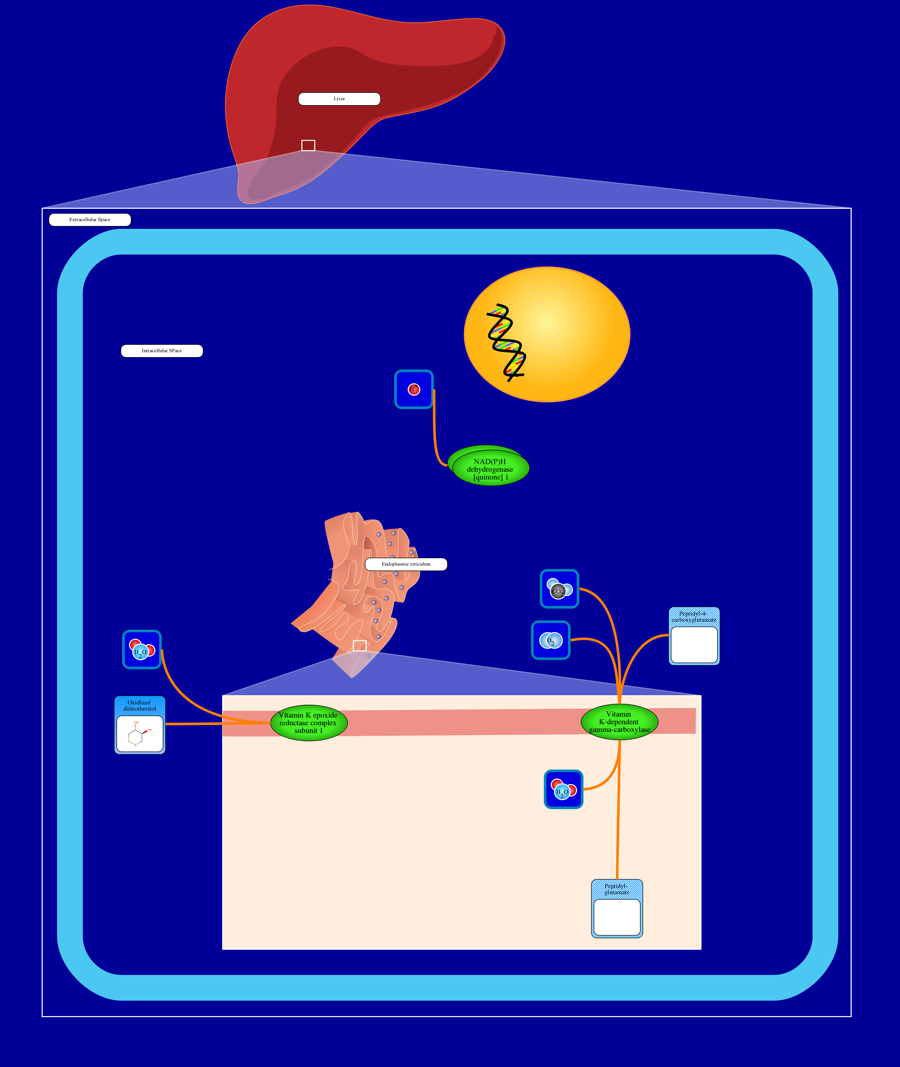 Vitamin K describes a group of lipophilic, hydrophobic vitamins that exist naturally in two forms (and synthetically in three others): vitamin K1, which is found in plants, and vitamin K2, which is synthesized by bacteria. Vitamin K is an important dietary component because it is necessary as a cofacter in the activation of vitamin K dependent proteins. Metabolism of vitamin K occurs mainly in the liver. In the first step, vitamin K is reduced to its quinone form by a quinone reductase such as NAD(P)H dehydrogenase. Reduced vitamin K is the form required to convert vitamin K dependent protein precursors to their active states. It acts as a cofactor to the integral membrane enzyme vitamin K-dependent gamma-carboxylase (along with water and carbon dioxide as co-substrates), which carboxylates glutamyl residues to gamma-carboxy-glutamic acid residues on certain proteins, activating them. Each converted glutamyl residue produces a molecule of vitamin K epoxide, and certain proteins may have more than one residue requiring carboxylation. To complete the cycle, the vitamin K epoxide is returned to vitamin K via the vitamin K epoxide reductase enzyme, also an integral membrane protein. The vitamin K dependent proteins include a number of important coagulation factors, such as prothrombin. Thus, warfarin and other coumarin drugs act as anticoagulants by blocking vitamin K epoxide reductase.