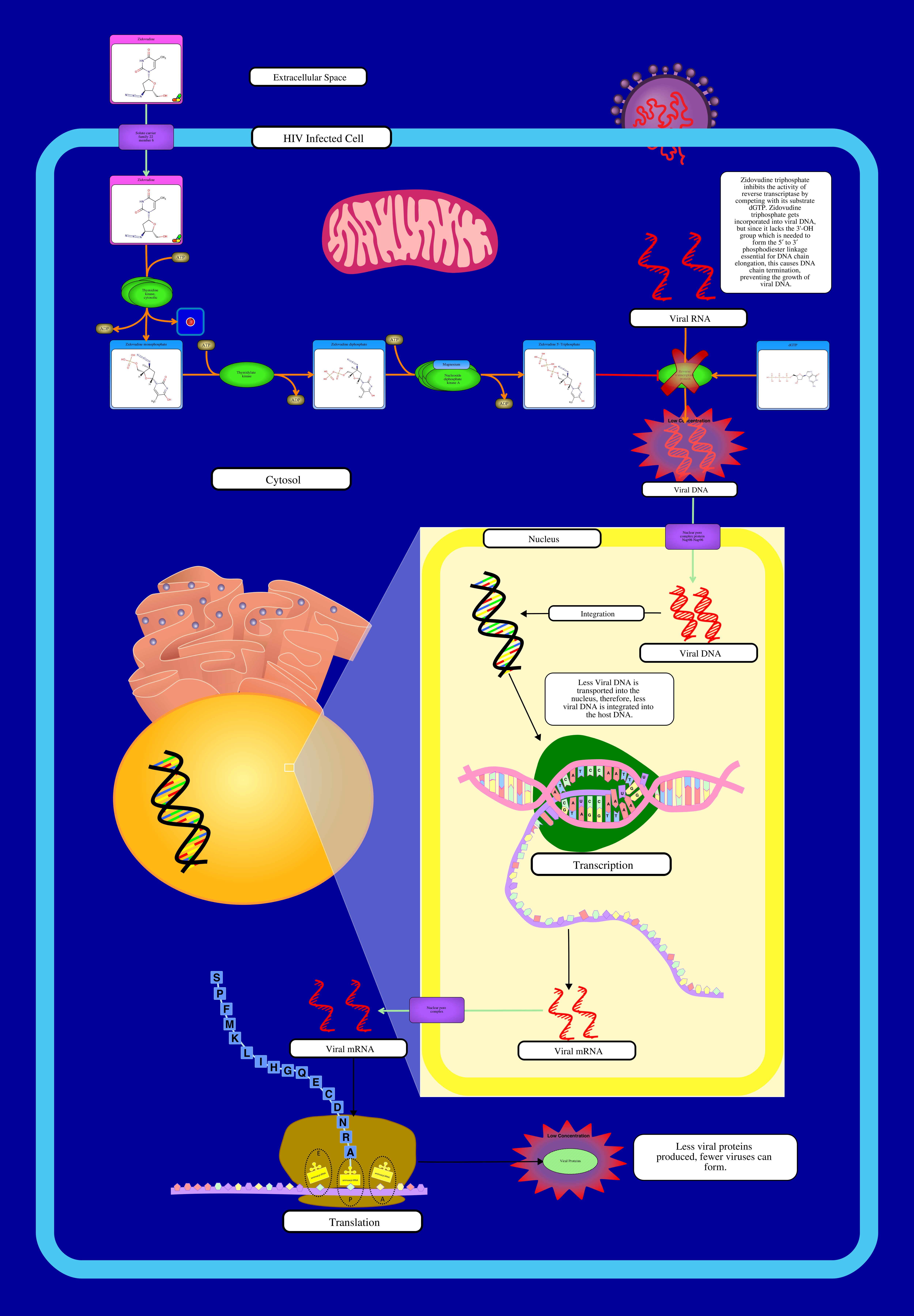 Zidovudine enters the cell via solute carrier family 22 member 6 and is converted into zidovudine monophosphate by thymidine kinase. Thymidylate kinase then converts zidovudine monophosphate into zidovudine diphosphate. Zidovudine diphosphate is metabolized to zidovudine triphosphate via nucleoside diphosphate kinase A.