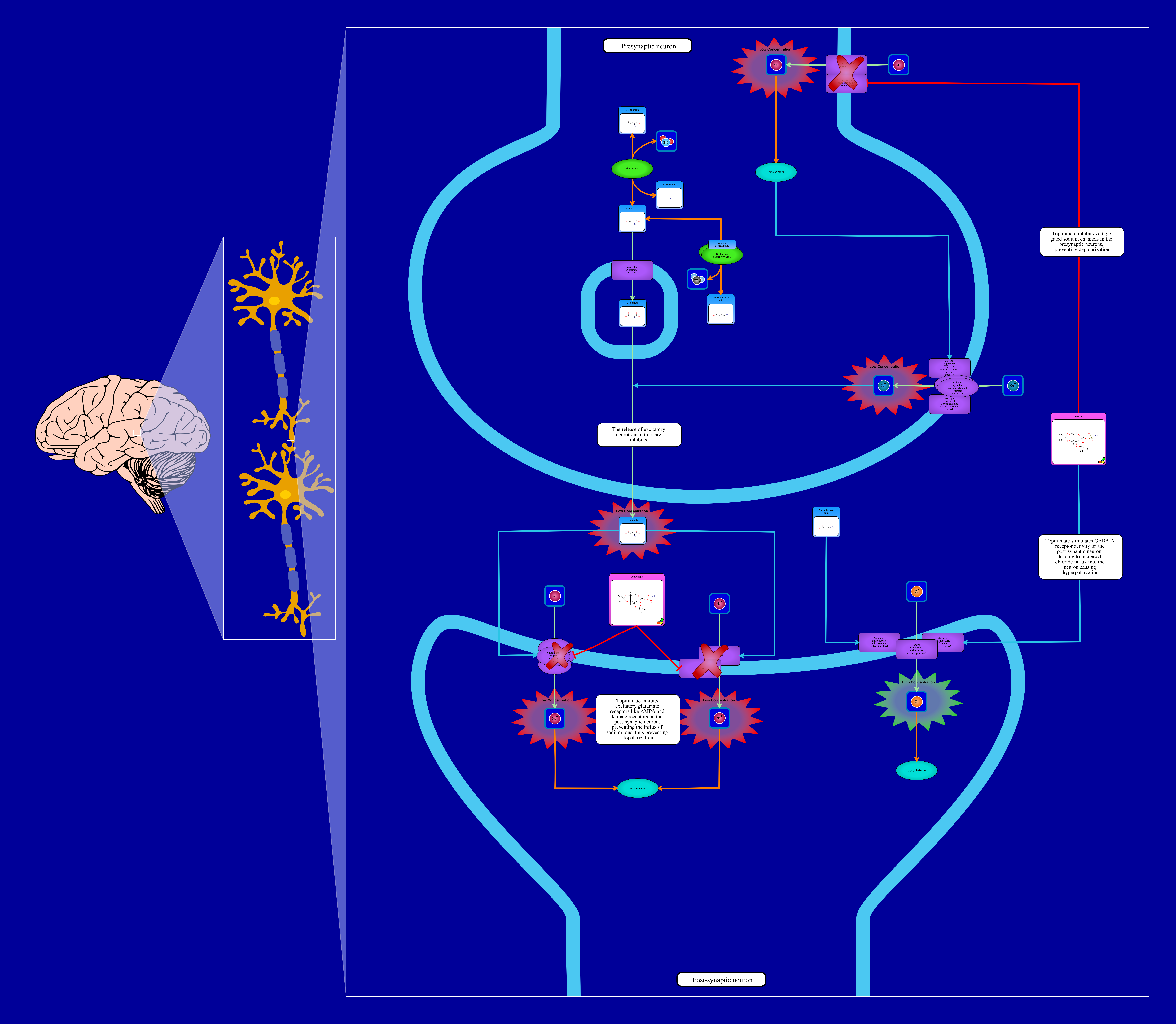 Topiramate inhibits excitatory neurotransmitter activity by antagonizing AMPA and kainate glutamate receptors on the post synaptic membrane. These receptors are ligand gated ion channels, once bound to glutamate, the allow the influx of sodium ions into the post-synaptic neuron leading to depolarization and neuronal excitation. By antagonizing these glutamate receptors, topiramate prevents depolarization of the post-synaptic receptors. Topiramate may also prevent glutamate release from pre-synaptic neurons. This occurs by topiramate inhibiting voltage gated sodium channels in the presynaptic neuron, these sodium channels are responsible for allow sodium ion influx into the presynaptic neuron and depolarization. Depolarization leads to the opening of L-type voltage gated calcium channels at the neuronal terminal. This leads to the influx of calcium ions which stimulate the release of glutmate via exocytosis. By inhibiting the voltage gates sodium channels, depolarization in the presynaptic neurons is prevented, thus preventing calcium channel activation, calcium influx and glutamate release. Topiramate may also enhance the activity of GABA-A receptors on post synaptic neurons. GABA-A receptors, when activated, lead to the influx of negative chloride ions causing hyperpolarization and neuronal inhibition.