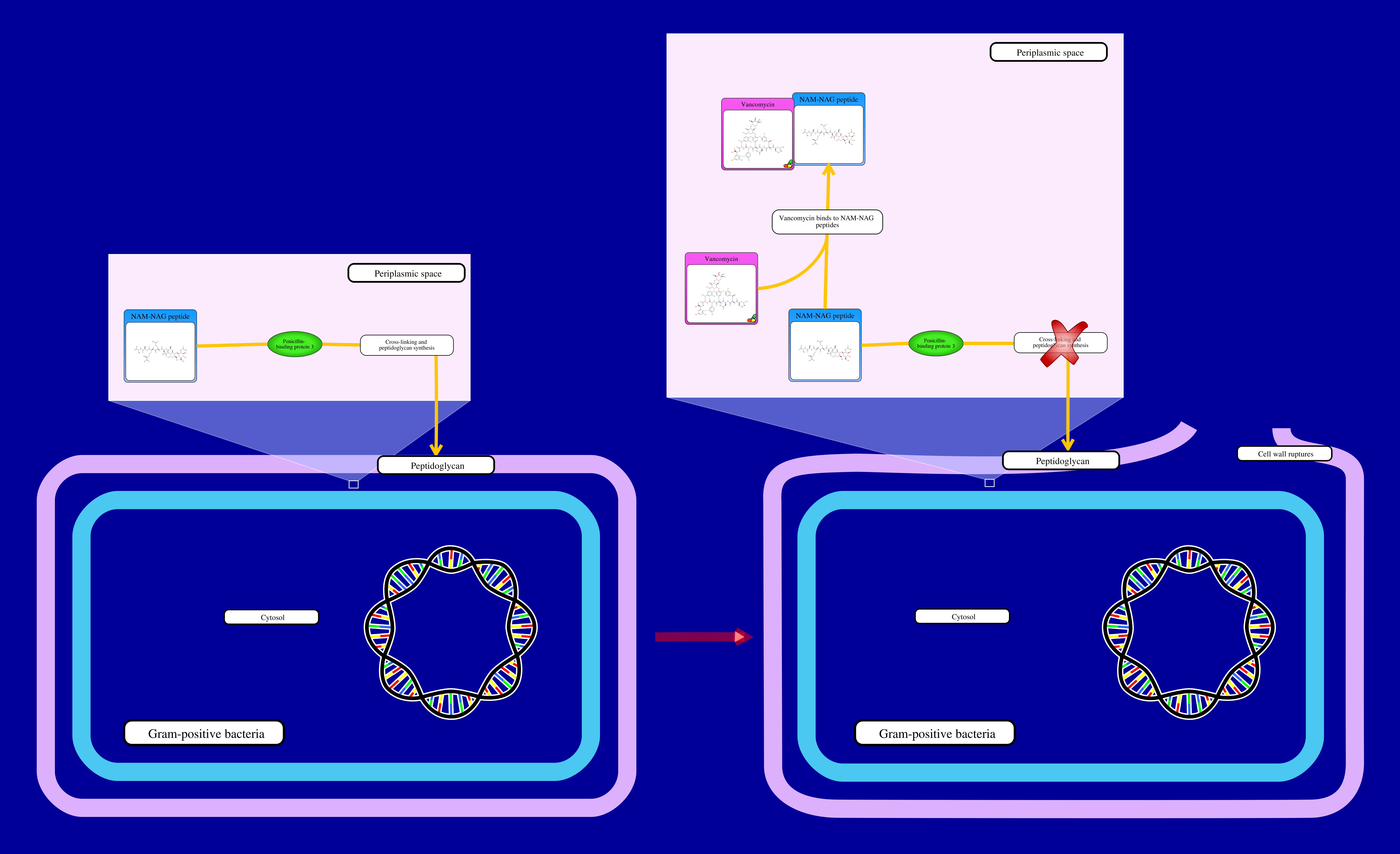 Vancomycin is a glycopeptide antibiotic used to treat severe but susceptible bacterial infections such as MRSA (methicillin-resistant Staphylococcus aureus) infections. Administered intravenously, vancomycin is indicated in adult and pediatric patients for the treatment of septicemia, infective endocarditis, skin and skin structure infections, bone infections, and lower respiratory tract infections. Administered orally, vancomycin is indicated in adult and pediatric patients for the treatment of Clostridium difficile-associated diarrhea and for enterocolitis caused by Staphylococcus aureus (including methicillin-resistant strains). The bactericidal action of vancomycin results primarily from inhibition of cell-wall biosynthesis. Specifically, vancomycin prevents incorporation of N-acetylmuramic acid (NAM)- and N-acetylglucosamine (NAG)-peptide subunits from being incorporated into the peptidoglycan matrix, which forms the major structural component of Gram-positive cell walls. Vancomycin forms hydrogen bonds with the terminal D-alanyl-D-alanine moieties of the NAM/NAG-peptides, preventing the incorporation of the NAM/NAG-peptide subunits into the peptidoglycan matrix. Vancomycin may also alter bacterial-cell-membrane permeability and RNA synthesis. Vancomycin is not active in vitro against gram-negative bacilli, mycobacteria, or fungi.