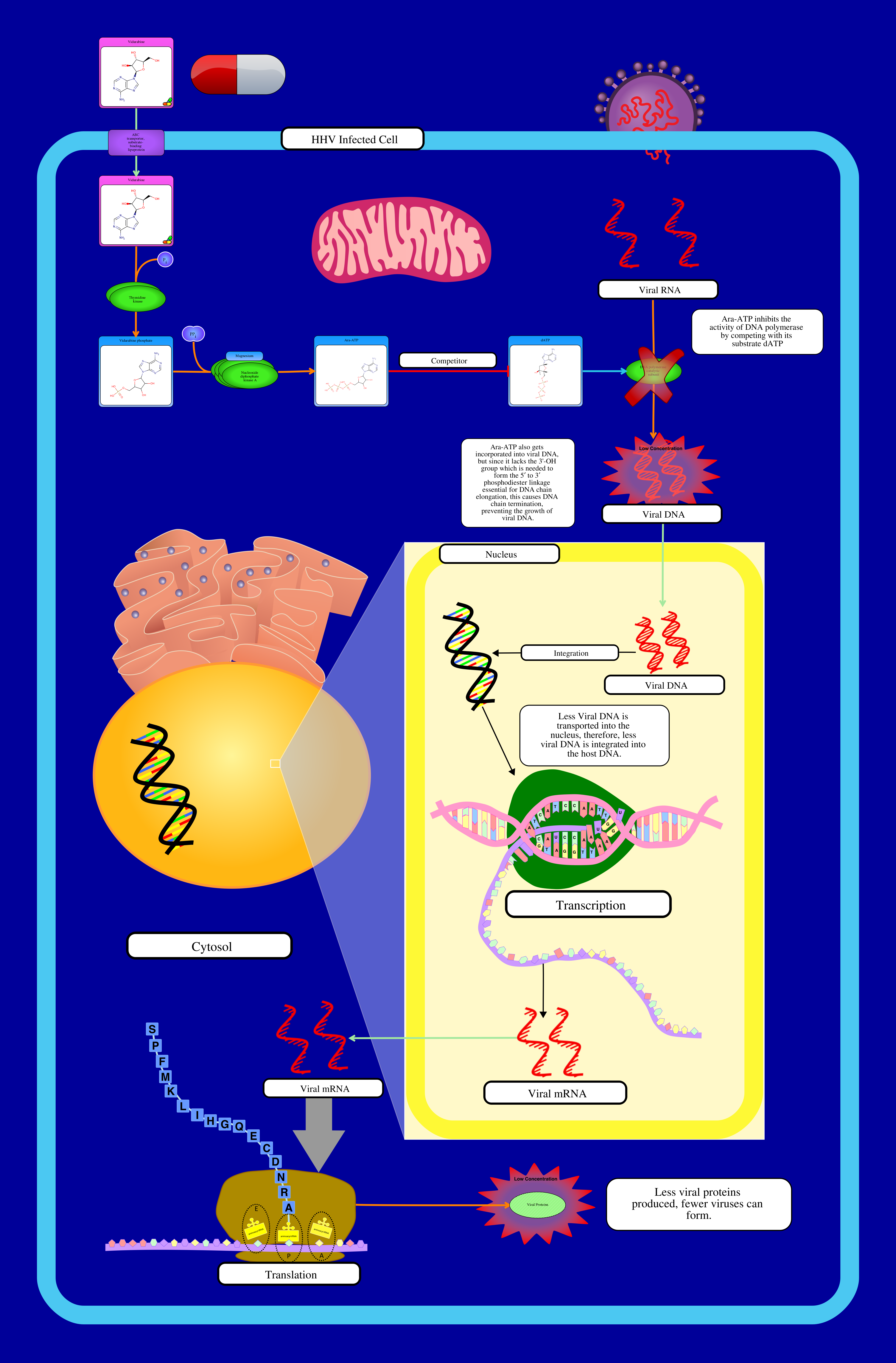 Vidarabine stops replication of herpes viral DNA by either competitive inhibition of viral DNA polymerase, and consequently or incorporation into and termination of the growing viral DNA chain. Vidarabine is sequentially phosphorylated by kinases to the triphosphate ara-ATP, which is the active form of vidarabine that acts as both an inhibitor and a substrate of viral DNA polymerase.Ara-ATP inhibits the activity of DNA polymerase by competing with its substrate dATP. Ara-ATP also gets incorporated into viral DNA, but since it lacks the 3'-OH group which is needed to form the 5′ to 3′ phosphodiester linkage essential for DNA chain elongation, this causes DNA chain termination, preventing the growth of viral DNA.