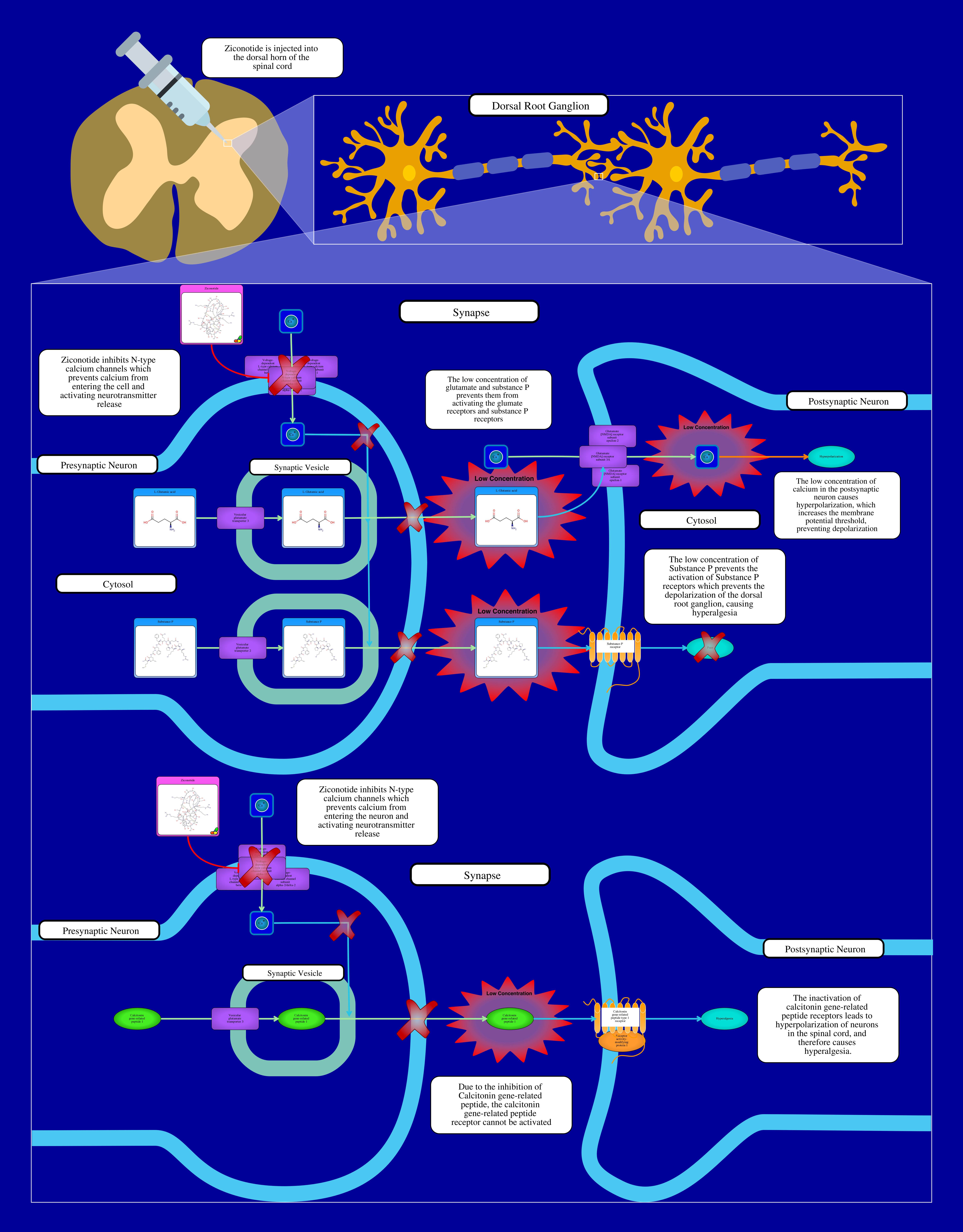 Ziconotide inhibits Voltage-dependent N-type calcium channels in presynaptic neurons. This prevents calcium from entering the neuron which prevents neurotransmitter release from the dorsal root ganglion as well as other nociceptive neurons. Therefore substance P, CGRP, and glutamate are not released into the synapse and cannot activate the substance P receptors, CGRP receptors, or the N-Methyl-D-aspartic acid receptors on the post-synaptic neuron. This causes hyperpolarization, with a down-stream effect of hyperalgesia, a prevention of pain signalling.