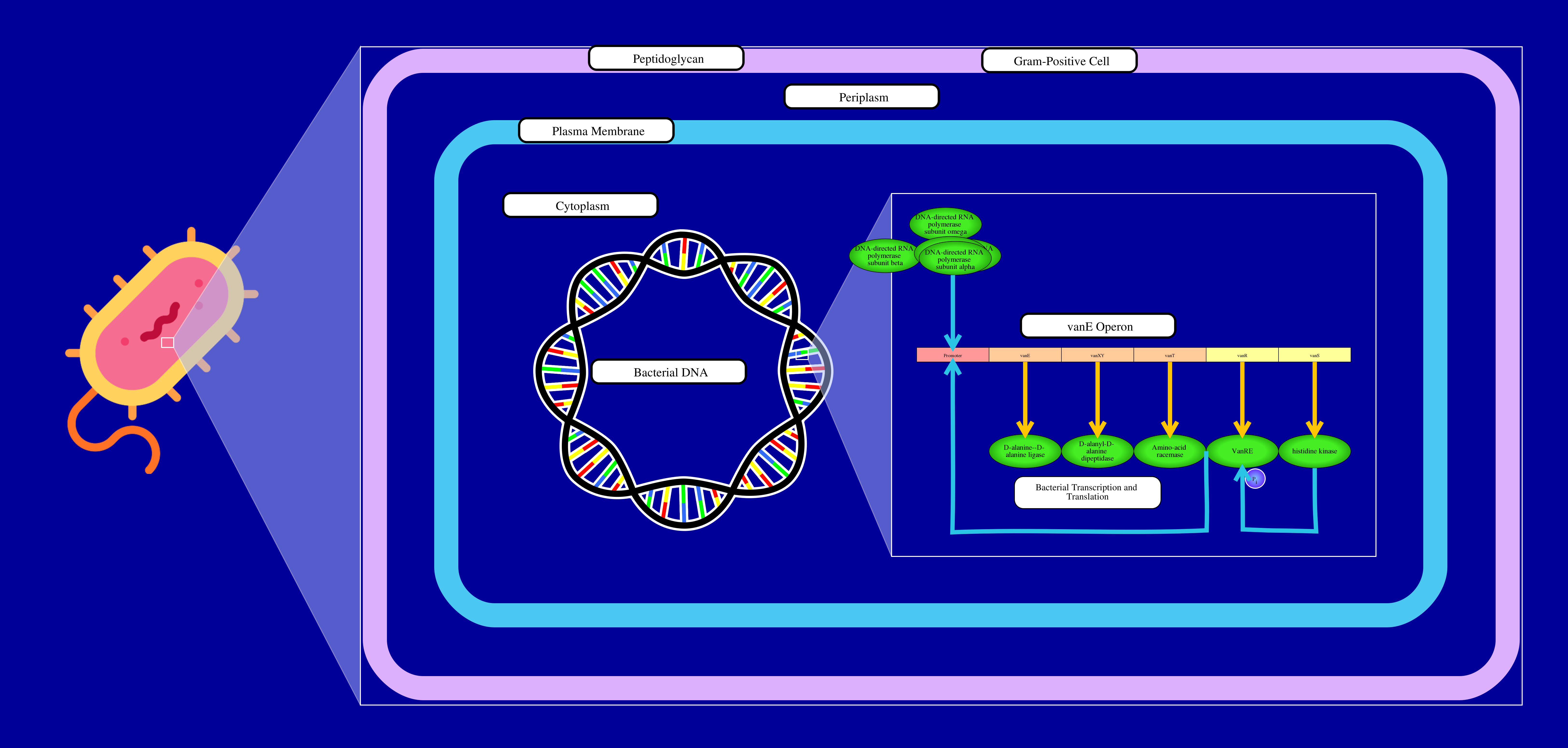 The VanE-type vancomycin resistance pathway enables enterococcal bacteria to resist the action of the glycopeptide antibiotic vancomycin. This pathway involves a series of genes organized in an the VanE operon, which encodes enzymes and regulatory proteins that alter the bacterial cell wall, making it resistant to vancomycin. The operon is made up of 5 genes which can be divided into regulatory (vanR and vanS) and resistance (vanE, vanXY and vanT). The vanR gene is a response regulator that is part of a two-component regulatory system and activates transcription once phosphorylated by histidine kinase that is encoded by vanS, after detecting vancomycin. The VanE gene encodes D-Ala-D-Lac ligase that synthesizes the D-Ala-D-Lac dipeptide, which replaces the normal D-Ala-D-Ala in the peptidoglycan precursor to which vancomycin has less affinity. vanXY gene encodes a bifunctional D,D-dipeptidase and D,D-carboxypeptidase that hydrolyzes any remaining D-Ala-D-Ala dipeptides and removes D-alanine from peptidoglycan precursors (UDP-MurNAc-pentapeptide[d-Ala]), ensuring that only D-Ala-D-Ser is incorporated into the cell wall. Lastly, VanT encodes a serine racemase that is membrane-bound and supplies d-Ser for the synthesis pathway.