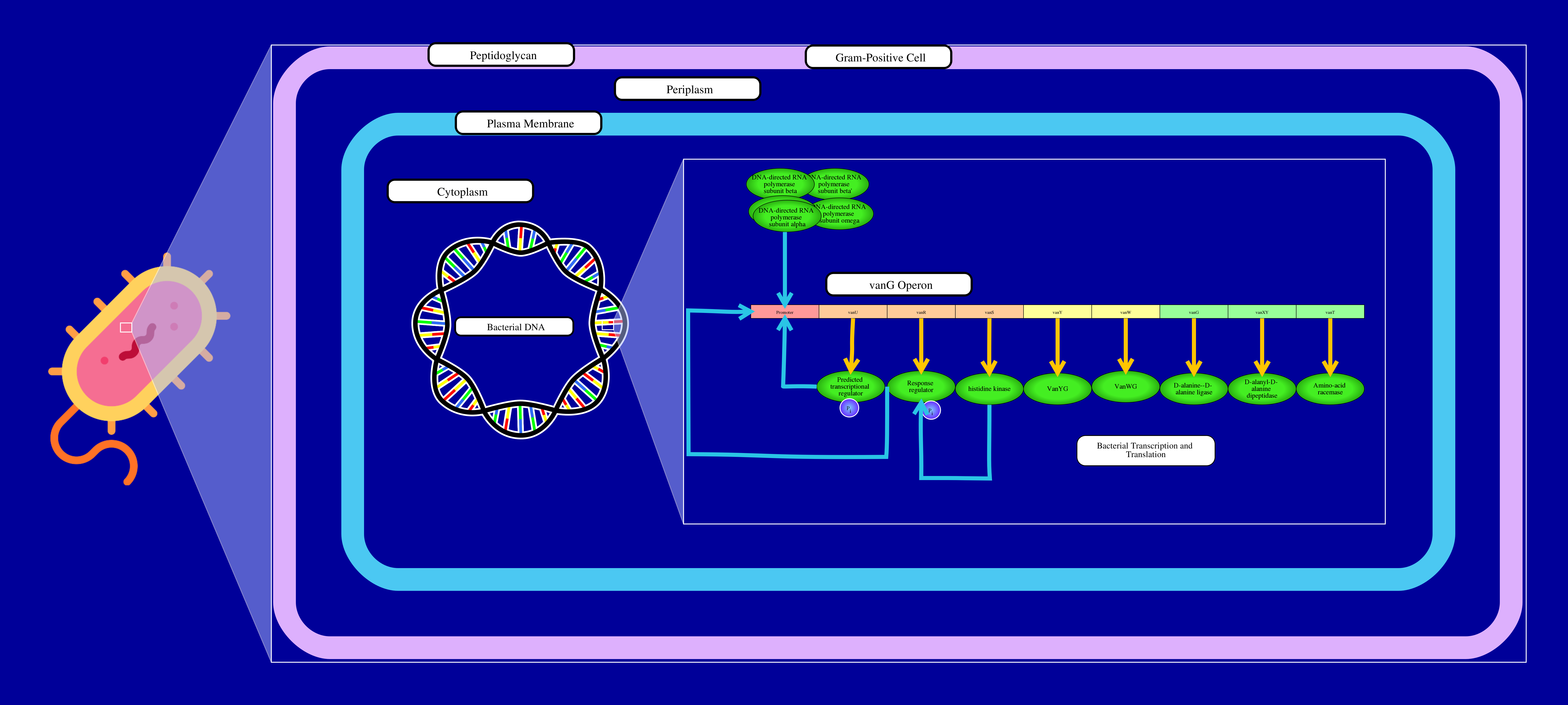 The VanG-type vancomycin resistance pathway enables enterococcal bacteria to resist the action of the glycopeptide antibiotic vancomycin. This pathway involves a series of genes organized in an the VanG operon, which encodes enzymes and regulatory proteins that alter the bacterial cell wall, making it resistant to vancomycin. The operon is made up of 8 genes which can be divided into regulatory (vanU, vanR and vanS), resistance (vanG, vanT and vanXY) and accessory(vanY and vanW). The vanR gene is a response regulator that is part of a two-component regulatory system and activates transcription once phosphorylated by histidine kinase that is encoded by vanS, after detecting vancomycin. Similar to vanR, vanU encodes for a transcriptional activator though not the primary activator. vanG gene encodes a D-Ala-D-Ser ligase, which synthesizes D-Ala-D-Ser (D-alanine-D-serine) dipeptides instead of the usual D-Ala-D-Ala in the peptidoglycan precursor, which has reduced affinity for vancomycin and is added to UDP-MurNAc-tripeptide.vanXY gene encodes a bifunctional D,D-dipeptidase and D,D-carboxypeptidase that hydrolyzes any remaining D-Ala-D-Ala dipeptides and removes D-alanine from peptidoglycan precursors (UDP-MurNAc-pentapeptide[d-Ala]), ensuring that only D-Ala-D-Ser is incorporated into the cell wall. The accessory gene vanY, encodes a D,D-carboxypeptidase that, ensures that only D-Ala-D-Lac is used in cell wall synthesis by eliminating the terminal D-alanine residue from peptidoglycan precursorswhile vanW's function is unknown.
