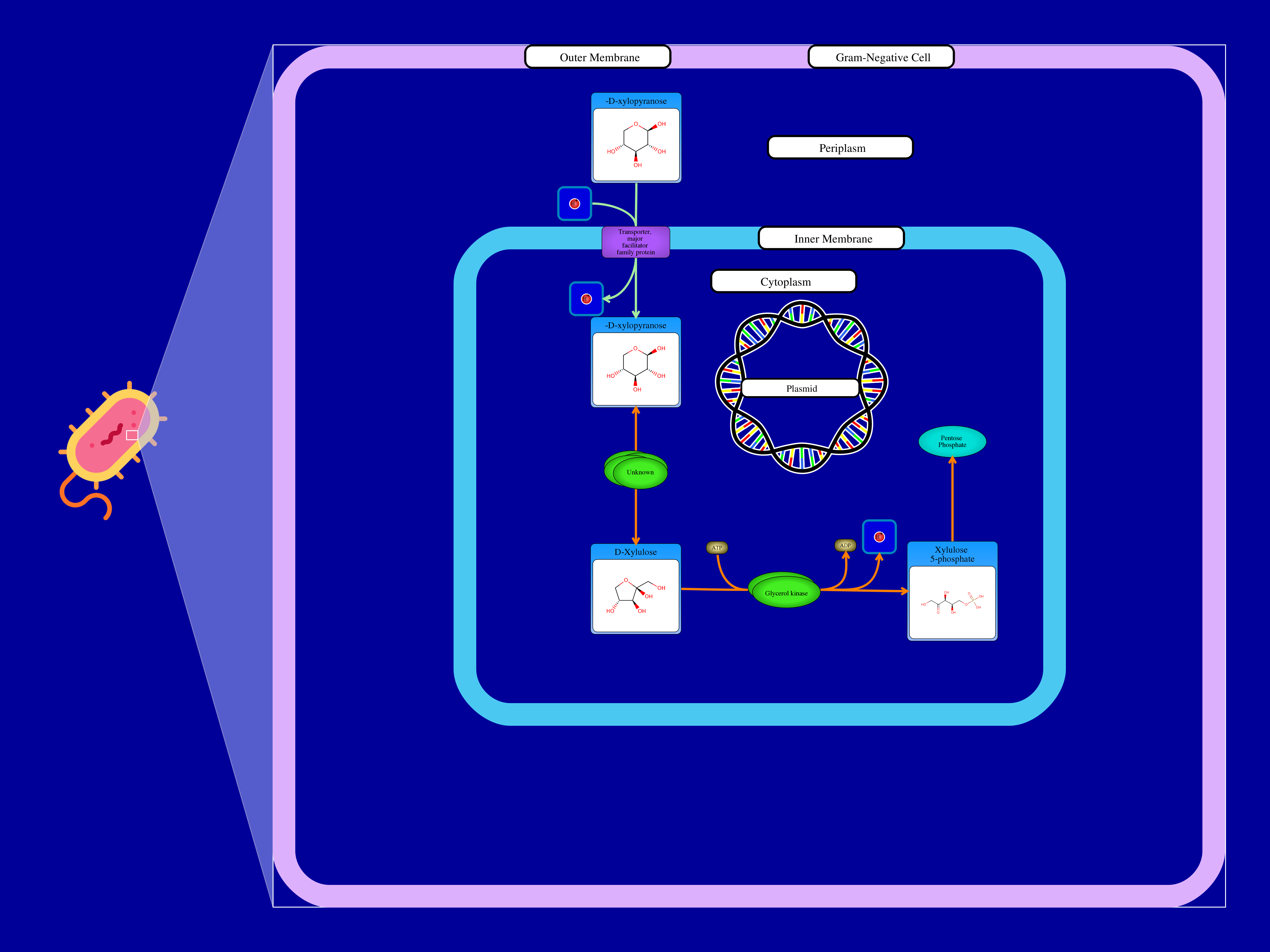 Escherichia coli can utilize D-xylose as the sole source of carbon and energy for the cell. A low-affinity proton motive force or a high-affinity ATP-driven (ABC) transport system brings unphosphorylated D-xylose into the cell. Following entry, D-xylose is converted to D-xylulose by an isomerase and then converted to the pentose phosphate pathway intermediate, D-xylulose 5-phosphate via a kinase. D-xylulose 5-phosphate can then enter pathways of metabolism to meet the cells needs.