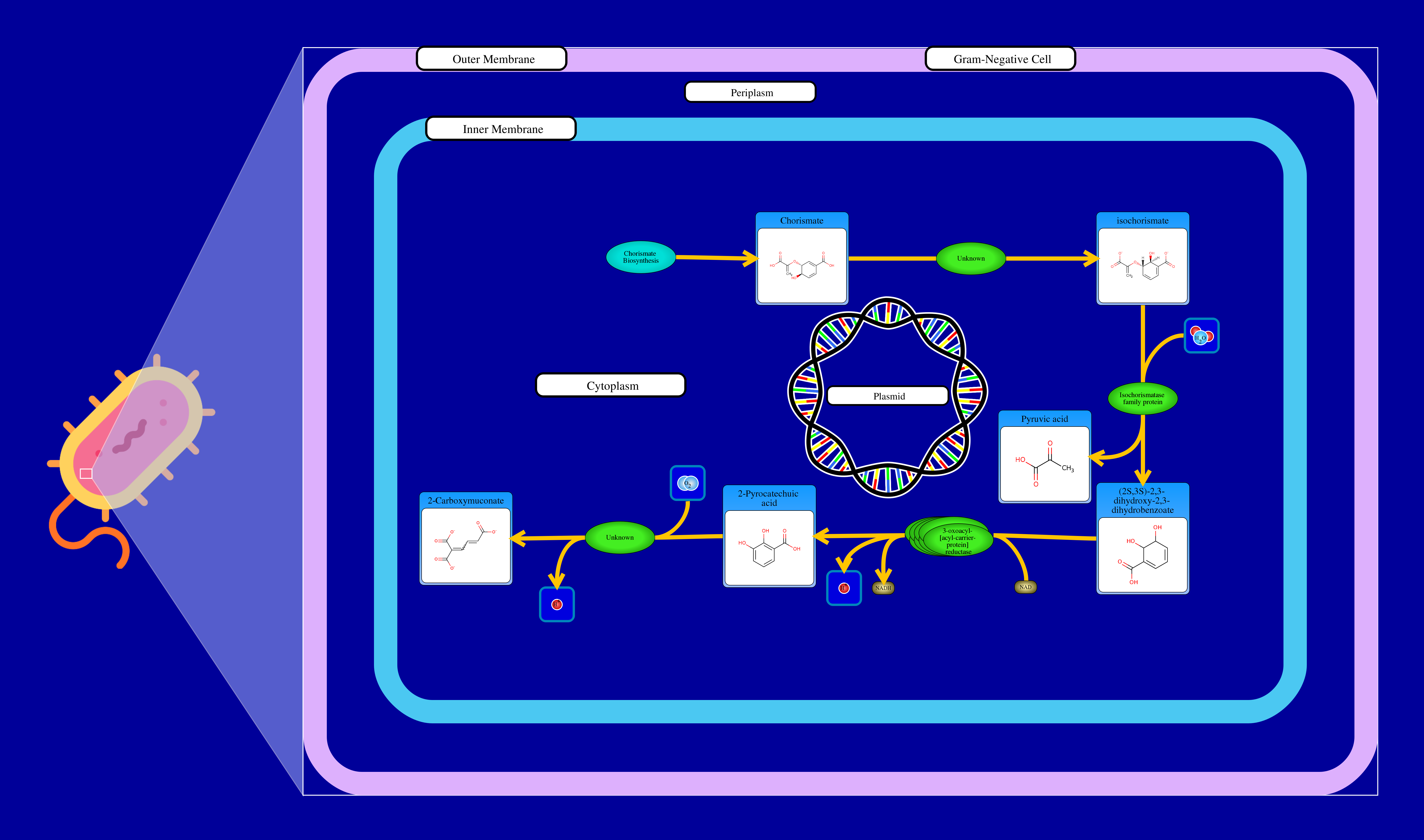 In this pathway, chorismate, which is the product of the chorismate biosynthesis pathway, is converted to isochorismate in a reaction catalyzed by isochorismate synthase. Following this, a water molecule is added to isochorismate by isochorismatase, which then removes a pyruvic acid molecule as a byproduct, and forms (2S, 3S)-2,3-dihydroxy-2,3-dihydrobenzoate. Finally, 2,3-dihydro-2,3-dihydroxybenzoate dehydrogenase catalyzes the dehydrogenation of (2S, 3S)-2,3-dihydroxy-2,3-dihydrobenzoate into 2-pyrocatechuric acid (2,3-dihydroxybenzoate), using NAD as a cofactor. 2-Pyrocatechuric acid can then be used as a part of the enterobactin biosynthesis pathway, or it can be converted to 2-carboxymuconate by blue copper oxidase cueO.