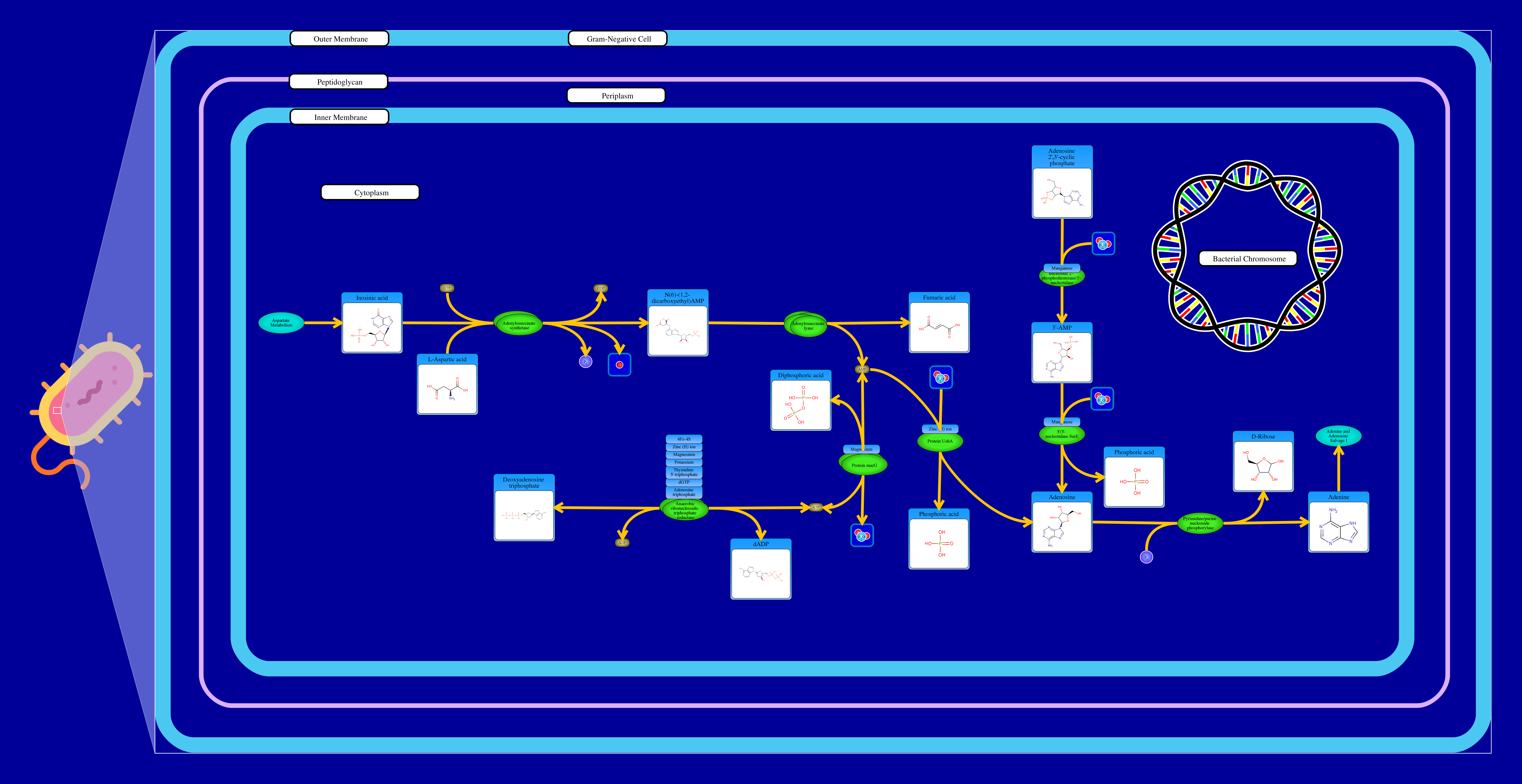 Adenine ribonucleotide biosynthesis is an essential pathway in bacteria for producing adenine-containing nucleotides, which are vital for DNA, RNA, and energy metabolism. This process originates from the **de novo purine biosynthesis pathway**, where inosine monophosphate (IMP) serves as the central precursor for adenine nucleotide formation. To produce adenine ribonucleotides, IMP undergoes a two-step conversion. First, IMP is aminated by adenylosuccinate synthetase, using aspartate and GTP as substrates, to form adenylosuccinate. In the second step, adenylosuccinate lyase cleaves adenylosuccinate to yield AMP (adenosine monophosphate) and fumarate as a byproduct. AMP can subsequently be phosphorylated by kinases to produce ADP and ATP, which are essential for cellular energy transfer and signaling processes. ATP also serves as a cofactor in numerous enzymatic reactions and as a building block for RNA synthesis. This pathway is tightly regulated to maintain adenine nucleotide homeostasis, ensuring bacterial growth, replication, and survival under varying metabolic conditions.