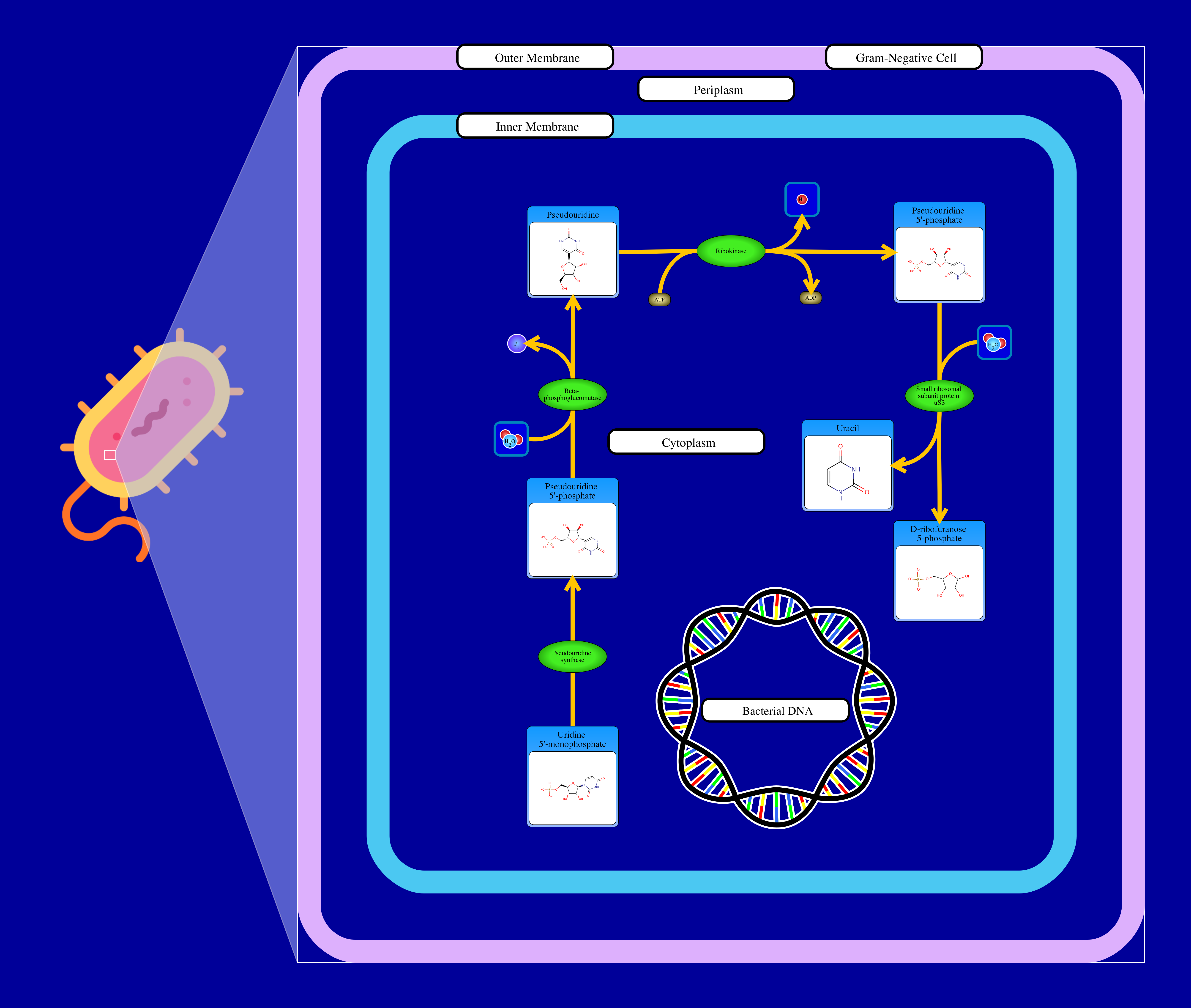 Pseudouridine is phosphorylated by interacting with atp and a psuK resulting in the release of an ADP, a hydrogen ion and a pseudouridine 5'-phosphate. The latter compound then reacts with water through a pseudouridine 5'-phosphate glycosidase resulting in the release of a uracil and D-ribofuranose 5-phosphate