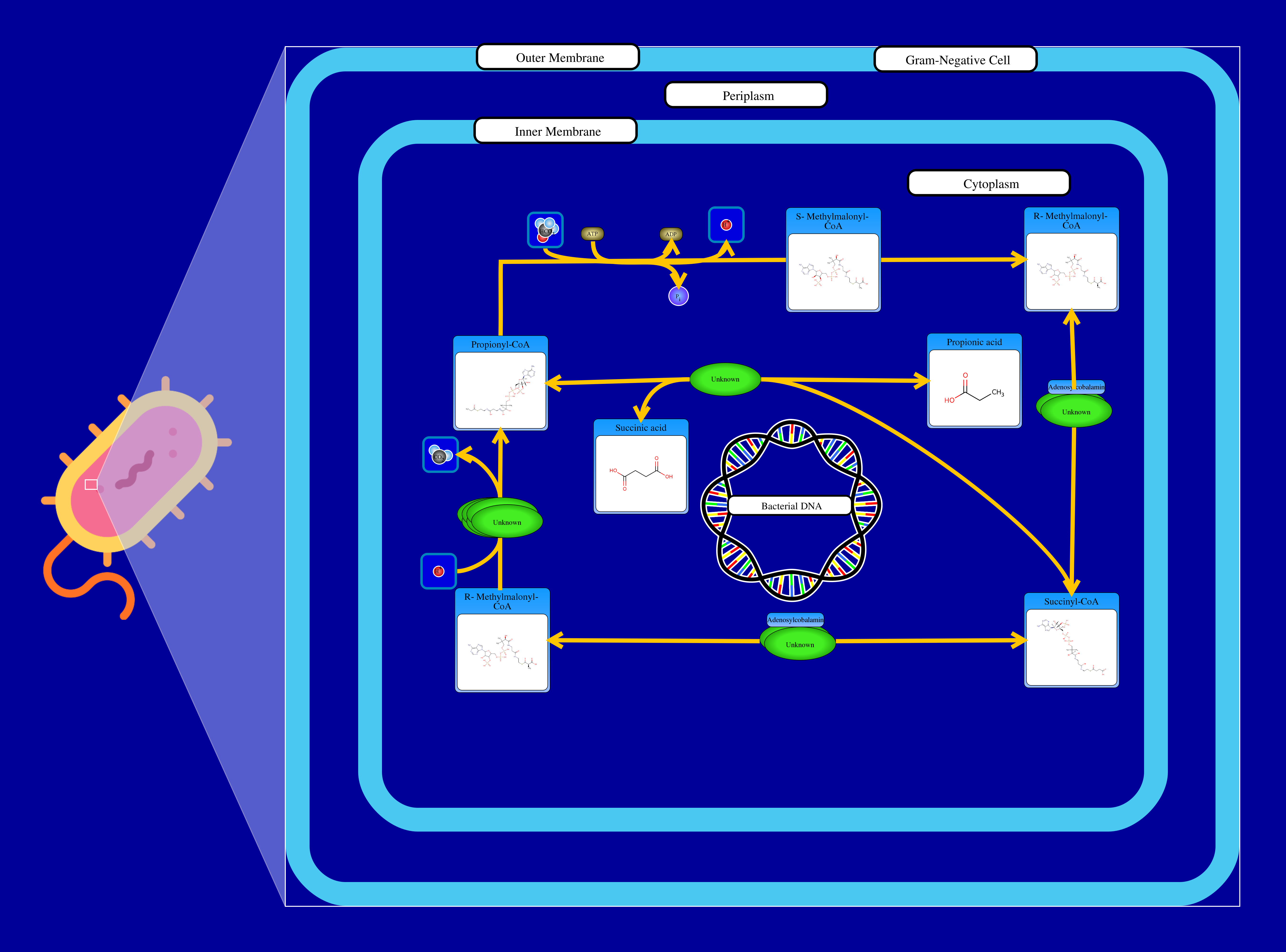 The degradation of propanoyl-CoA starts with propanoyl-CoA undergoing a decarboxylase reaction by reacting with hydrogen carbonate and ATP resulting in the release of a phosphate, an ADP, a hydrogen ion and an S-methylmalonyl-CoA. This compound in turn reacts through an epimerase reaction resulting in the release of a R-methylmalonyl-CoA. This compound in turn can undergo a reversible reaction through a methylmalonyl-CoA mutase resulting in the release of a succinyl-CoA. This compound can be converted back to R-methylmalonyl-CoA through a methylmalonyl-CoA mutase.