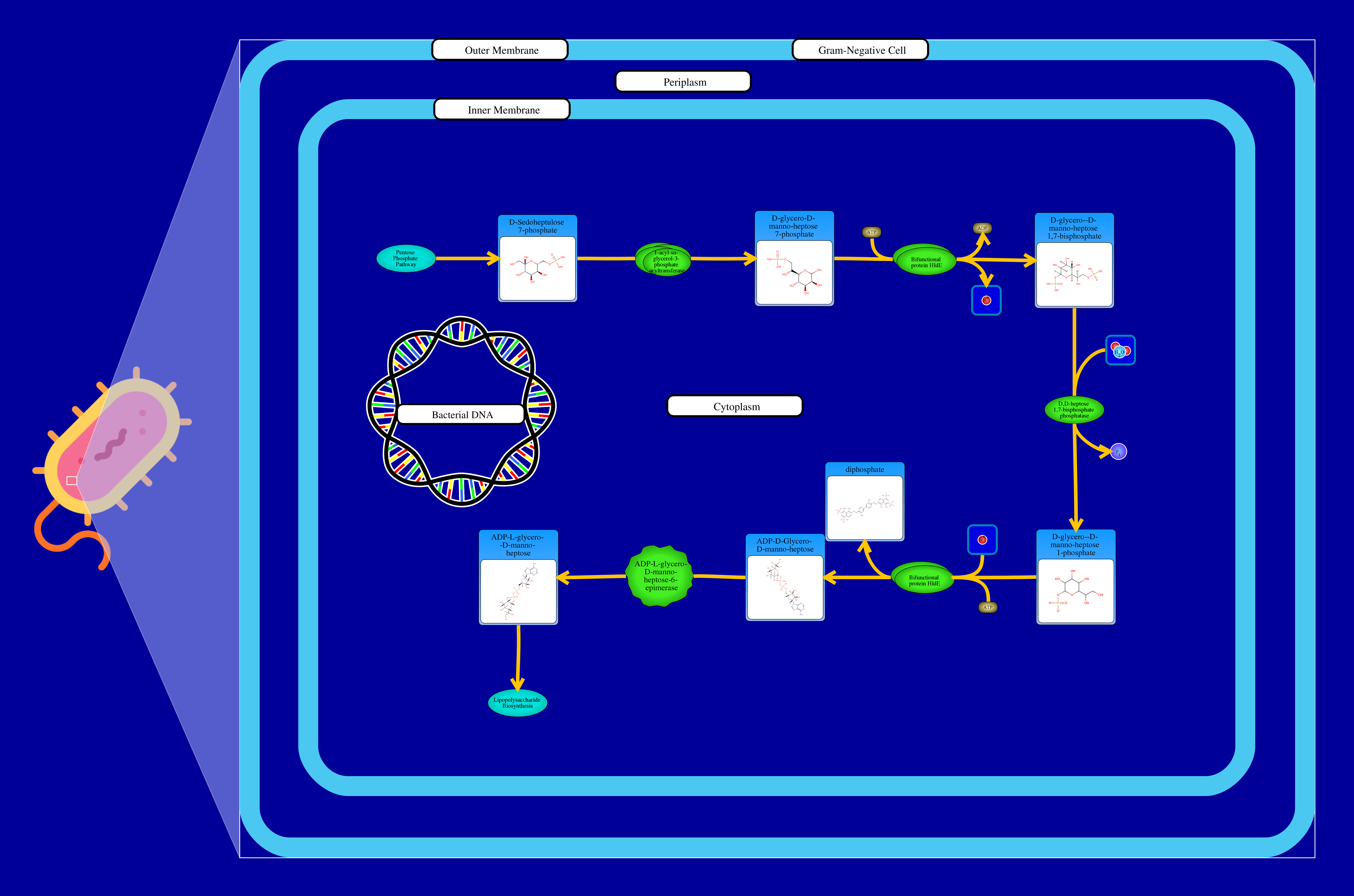 ADP-L-glycero-β-D-manno-heptose is a precursor for the inner core lipopolysaccharide (LPS), which is the outer membrane of Gram-negative bacteria. LPS is consisted of lipid A, a core oligosaccharide, and an O-specific polysaccharide (O antigen). This biosynthesis pathway starts with catalyzation of D-sedoheptulose 7-phosphate that produced from pentose phosphate pathway to form D-glycero-D-manno-heptose 7-phosphate by lysophospholipid acyltransferase. D-glycero-D-manno-heptose 7-phosphate later undergoes catalyze to form D-glycero-β-D-manno-heptose 1,7-bisphosphate by fused heptose 7-phosphate kinase (also known as heptose 1-phosphate adenyltransferase) that powered by ATP. D-glycero-β-D-manno-heptose 1,7-bisphosphate will go through hydrolysis by D,D-heptose 1,7-bisphosphate phosphatase to form D-glycero-β-D-manno-heptose 1-phosphate and a phosphate. D-glycero-β-D-manno-heptose 1-phosphate will form ADP-D-Glycero-D-manno-heptose and diphosphate, and eventually ADP-D-Glycero-D-manno-heptose will be biotransformed to ADP-L-glycero-β-D-manno-heptose as the end product of this pathway by ADP-L-glycero-D-mannoheptose-6-epimerase.