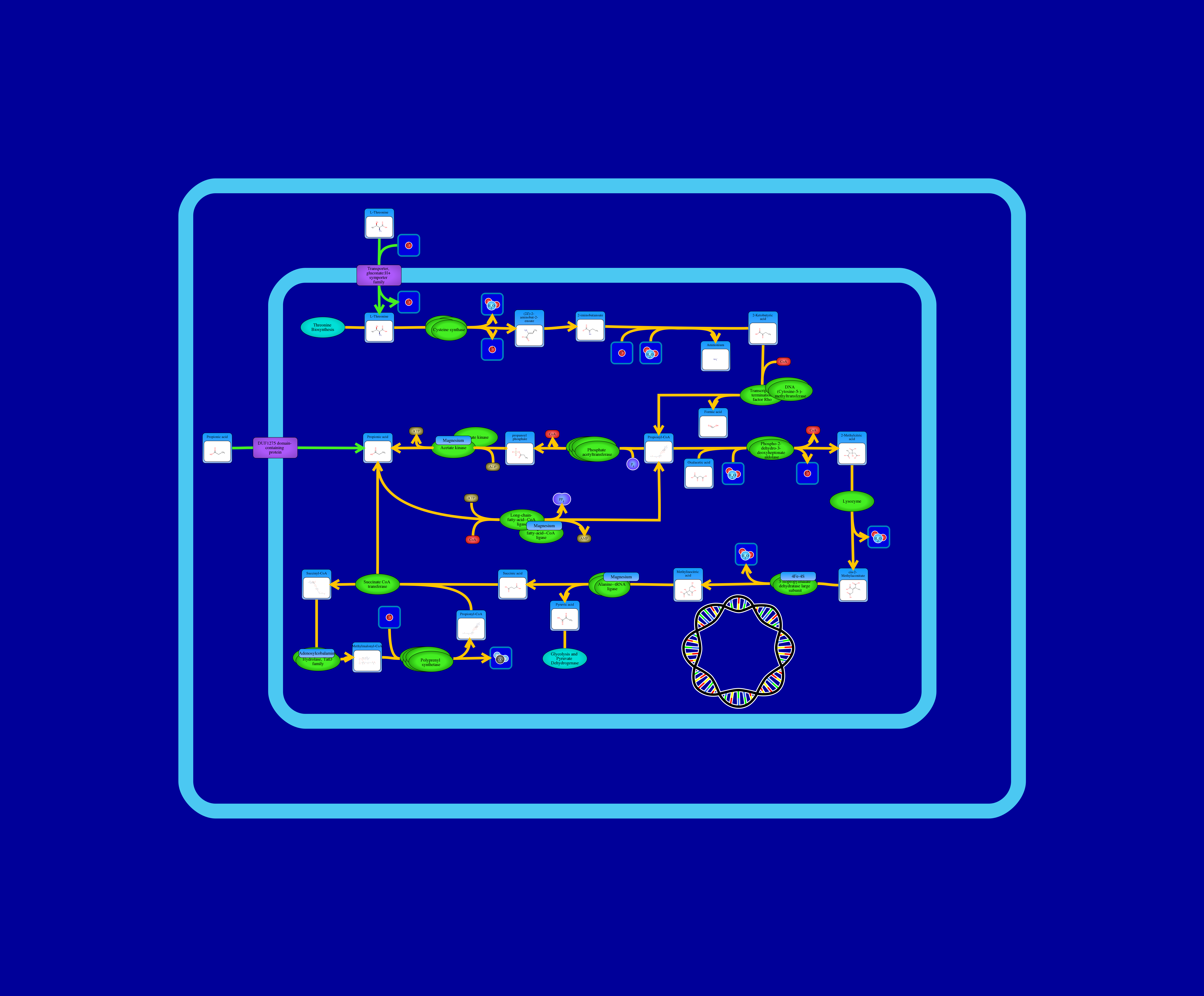 Propionyl-CoA can then be processed either into a 2-methylcitric acid or into a propanoyl phosphate. Propionyl-CoA interacts with oxalacetic acid and a water molecule through a 2-methylcitrate synthase resulting in a hydrogen ion, a CoA and a 2-Methylcitric acid.The latter compound is dehydrated through a 2-methylcitrate dehydratase resulting in a water molecule and cis-2-methylaconitate. The latter compound is then dehydrated by a bifunctional aconitate hydratase 2 and 2-methylisocitrate dehydratase resulting in a water molecule and methylisocitric acid. The latter compound is then processed by 2-methylisocitrate lyase resulting in a release of succinic acid and pyruvic acid. Succinic acid can then interact with a propionyl-CoA through a propionyl-CoA:succinate CoA transferase resulting in a propionic acid and a succinyl CoA. Succinyl-CoA is then isomerized through a methylmalonyl-CoA mutase resulting in a methylmalonyl-CoA. This compound is then decarboxylated through a methylmalonyl-CoA decarboxylase resulting in a release of Carbon dioxide and Propionyl-CoA. Propionyl-CoA interacts with a phosphate through a phosphate acetyltransferase / phosphate propionyltransferase resulting in a CoA and a propanoyl phosphate. Propionyl-CoA can react with a phosphate through a phosphate acetyltransferase / phosphate propionyltransferase resulting in a CoA and a propanoyl phosphate. The latter compound is then dephosphorylated through a ADP driven acetate kinase/propionate kinase protein complex resulting in an ATP and Propionic acid. Propionic acid can be processed by a reaction with CoA through a ATP-driven propionyl-CoA synthetase resulting in a pyrophosphate, an AMP and a propionyl-CoA.
