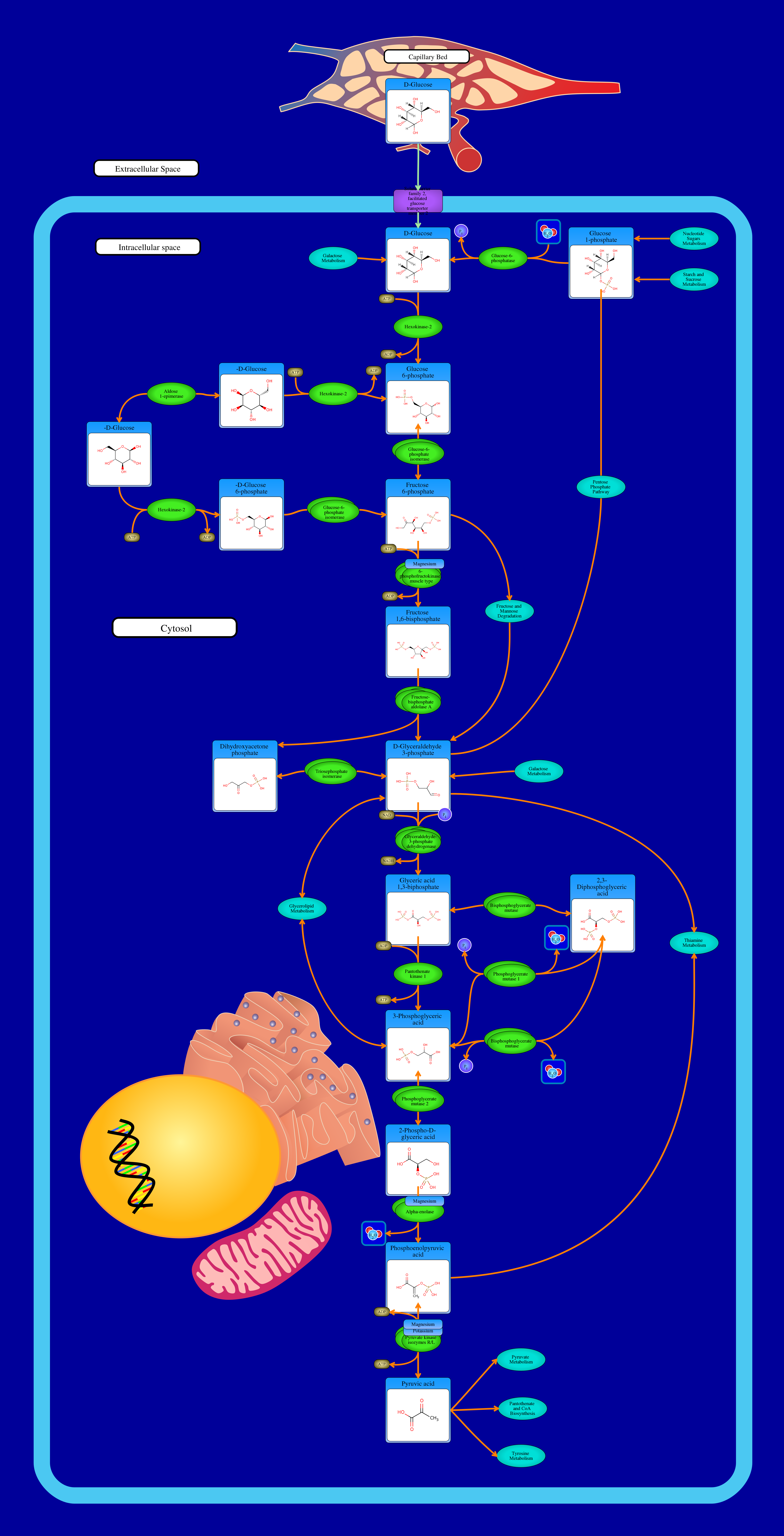 Glycolysis is a metabolic pathway with sequence of ten reactions involving ten intermediate compounds that converts glucose to pyruvate. Glycolysis release free energy for forming high energy compound such as ATP and NADH. Glycolysis is consisted of two phases, which one of them is chemical priming phase and second phase is energy-yielding phase. As the starting compound of chemical priming phase, D-glucose can be obtained from galactose metabolism or imported by monosaccharide-sensing protein 1 from outside of cell. D-Glucose is catalyzed by probable hexokinase-like 2 protein to form glucose 6-phosphate which is powered by ATP. Glucose 6-phosphate transformed to fructose 6-phosphate by glucose-6-phosphate isomerase, which the later compound will be converted to fructose 1,6-bisphosphate, which is the last reaction of chemical priming phase by 6-phosphofructokinase with cofactor magnesium, and it is also powered by ATP. Before entering the second phase, aldolase catalyzing the hydrolysis of F1,6BP into dihydroxyacetone phosphate and glyceraldehyde 3-phosphate. Dihydroxyacetone phosphate and glyceraldehyde 3-phosphate can convert to each other bidirectionally by facilitation of triosephosphate isomerase. The second phase of glycolysis is yielding-energy phase that produce ATP and NADH. At the first step, D-glyceraldehyde 3-phosphate is catalyzed to glyceric acid 1,3-biphosphate by glyceraldehyde-3-phosphate dehydrogenase with NAD, which also generate NADH. ATP is generated through the reaction that convert glyceric acid 1,3-biphosphate to 3-phosphoglyceric acid. Phosphoglycerate mutase 2 catalyze 3-phosphoglyceric acid to 2-Phospho-D-glyceric acid, and alpha-enolase with cofactor magnesium catalyzes 2-Phospho-D-glyceric acid to phosphoenolpyruvic acid. Eventually, plastidial pyruvate kinase 4 converts phosphoenolpyruvic acid to pyruvate with cofactor magnesium and potassium and ADP. Pyruvate will undergo pyruvate metabolism, tyrosine metabolism and pantothenate and CoA biosynthesis.