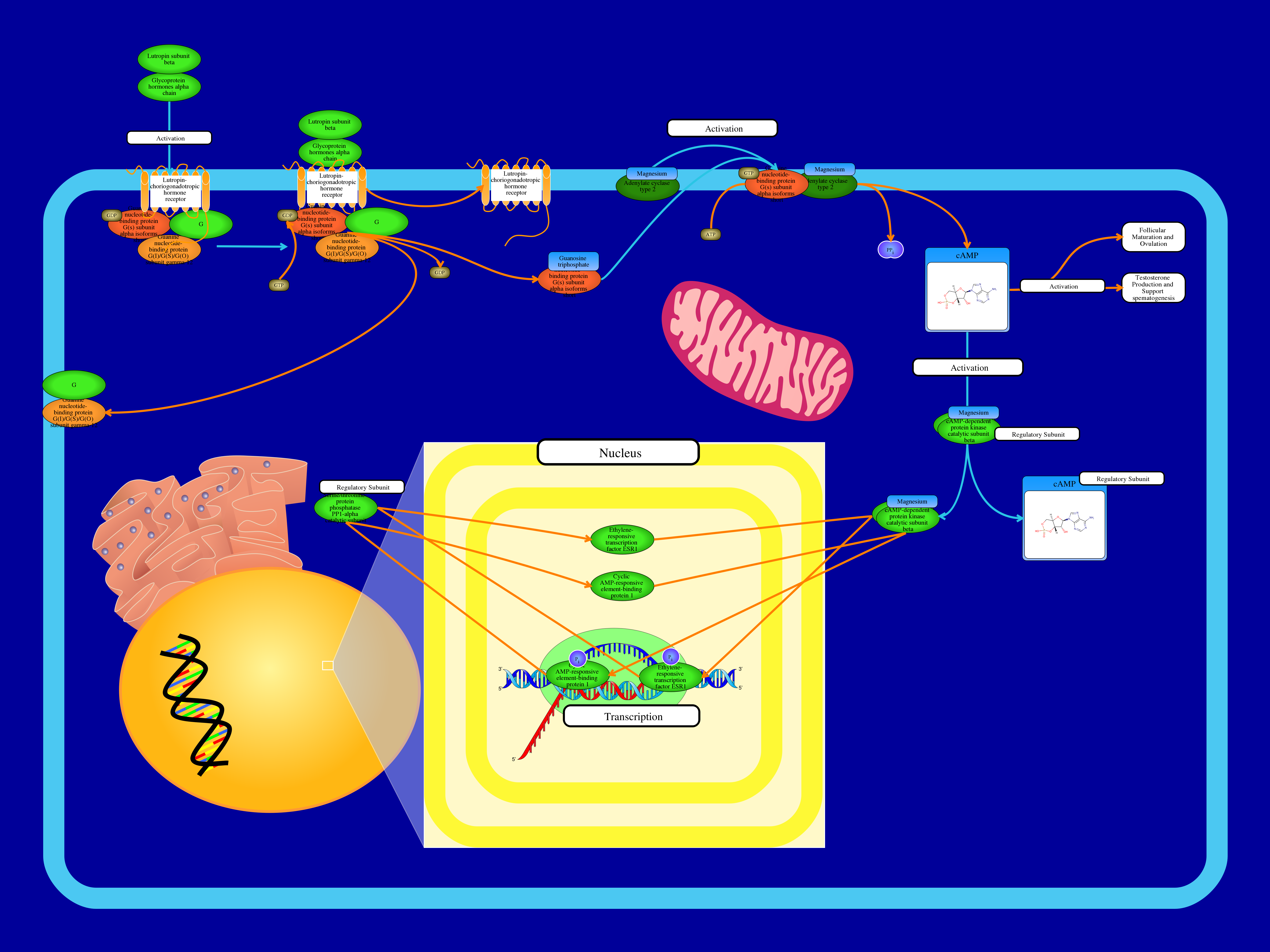 The luteinizing hormone/choriogonadotropin receptor (LHCGR) is a transmembrane G protein-coupled receptor located most prominently in the ovary and testis but also found in organs such as the uterus, breasts, prostate, and seminal vesicles. As its name suggests, the receptor is activated by both luteinizing hormone (LH) and chorionic gonadotropins (e.g. hCG) and plays an important role in the regulation of reproduction. In the ovaries, activation of LHCGR by follicle-stimulating hormone (FSH) leads to follicular maturation and ovulation. In the testis, LHCGR activation is essential for testosterone production and spermatogenesis. The LHCGR receptor activates G(s) proteins which leads to the activation of adenylyl cyclase and produces the secondary messenger cAMP. cAMP then activates protein kinase A (PKA) which phosphorylates downstream effectors that lead to a specific cellular response. Specifically, LHCGR upregulates the mitochondrial enzyme P450scc (cholesterol side-chain cleavage enzyme) which increases the production of steroid hormones such as testosterone and estrogen.