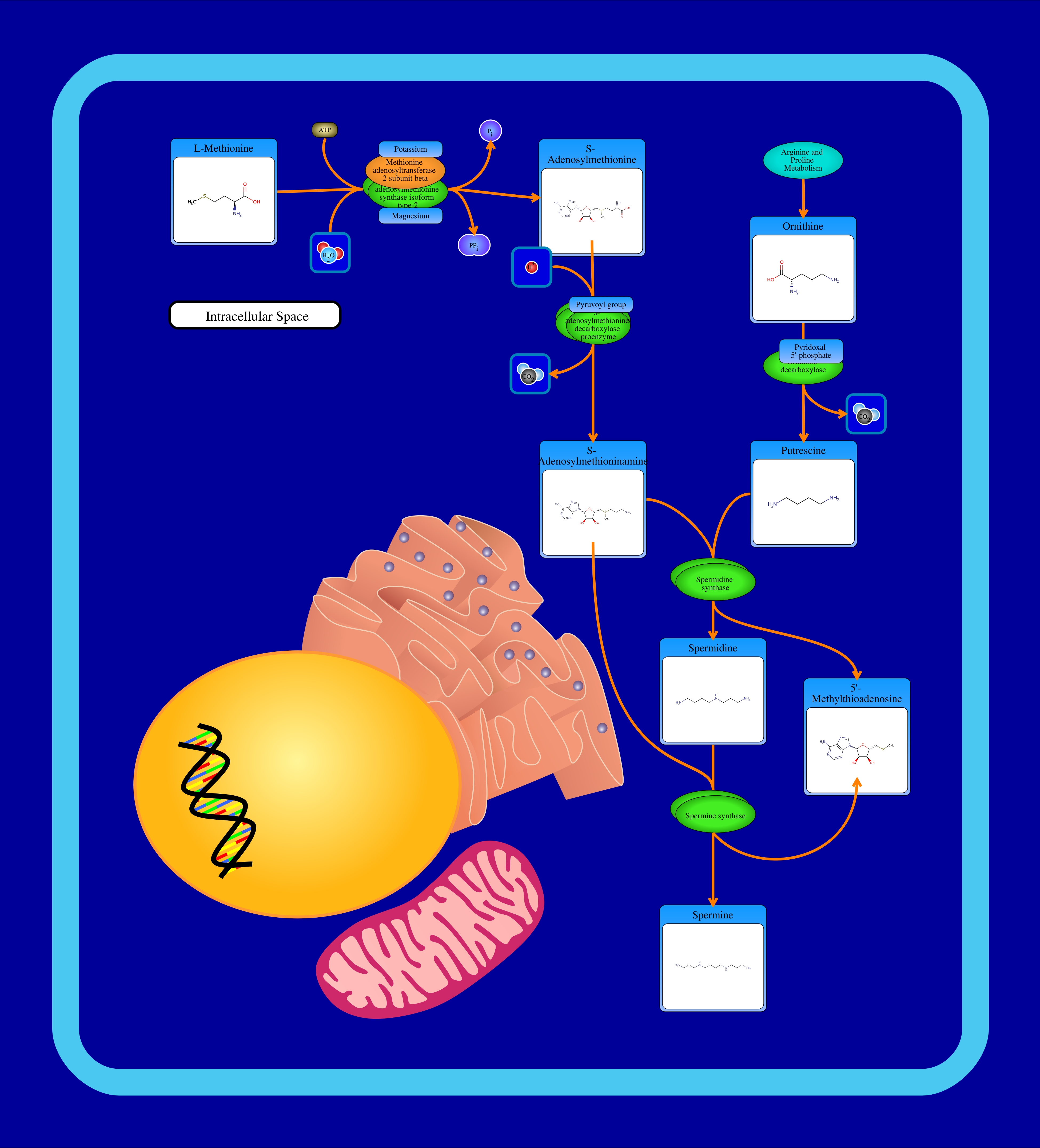 S- adenosylmethionine synthase isoform type-2 Methionine adenosyltransferase 2 subunit beta Spermidine synthase Spermine synthase Ornithine decarboxylase S- adenosylmethionine decarboxylase proenzyme Ornithine ATP L-Methionine H2O S- Adenosylmethionine Pi PPi S- Adenosylmethioninamine Putrescine 5'- Methylthioadenosine Spermidine Spermine CO2 H+ CO2 Magnesium Potassium Arginine and Proline Metabolism Pyridoxal 5'-phosphate Pyruvoyl group Intracellular Space
